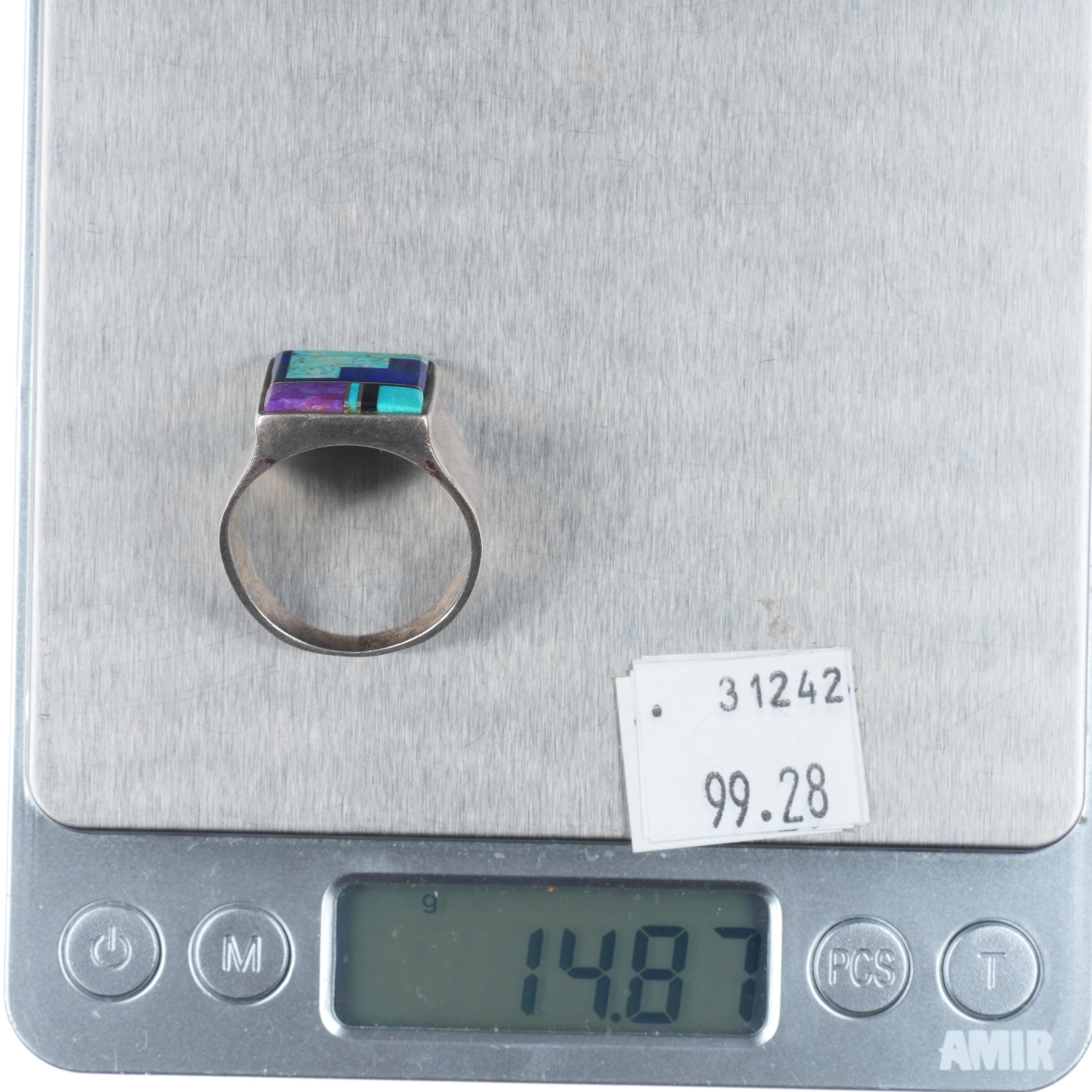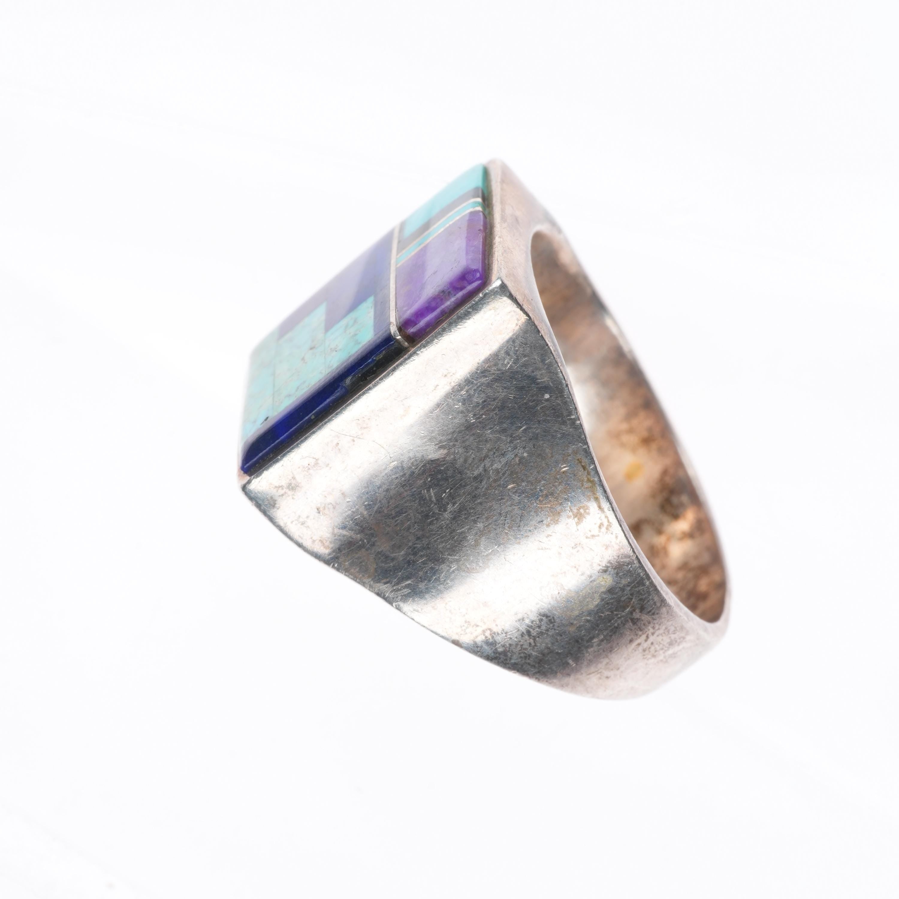 sz12 Vintage Navajo sugilite, turquoise, lapis sterling silver men‘s inlay ring. Tested and guaranteed solid sterling silver. Nice ring from the last quarter of the 20th century. Some expected wear, weight and measurements in pictures. Illegibly signed by artist, TSF shop mark.
