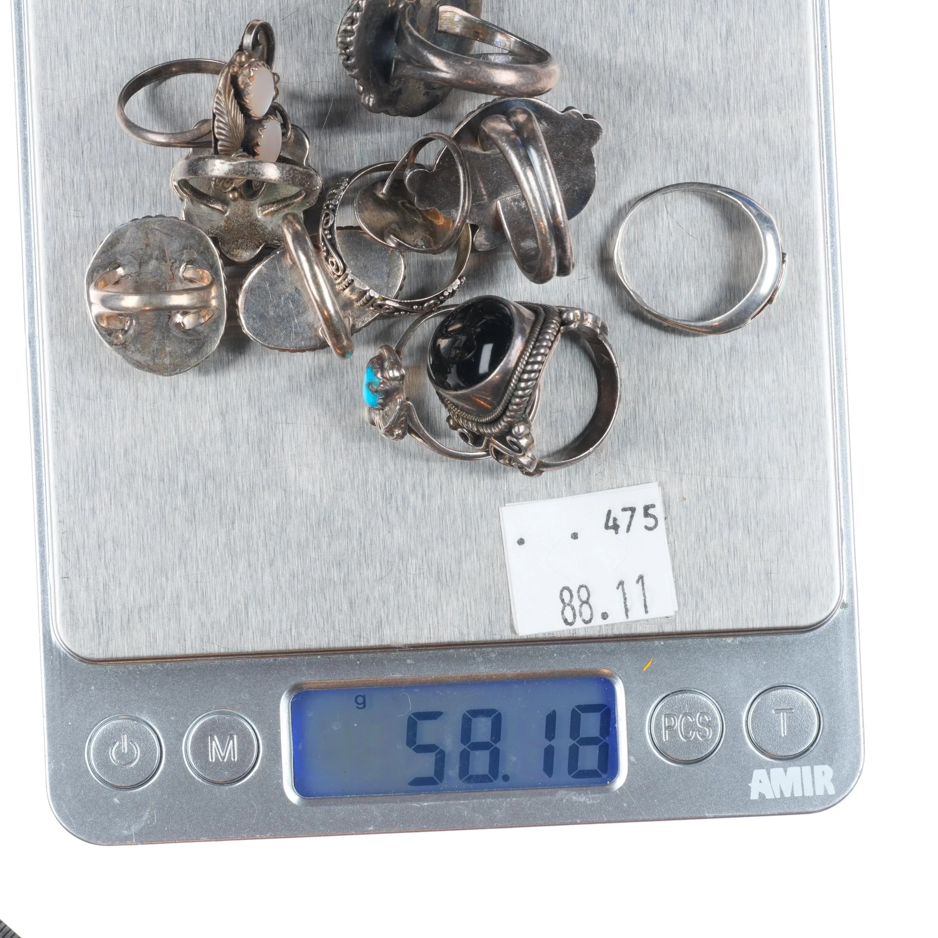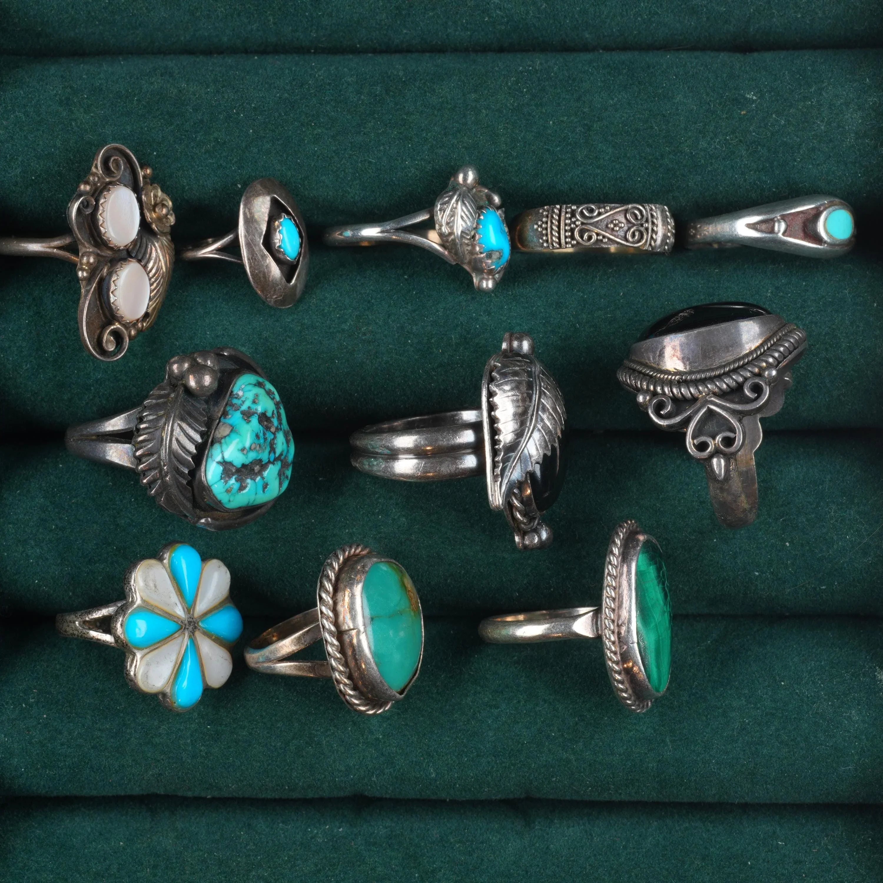 sz2.5-8 Navajo/Zuni/Southwestern sterling silver turquoise/onyx/shell rings lot. Tested and guaranteed solid sterling silver. Selling the 11 rings shown with weight and measurements in pictures, shown on sizers. Age appropriate wear.
