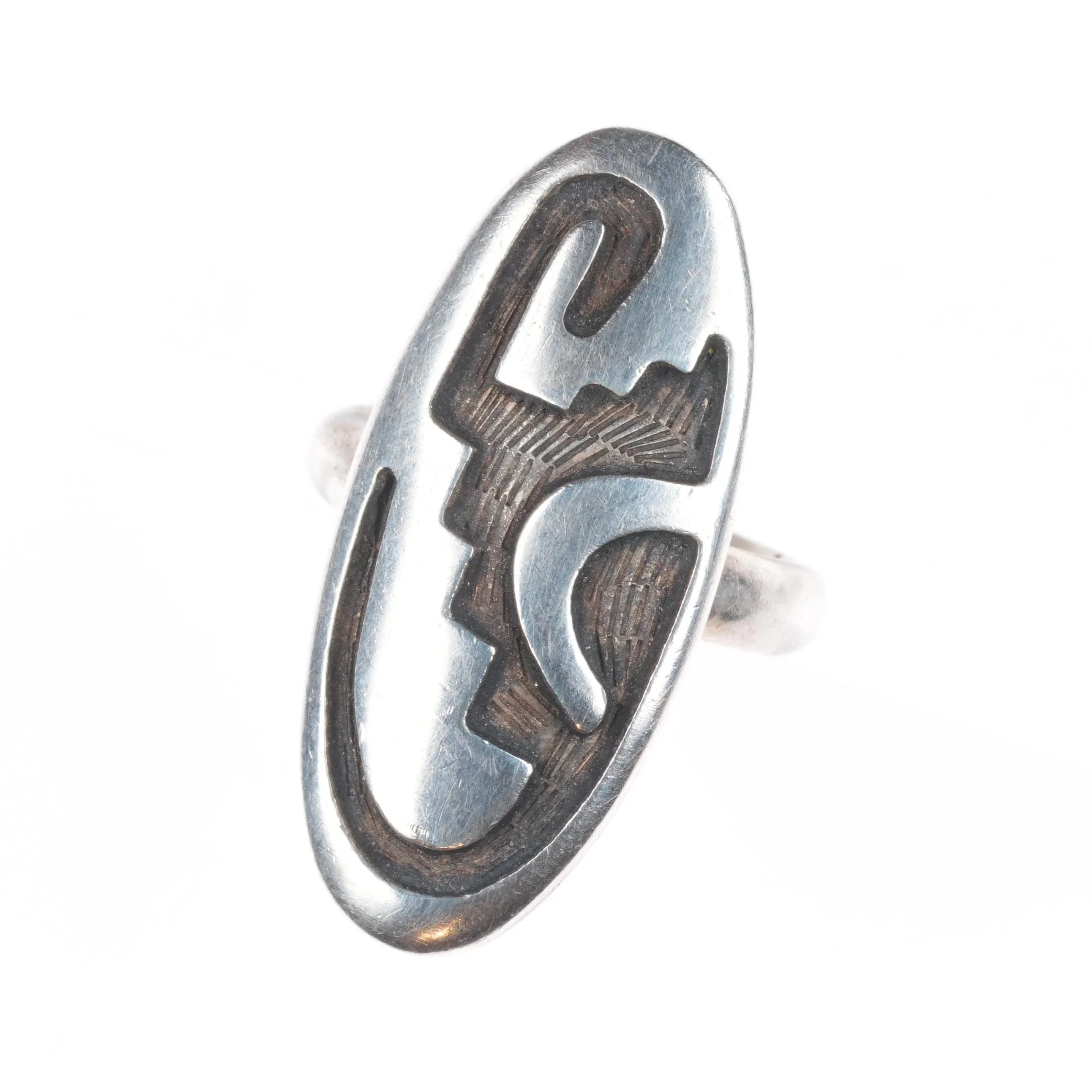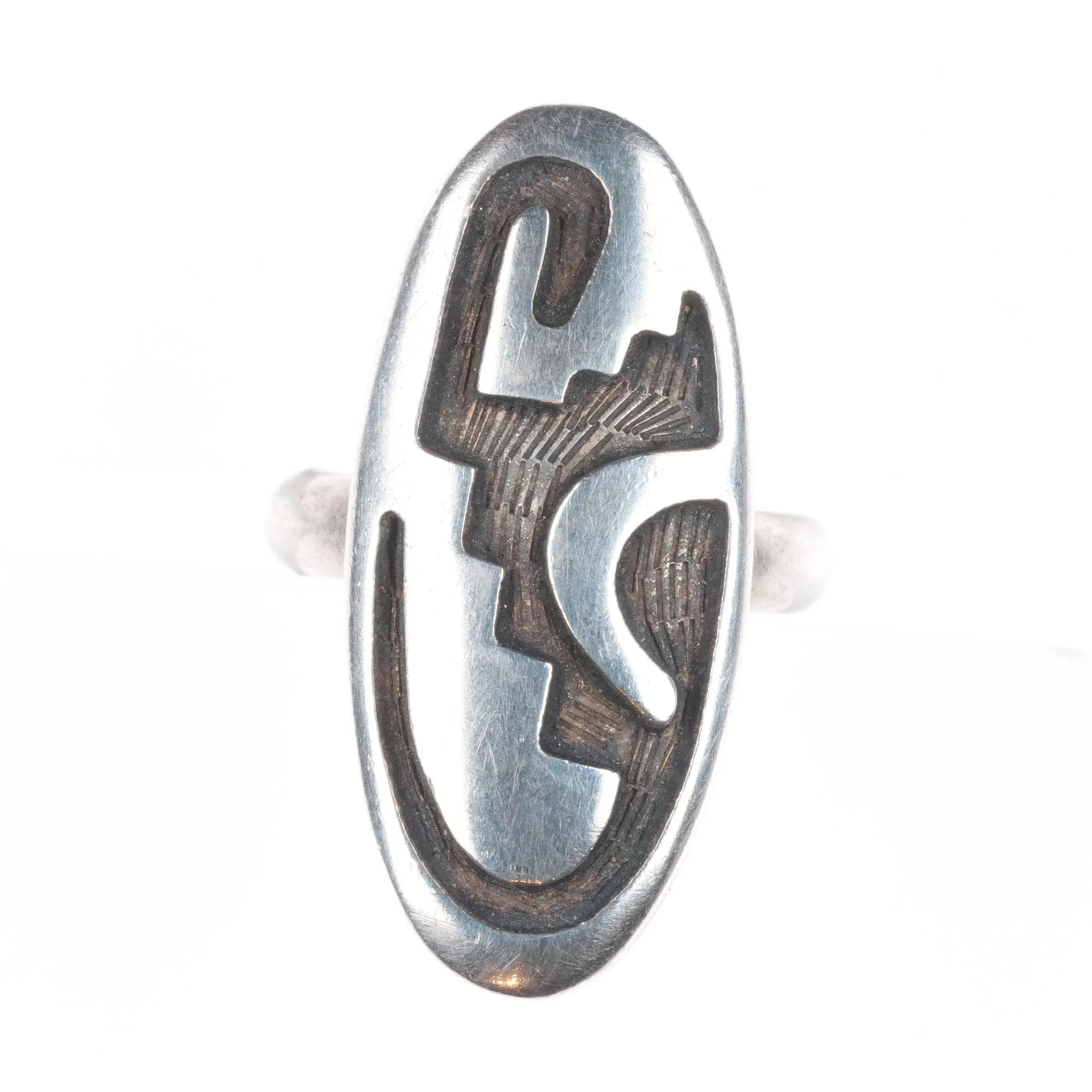 sz3.5 Mitchell Sockyma Hopi overlay ring sterling silver size 3.5. Tested and guaranteed solid sterling silver. Nice ring from the last quarter of the 20th century.