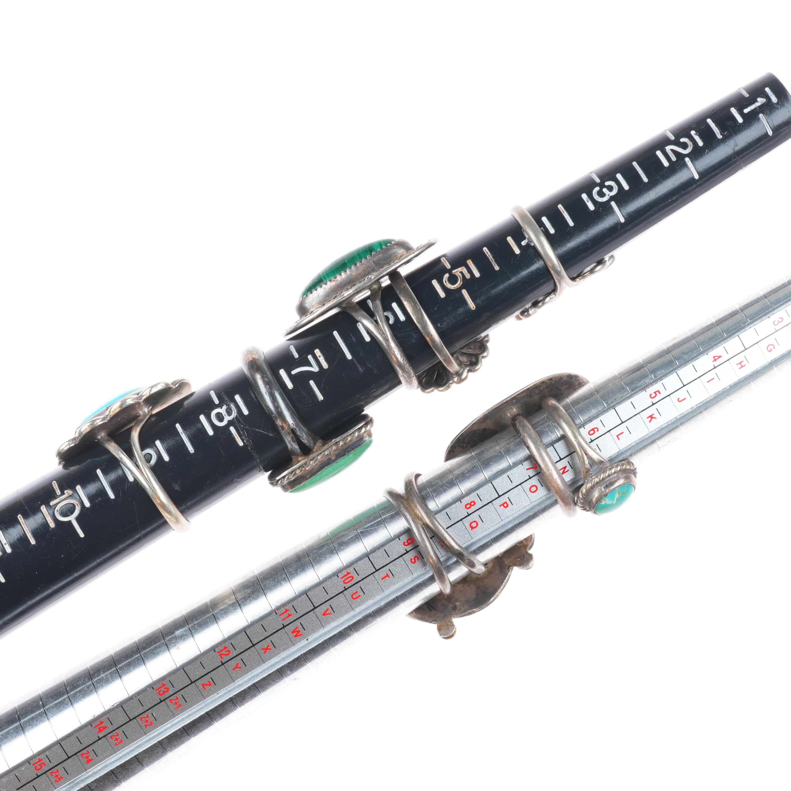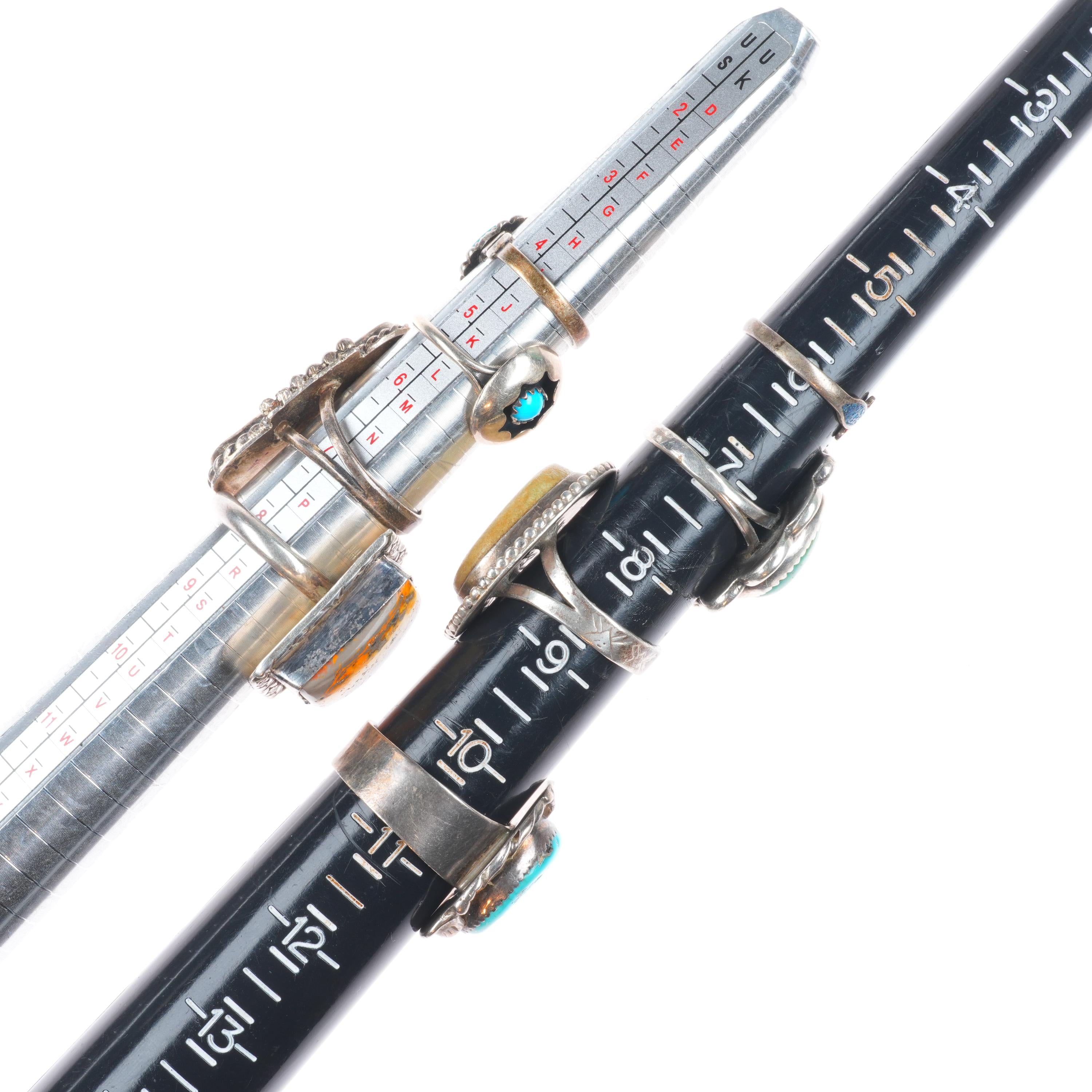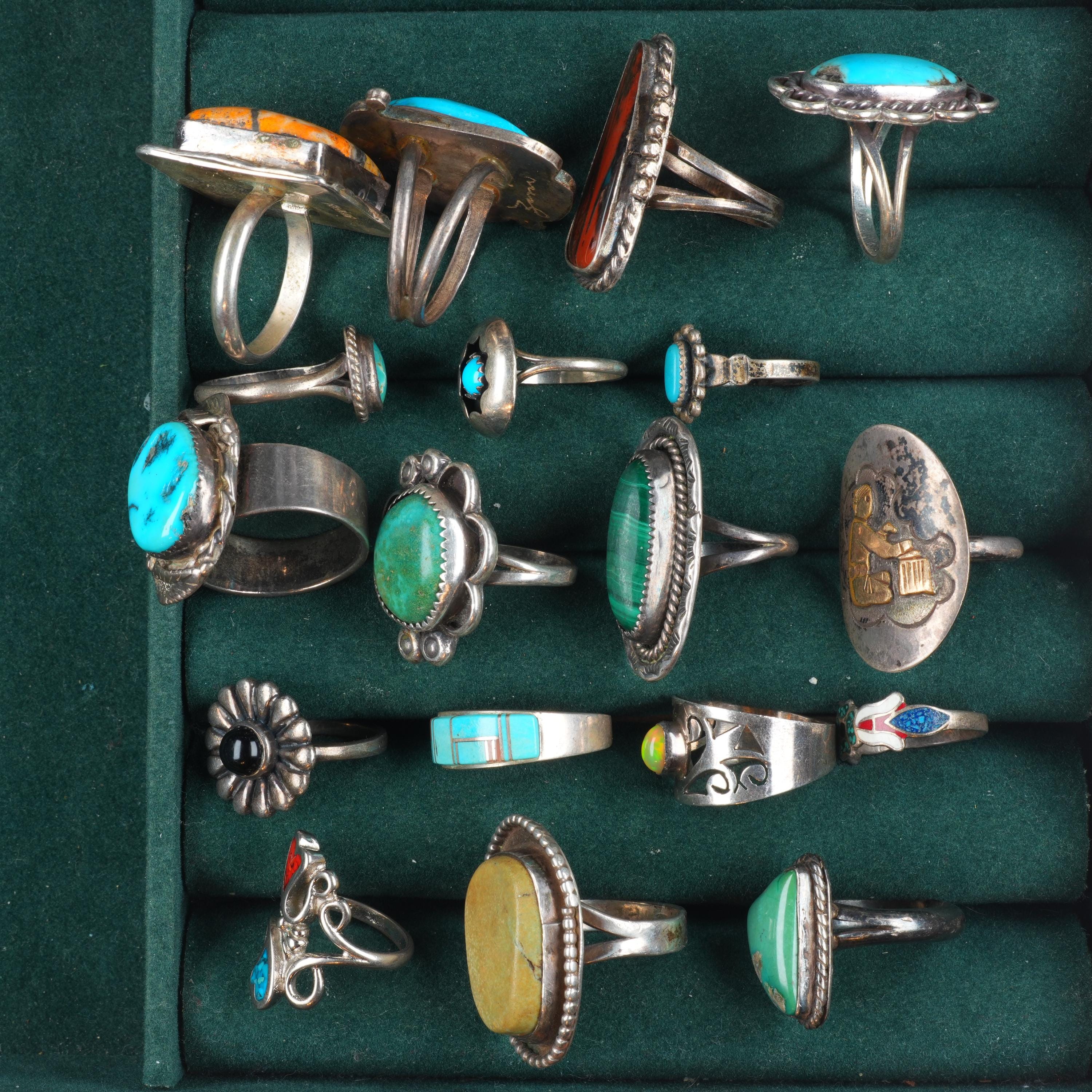 sz4-11 Navajo/Zuni/Southwest sterling silver turquoise Bumblebee jasper ring lot. Tested and guaranteed solid sterling silver. Selling the 18 rings shown with weight and measurements in pictures, shown on sizers. Age appropriate wear. Some marked, some not marked. I am making lots of these lots with my wife photographing and me listing. We are listing in lots due to time limitations, so we are not heavily scrutinizing each ring. Most are going to be Native American made, but there will likely be some southwestern style rings mixed in each lot. Or one two totally unrelated but still sterling. My wife who is making the lots doesn‘t know the difference as she‘s Vietnamese. Please look at the pictures and make up your own mind for condition, etc. There may be dents, cracked stones, etc. I tried to weed out any junk before I gave them to her, but we are in a hurry. Time is the number one consideration when making these lots so there will be some surprises, hopefully more good than bad :)