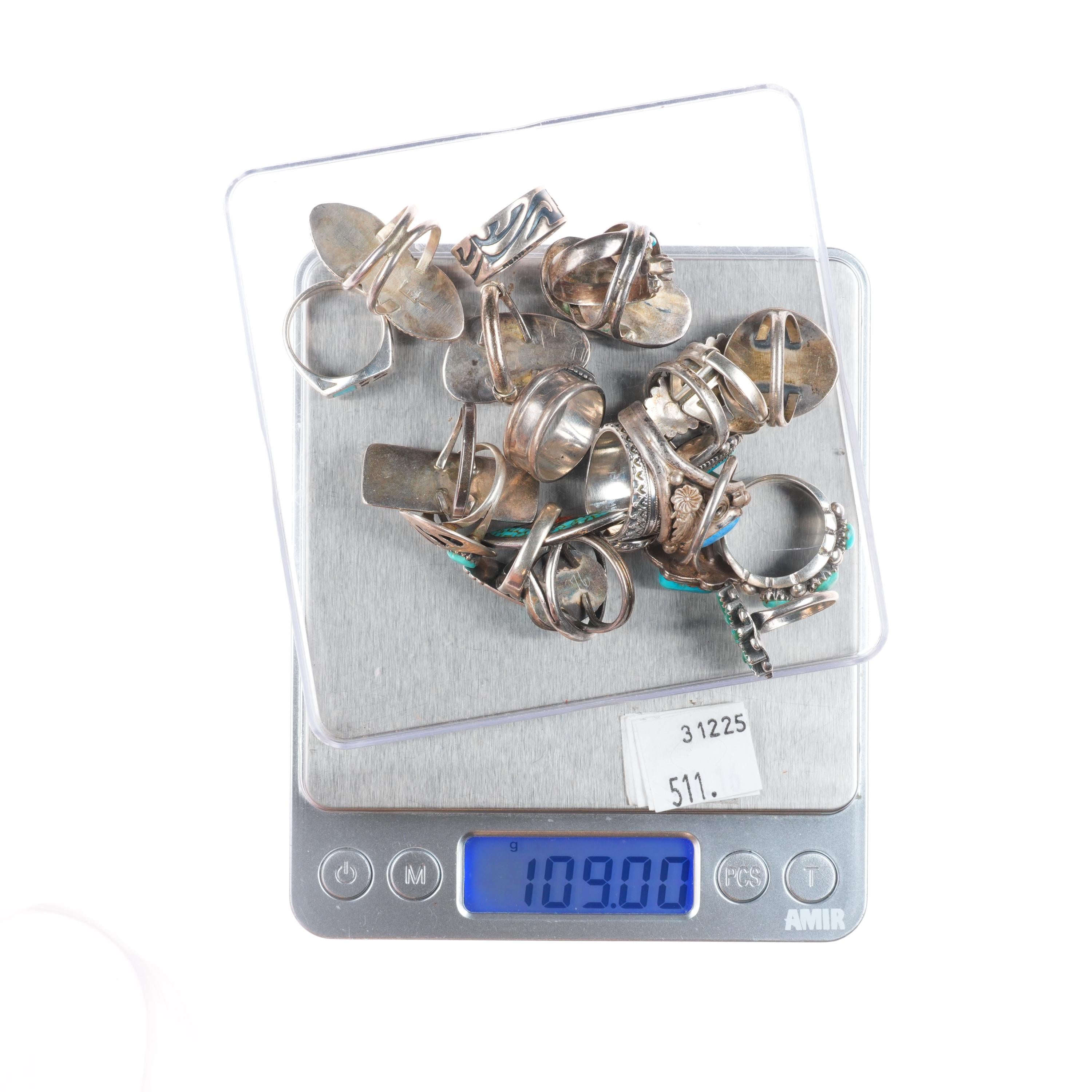 Selling the exact rings shown with weight and measurements in pictures, shown on sizers. Age appropriate wear. Some marked, some not marked. We are making lots of these lots with my wife photographing and me listing. We are listing in lots due to time limitations, so we are not heavily scrutinizing each ring. Most are going to be Native American made, but there will likely be some southwestern style rings mixed in each lot. Or one two totally unrelated but still sterling. My wife who is making the lots doesn‘t know the difference as she‘s Vietnamese. Please look at the pictures and make up your own mind for condition, etc. There may be dents, cracked stones, etc. I tried to weed out any junk before I gave them to her, but we are in a hurry. Time is the number one consideration when making these lots so there will be some surprises, hopefully more good than bad :)