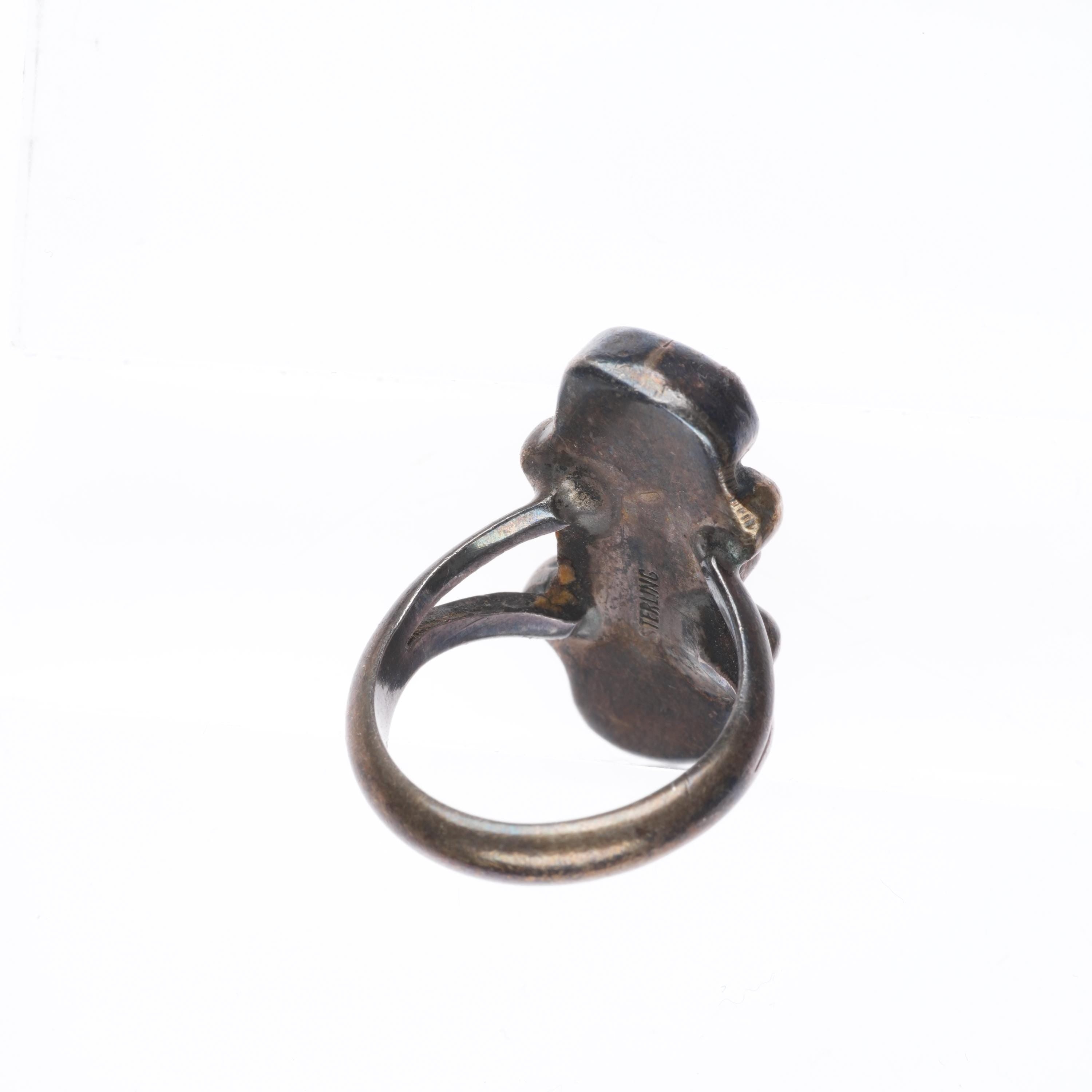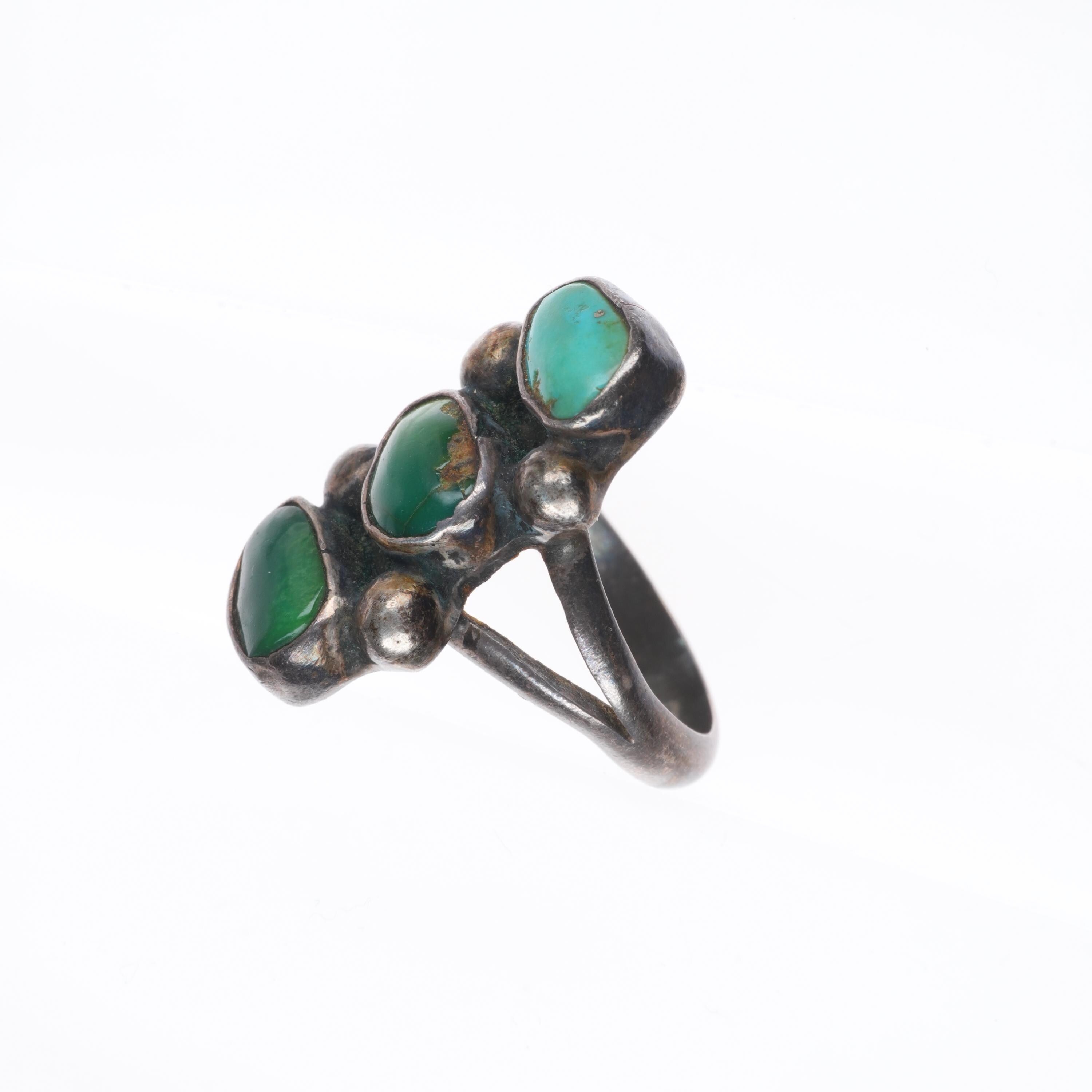 sz4.5 c1930 Navajo ingot silver stoplight 3 stone greasy green turquoise ring. Tested and guaranteed solid sterling silver. Nice ring from the second quarter of the 20th century. Some expected wear, weight and measurements in pictures.