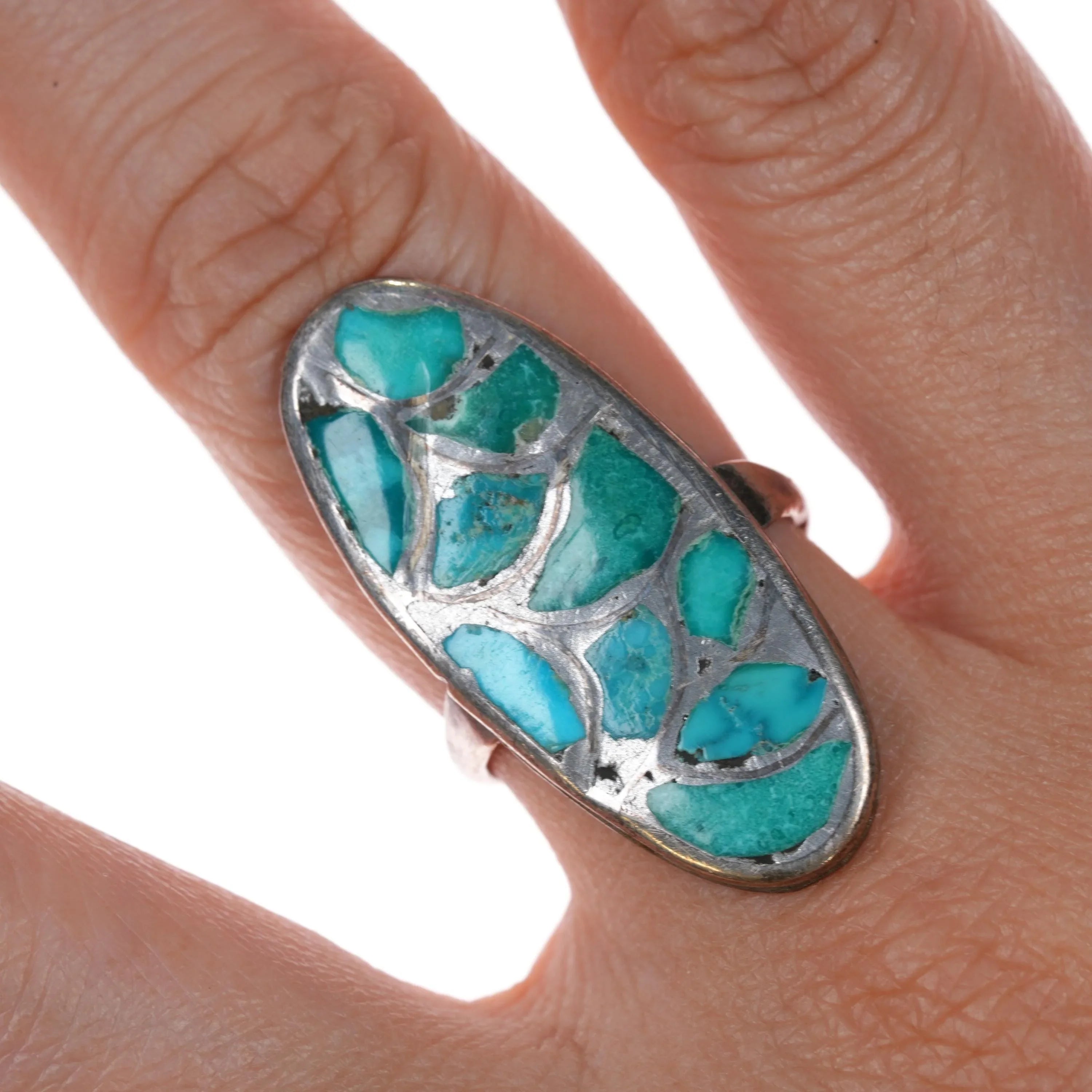 sz7.25 Alice Leekya Homer Zuni sterling silver fishscale Turquoise inlay ring