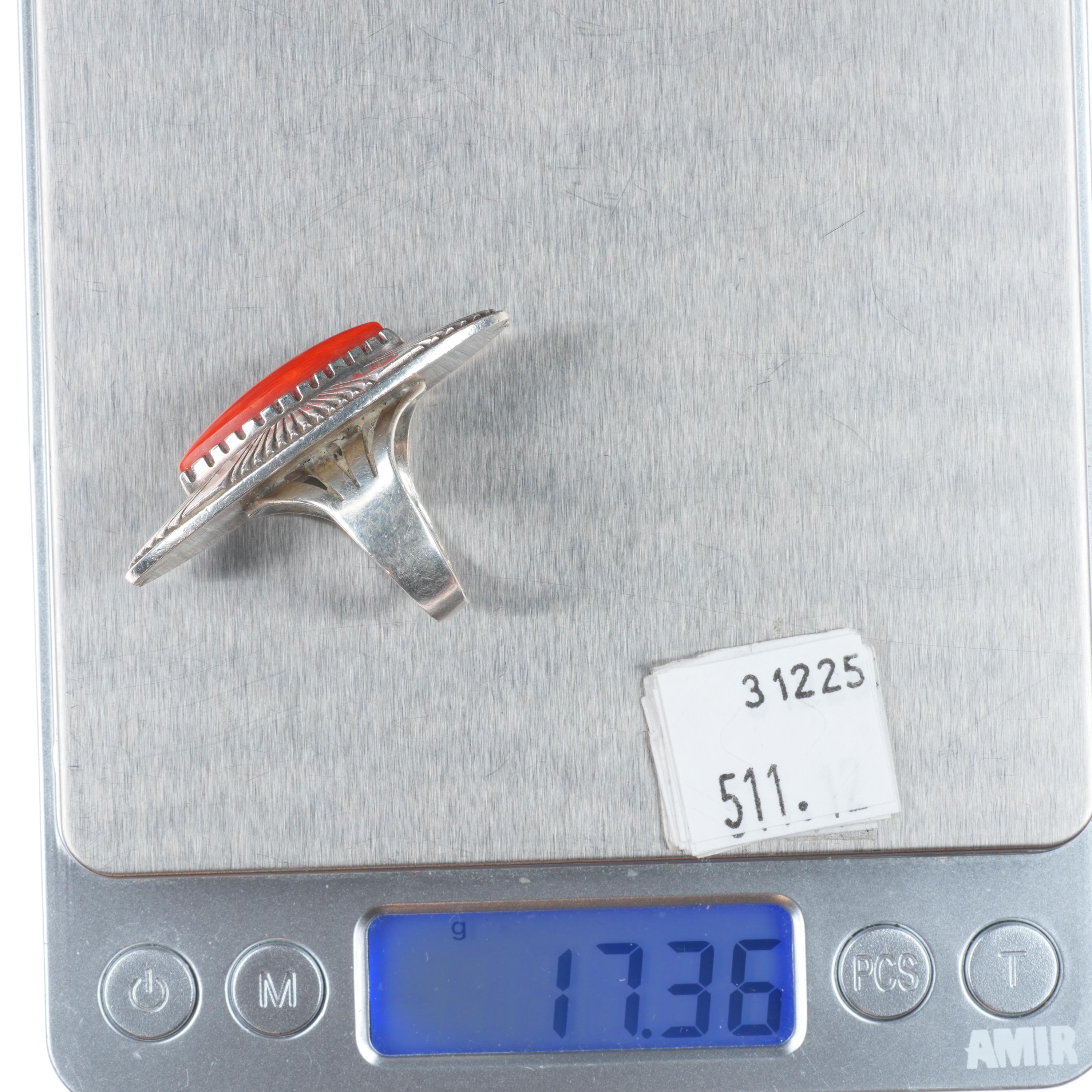 sz7.5 Kee Nez Navajo sterling silver modernist Mediterranean coral ring. Nice ring from the last quarter of the 20th century.