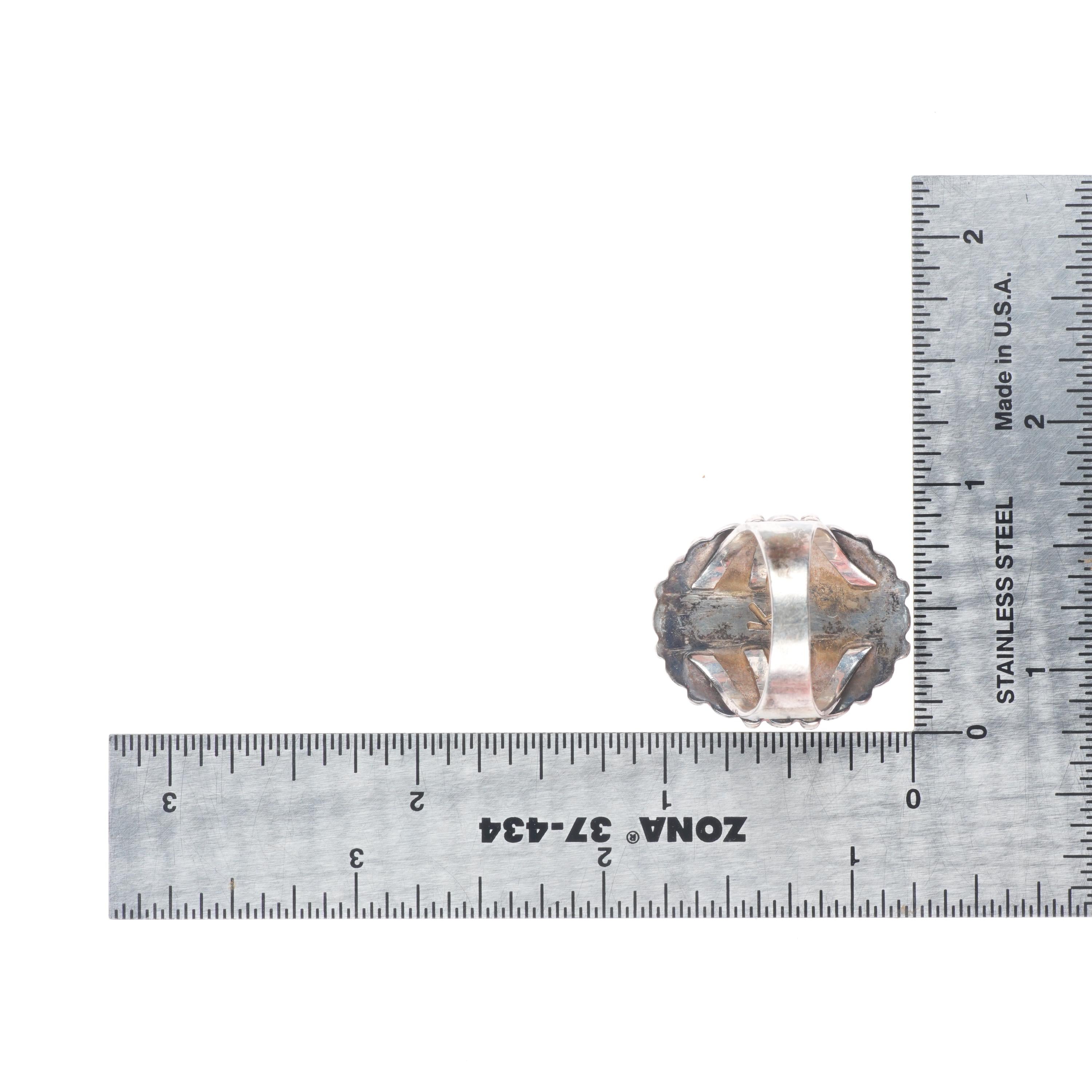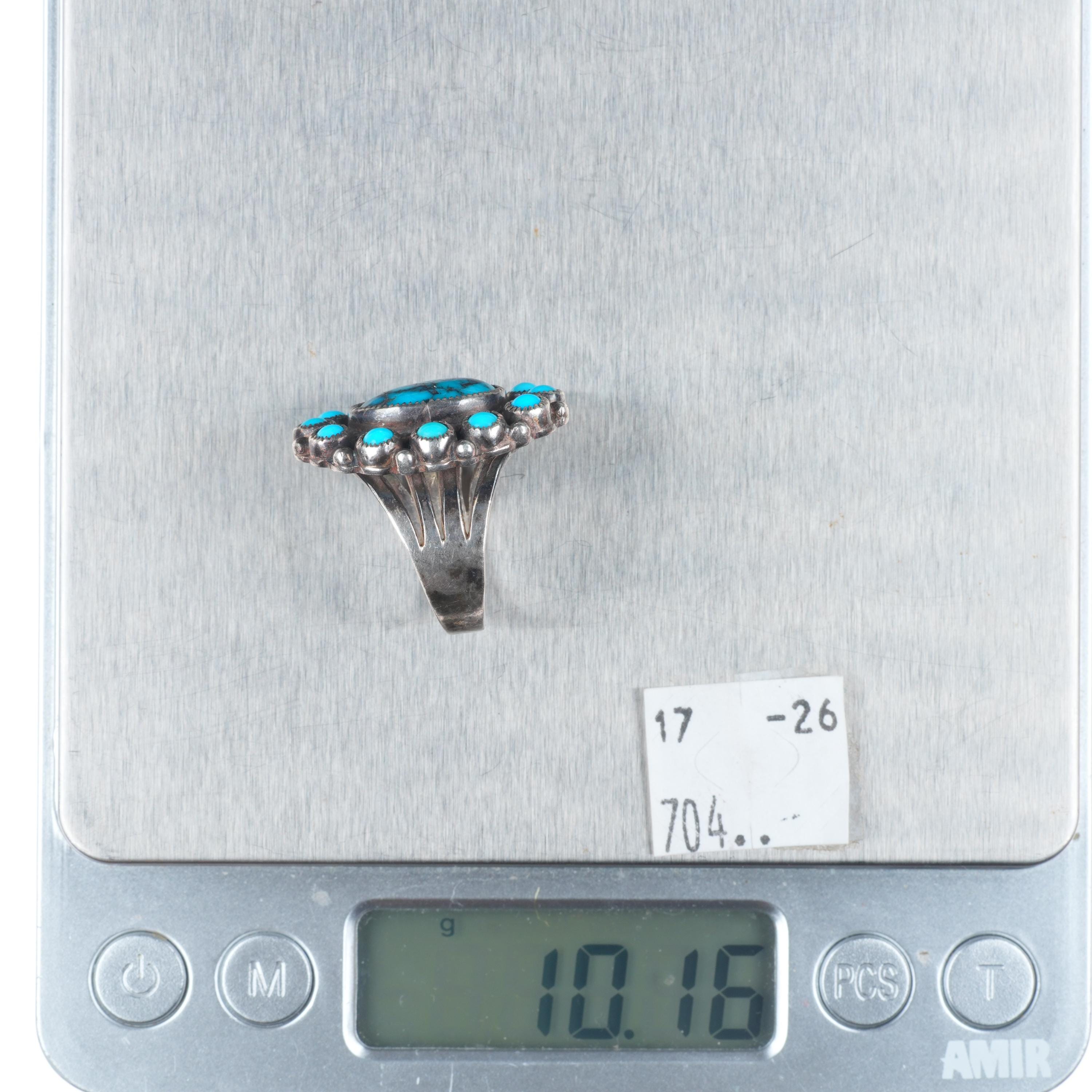 sz7.5 Vintage Navajo or Zuni high grade turquoise satellite ring sterling silver. Tested and guaranteed solid sterling silver, circa third quarter of the 20th century. Some expected wear, weight and measurements in pictures. Unknown hallmark