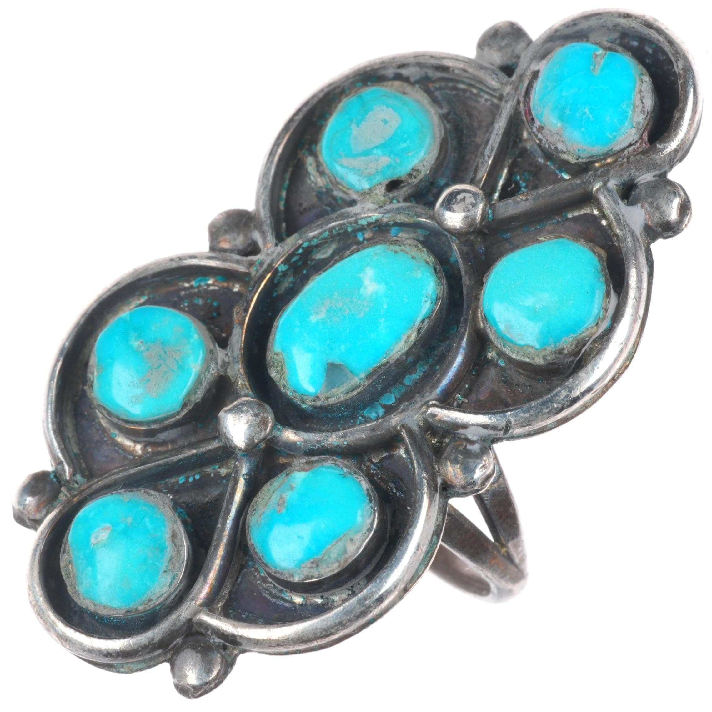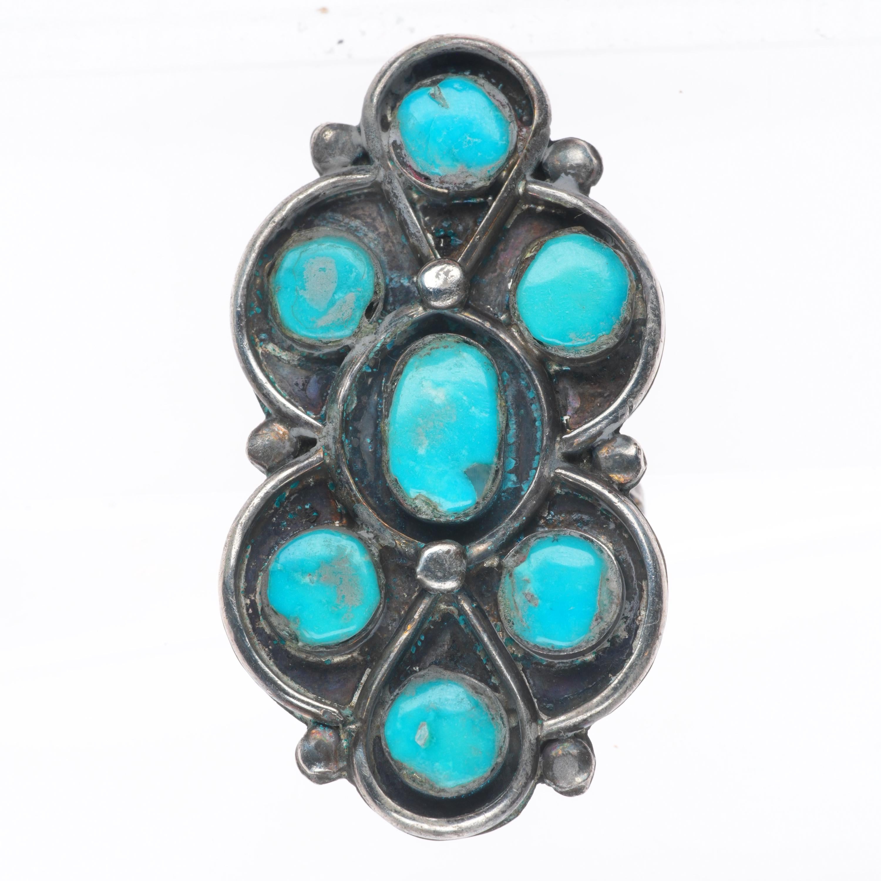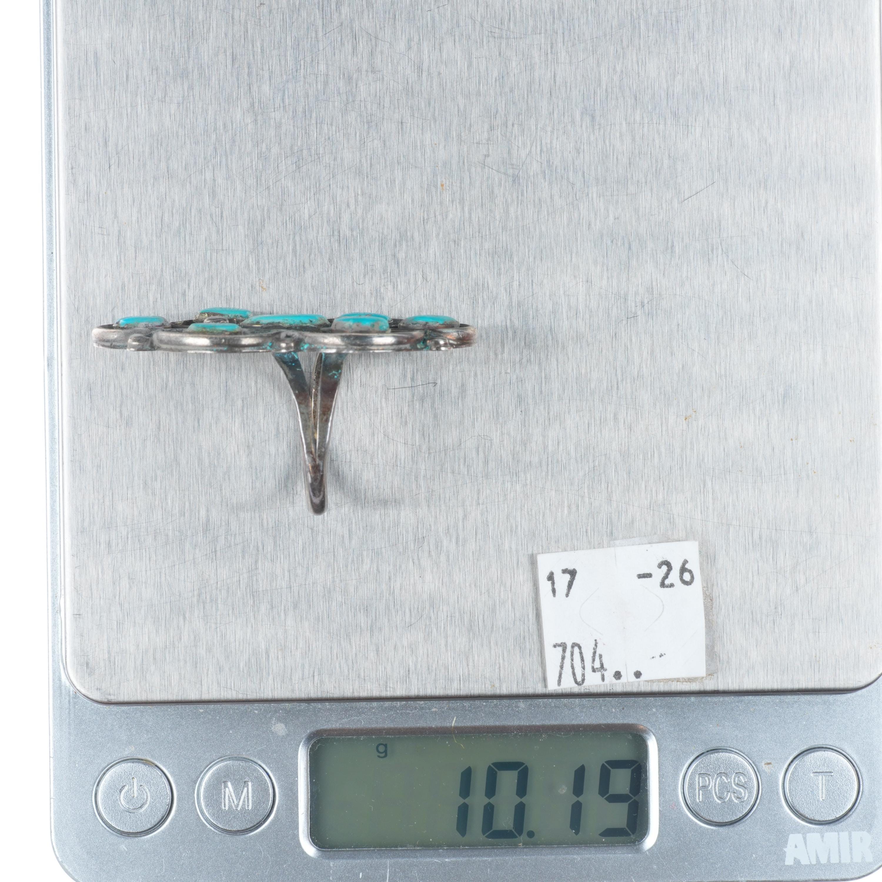 sz8.75 big vintage Zuni sterling silver 7 stone turquoise long ring. Tested and guaranteed solid sterling silver, circa third quarter of the 20th century. Some expected wear, weight and measurements in pictures.