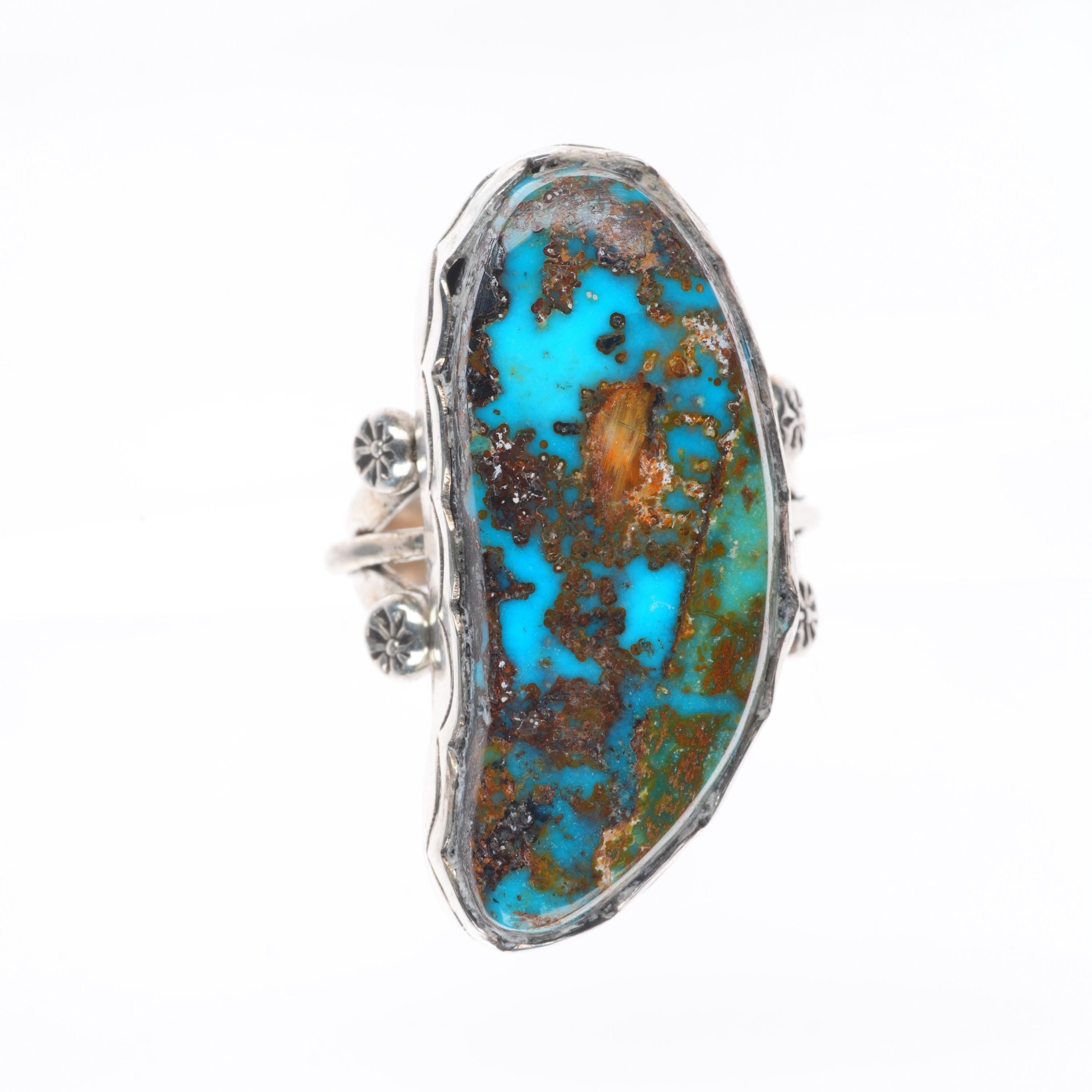 sz8 Vintage Navajo sterling silver high grade chocolate matrix turquoise ring. Tested and guaranteed solid sterling silver. Nice ring from last quarter of the 20th century. Some expected wear, weight and measurements in pictures. Very high grade/quality Natural American turquoise of unknown mine. Could be Bisbee, but could also be from a Nevada mine. Naturally goes from blue to green. Fancy bezel.