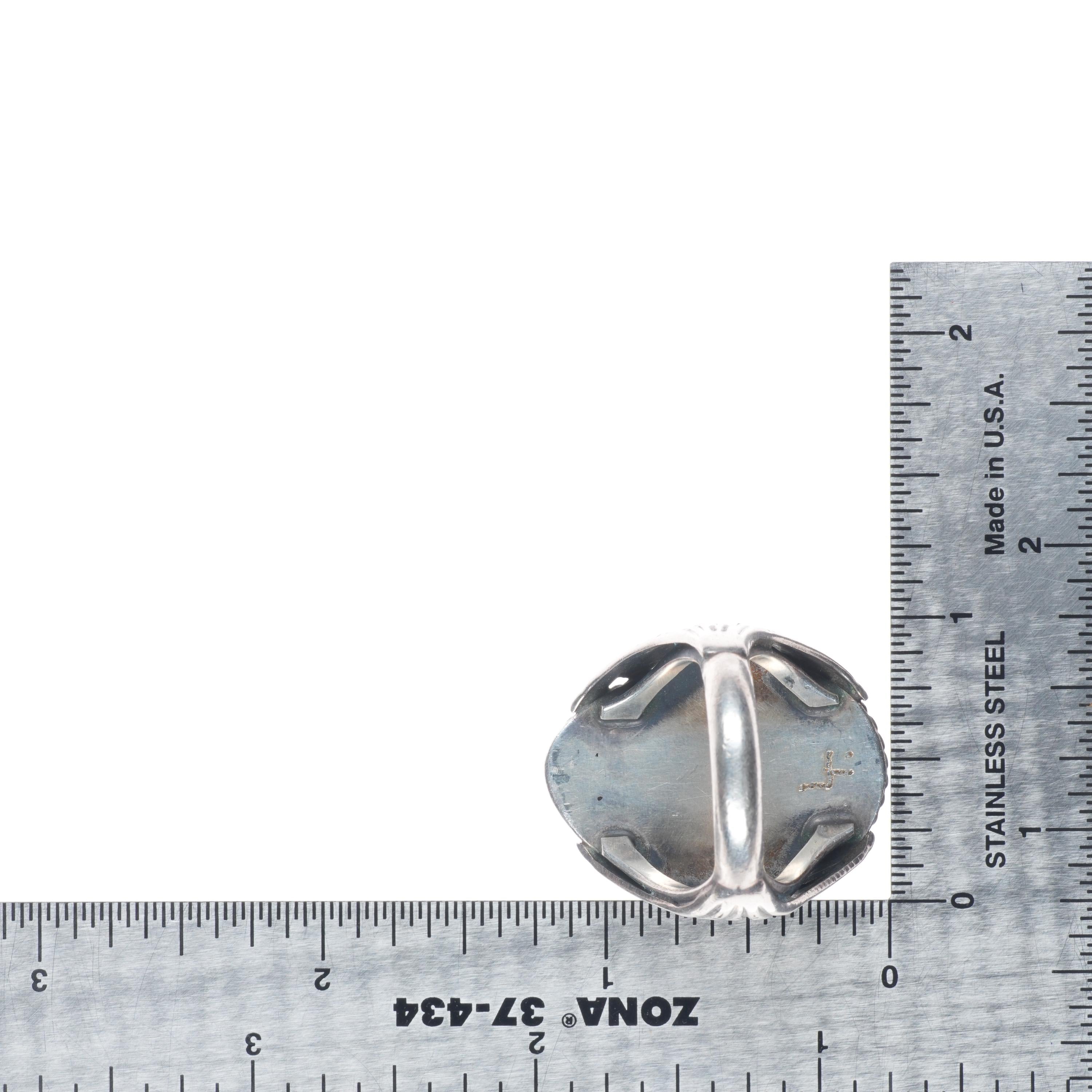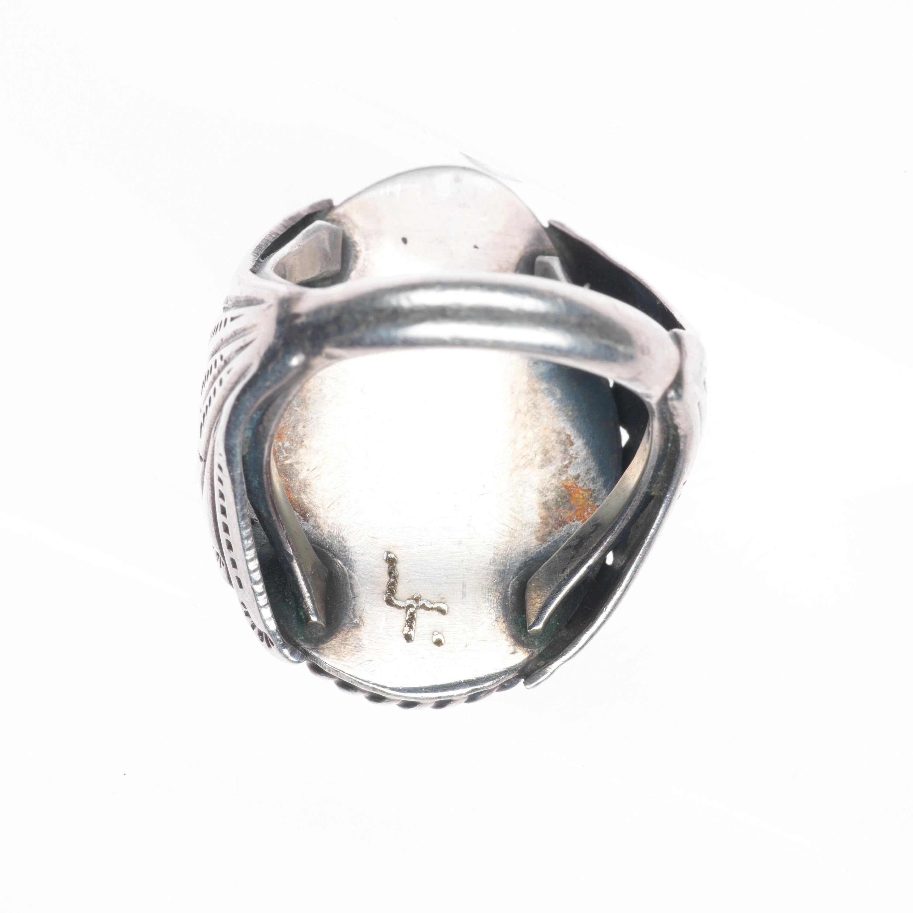 sz9.5 Vintage Native American LT Sterling men‘s ring with nice turquoise. Tested and guaranteed solid sterling silver. Nice ring from the third quarter of the 20th century. Some expected wear, weight and measurements in pictures. There is what appears to be a fissure that goes along with the matrix. The stone is secure and not going anywhere.