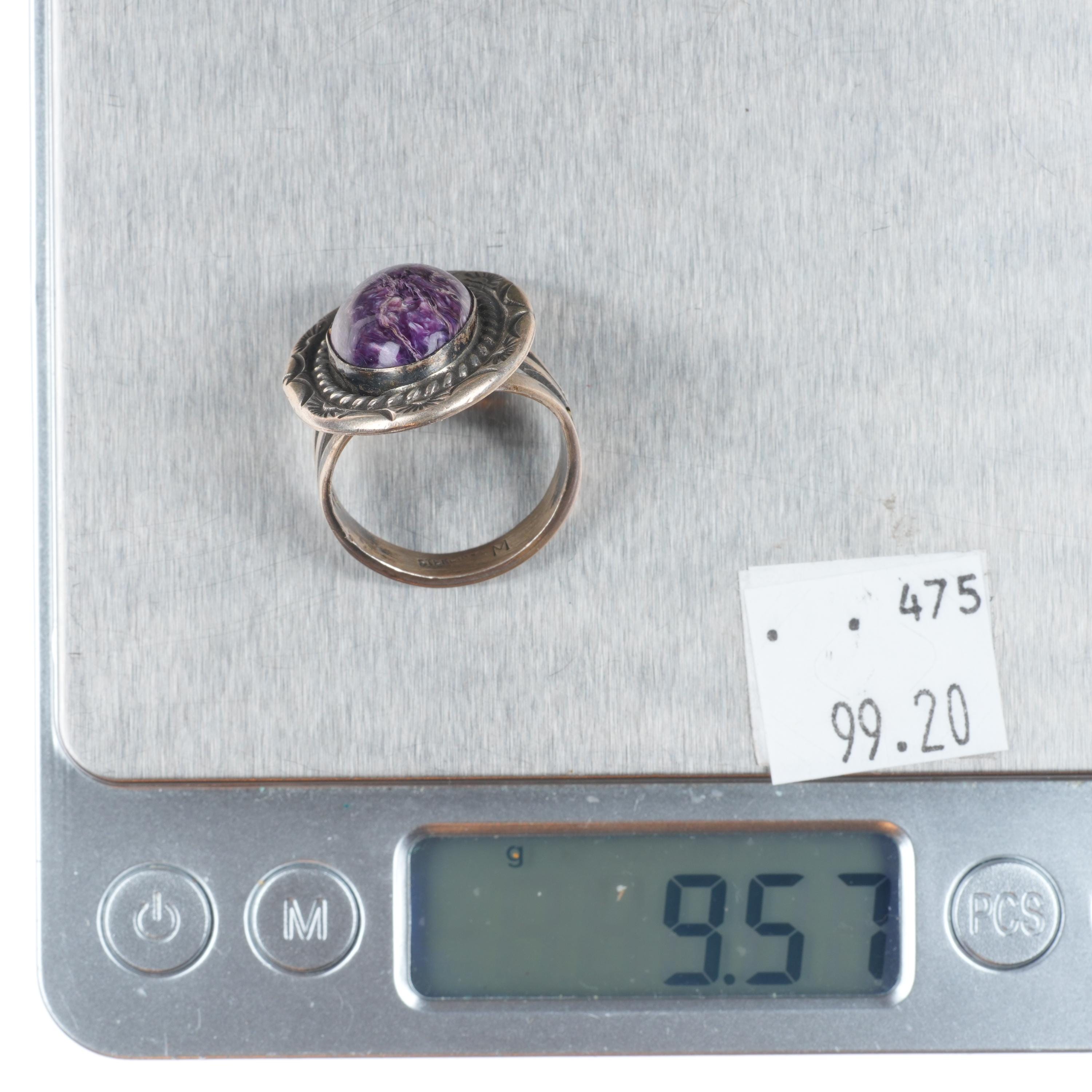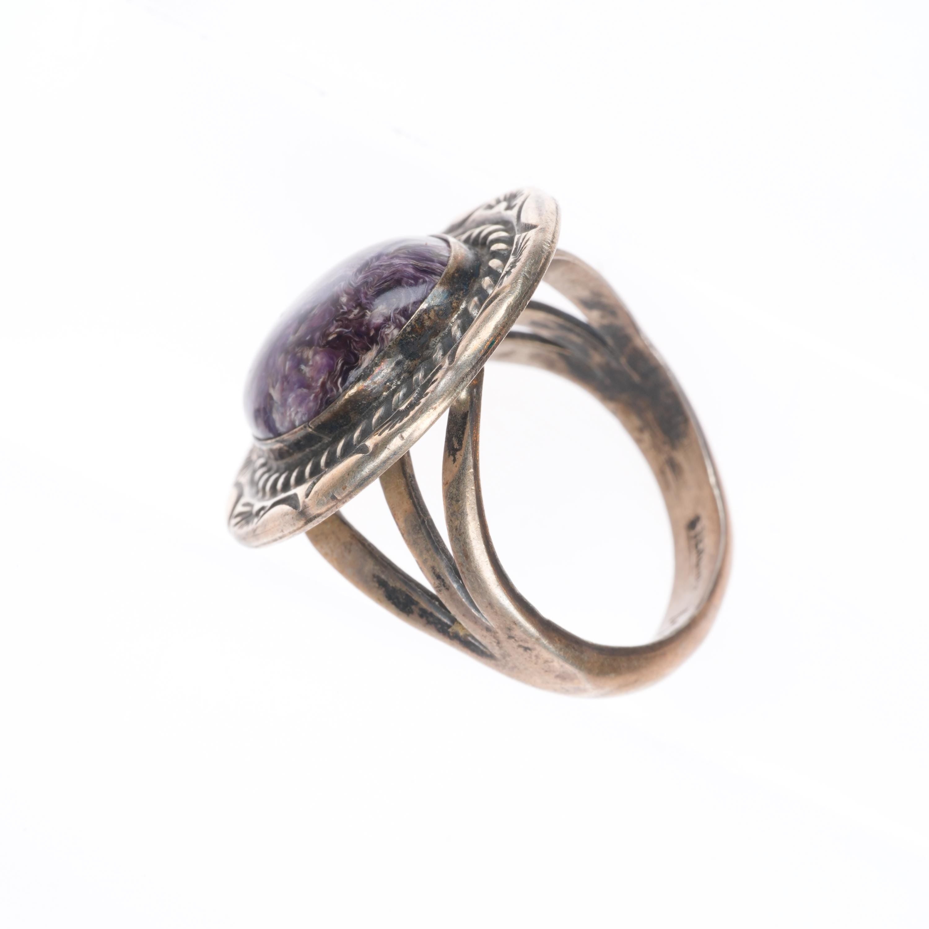 sz9.5 Vintage Navajo purple Charoite sterling silver ring. Tested and guaranteed solid sterling silver. Nice ring from the fourth quarter of the 20th century. Some expected wear, weight and measurements in pictures.
