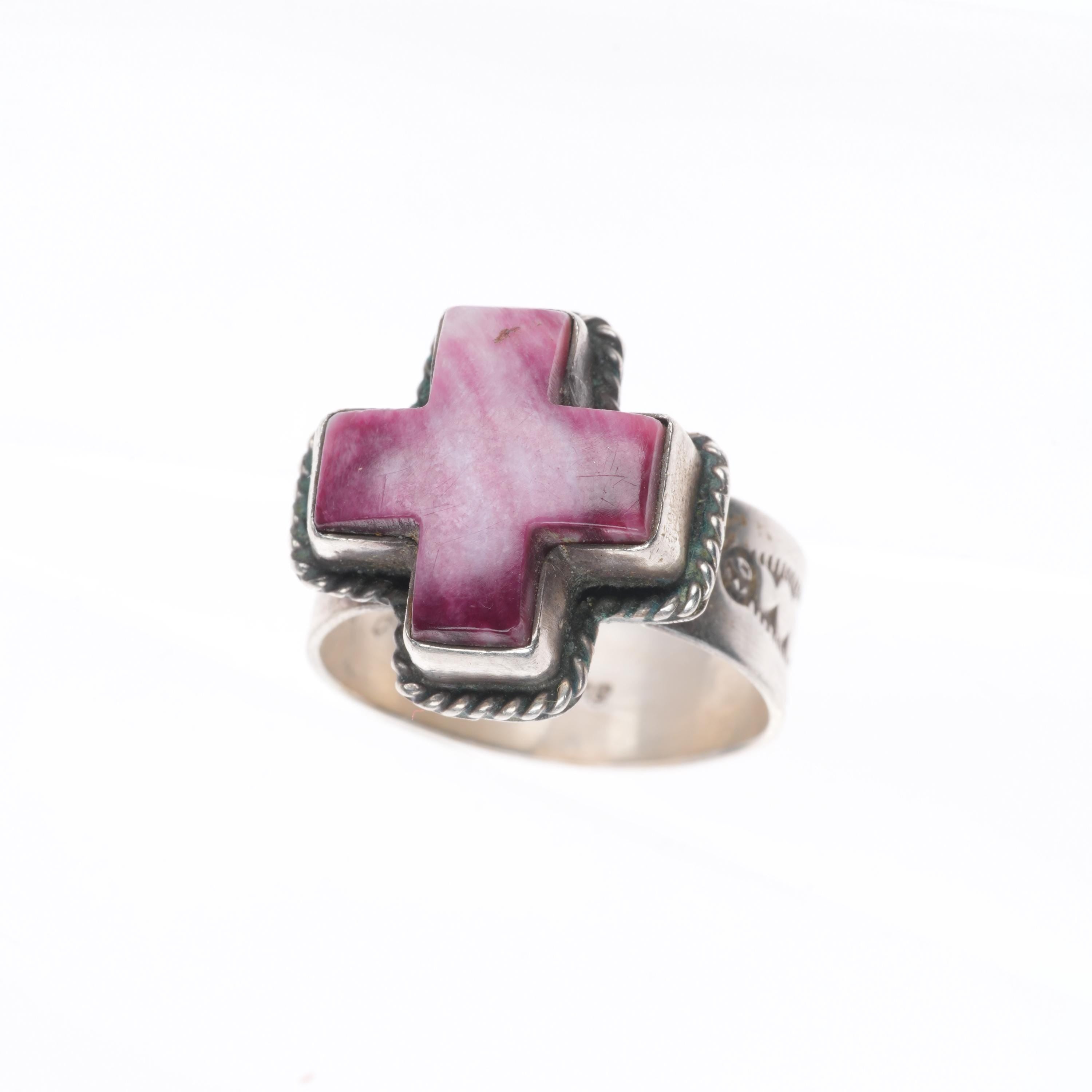 sz9 Gary G Navajo adjustable sterling silver spiny oyster cross ring. Tested and guaranteed solid sterling silver. Nice ring from the last quarter of the 20th century. Some expected wear, weight and measurements in pictures.