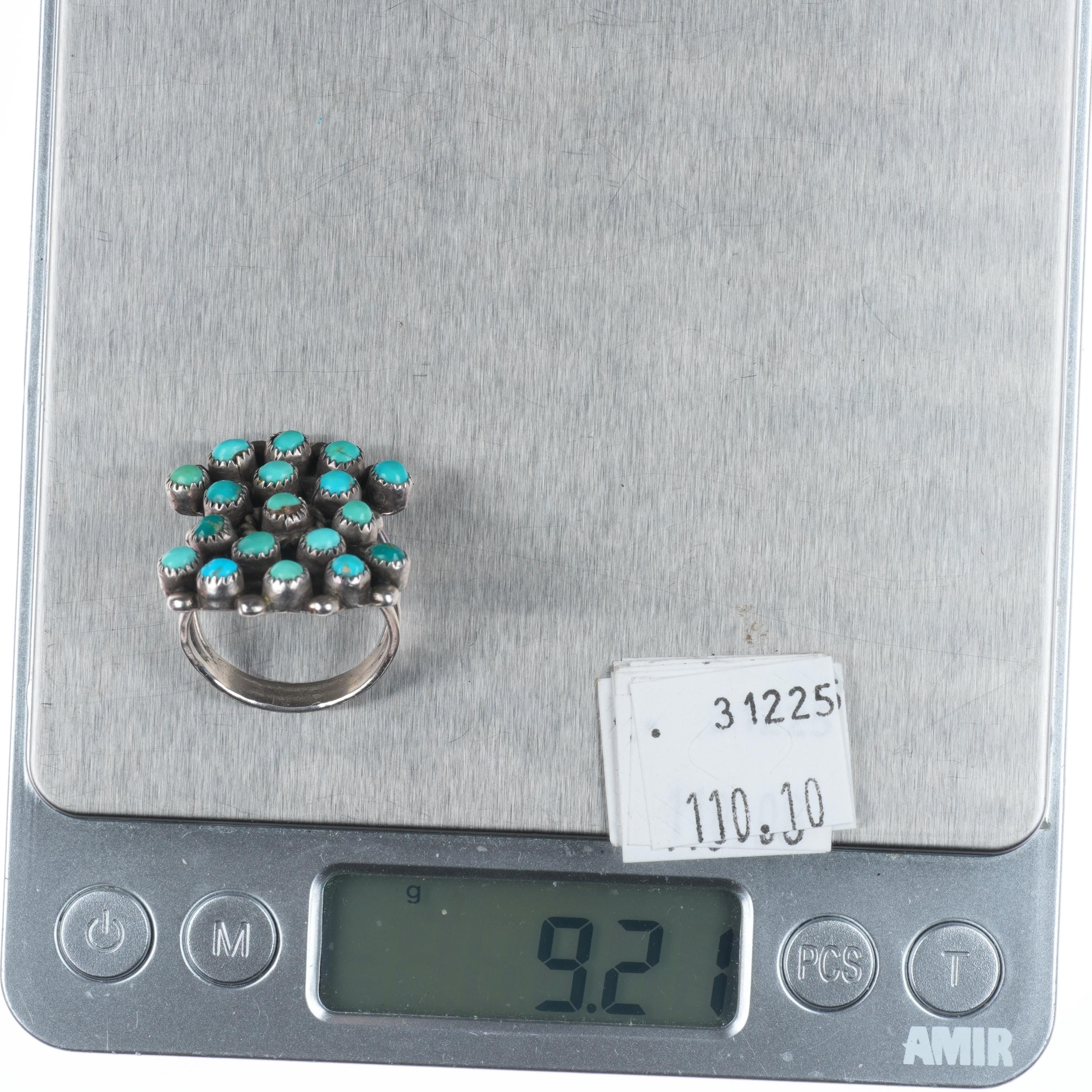 sz9 Vintage Zuni sterling silver snake eye turquoise 18 stone ring. Tested and guaranteed solid sterling silver. Nice ring from the third quarter of the 20th century. Some expected wear, weight and measurements in pictures.