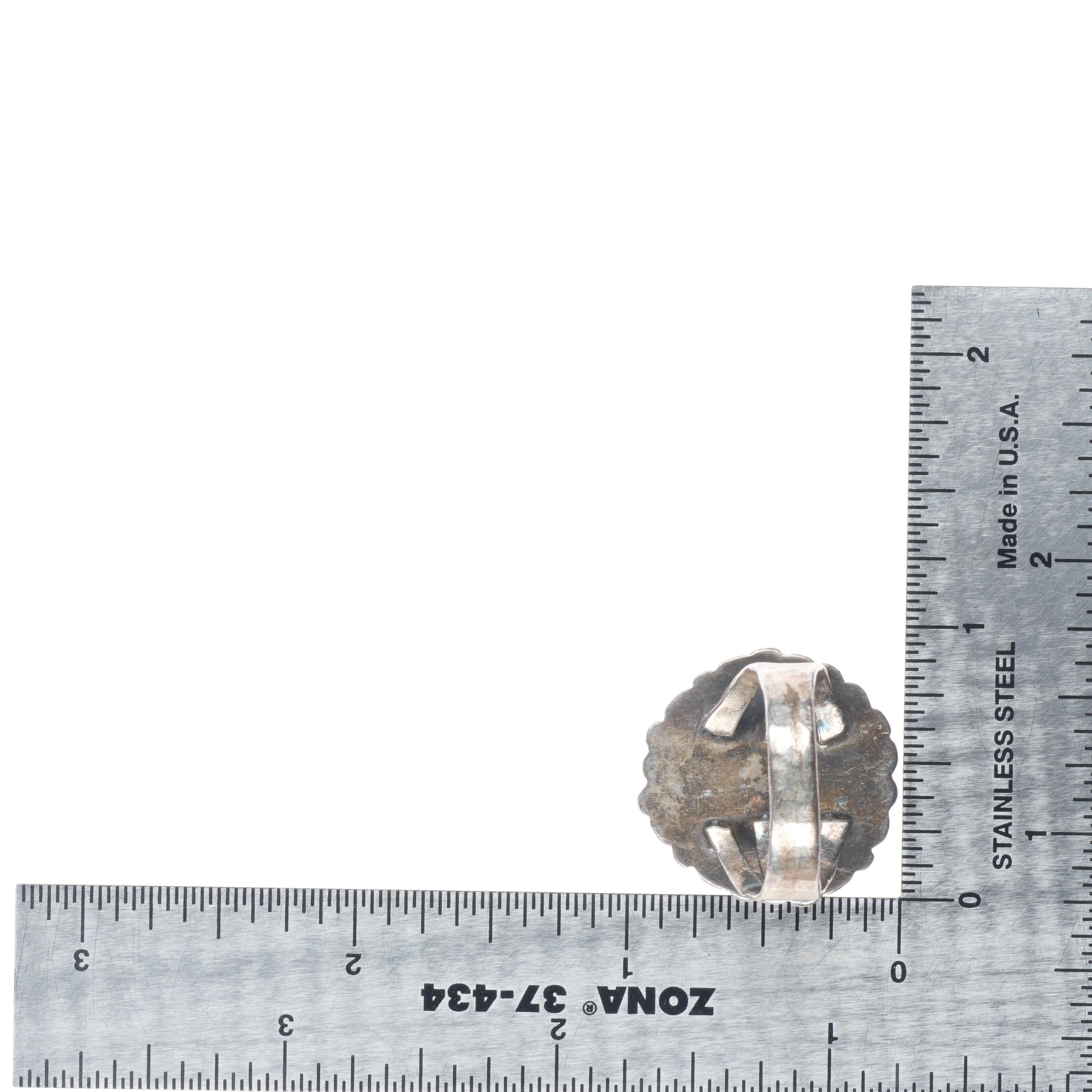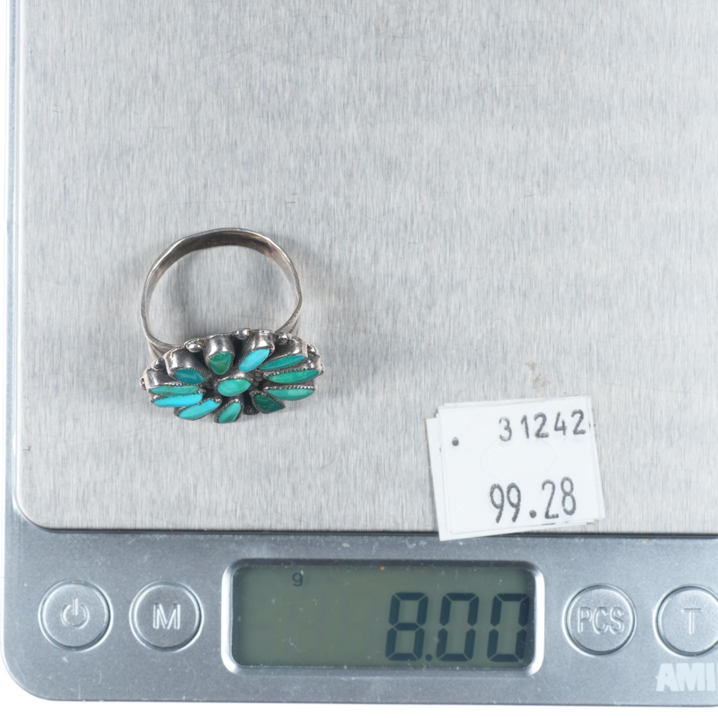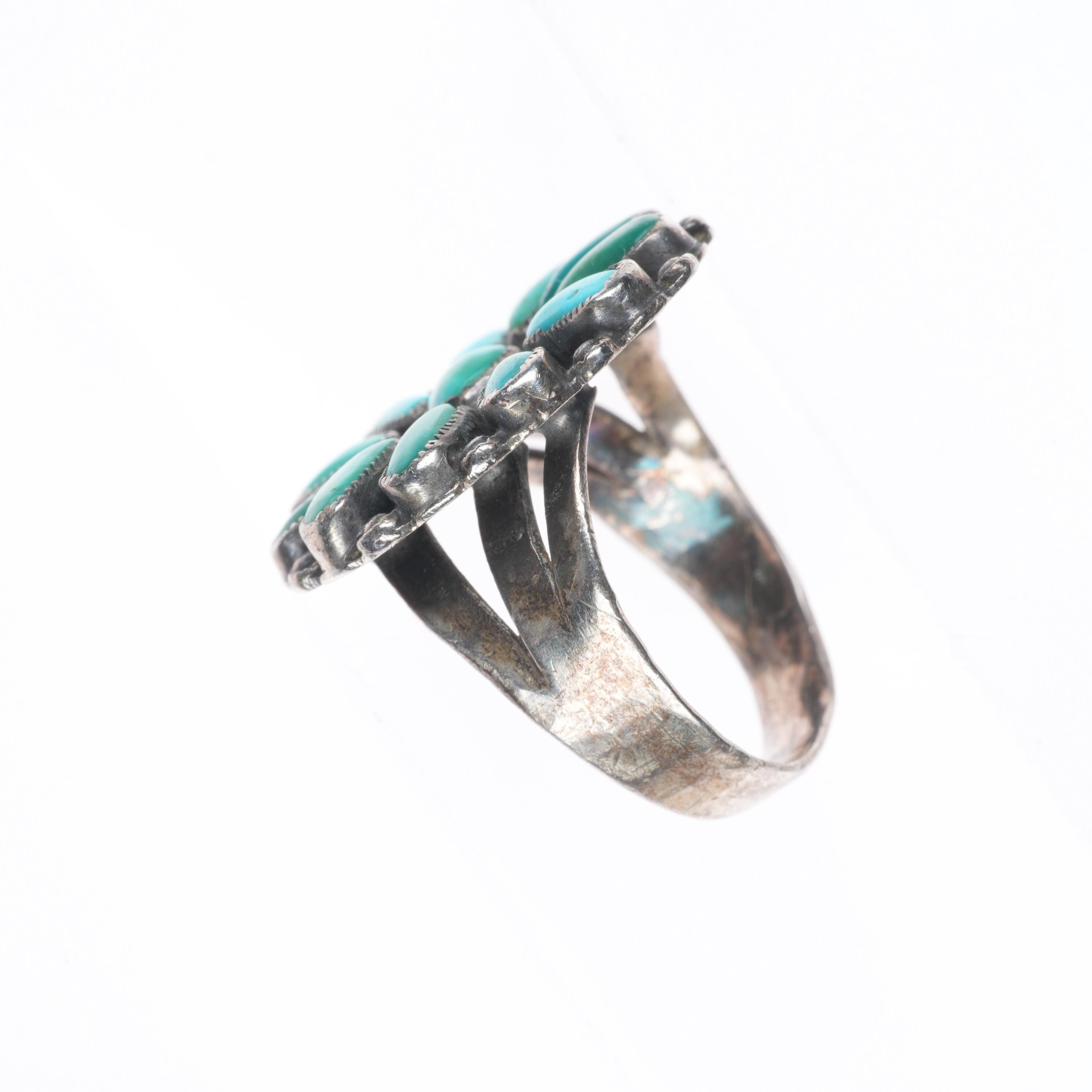 sz9 Vintage Zuni sterling silver green/blue turquoise cluster ring. Tested and guaranteed solid sterling silver. Nice ring from the third quarter of the 20th century. Some expected wear, weight and measurements in pictures.