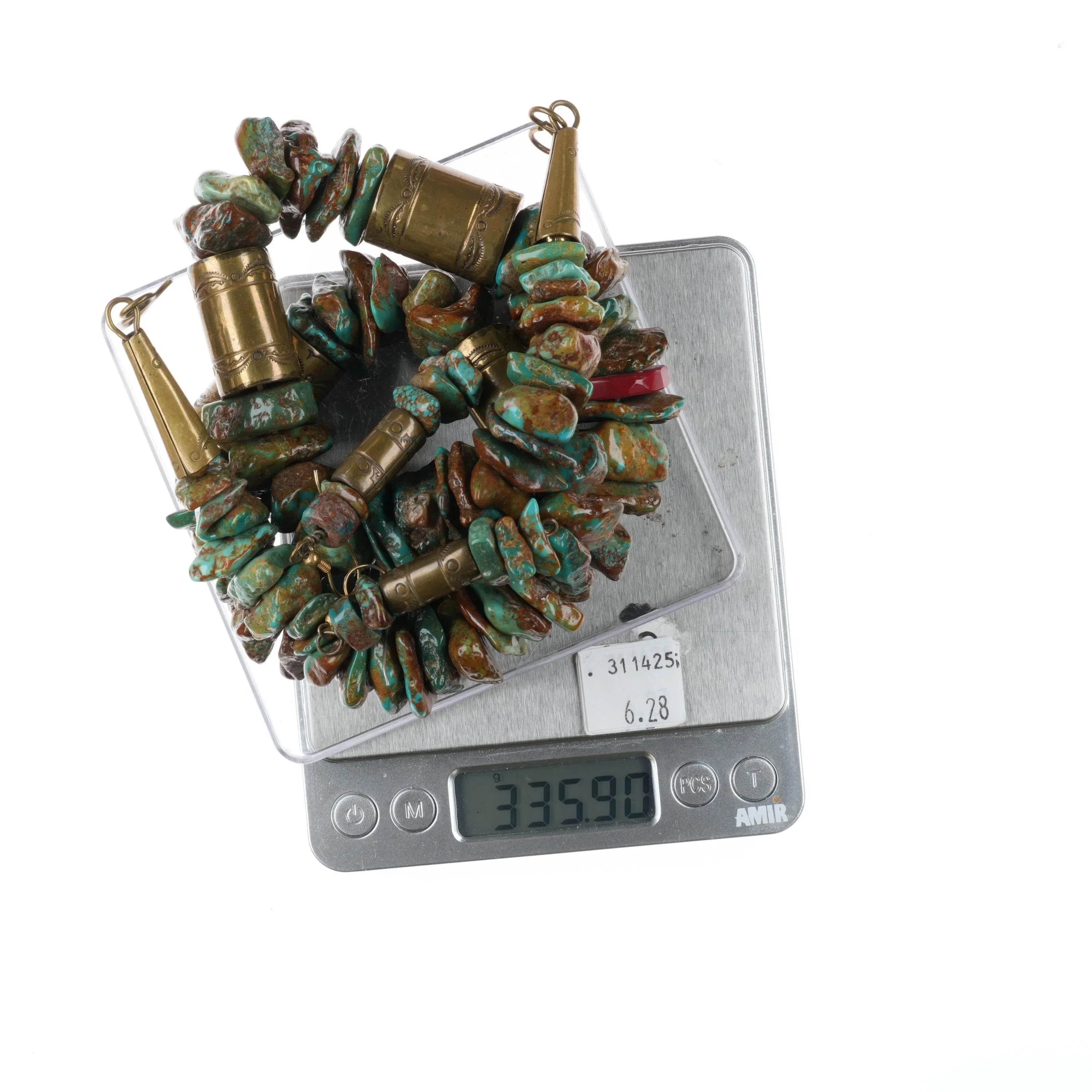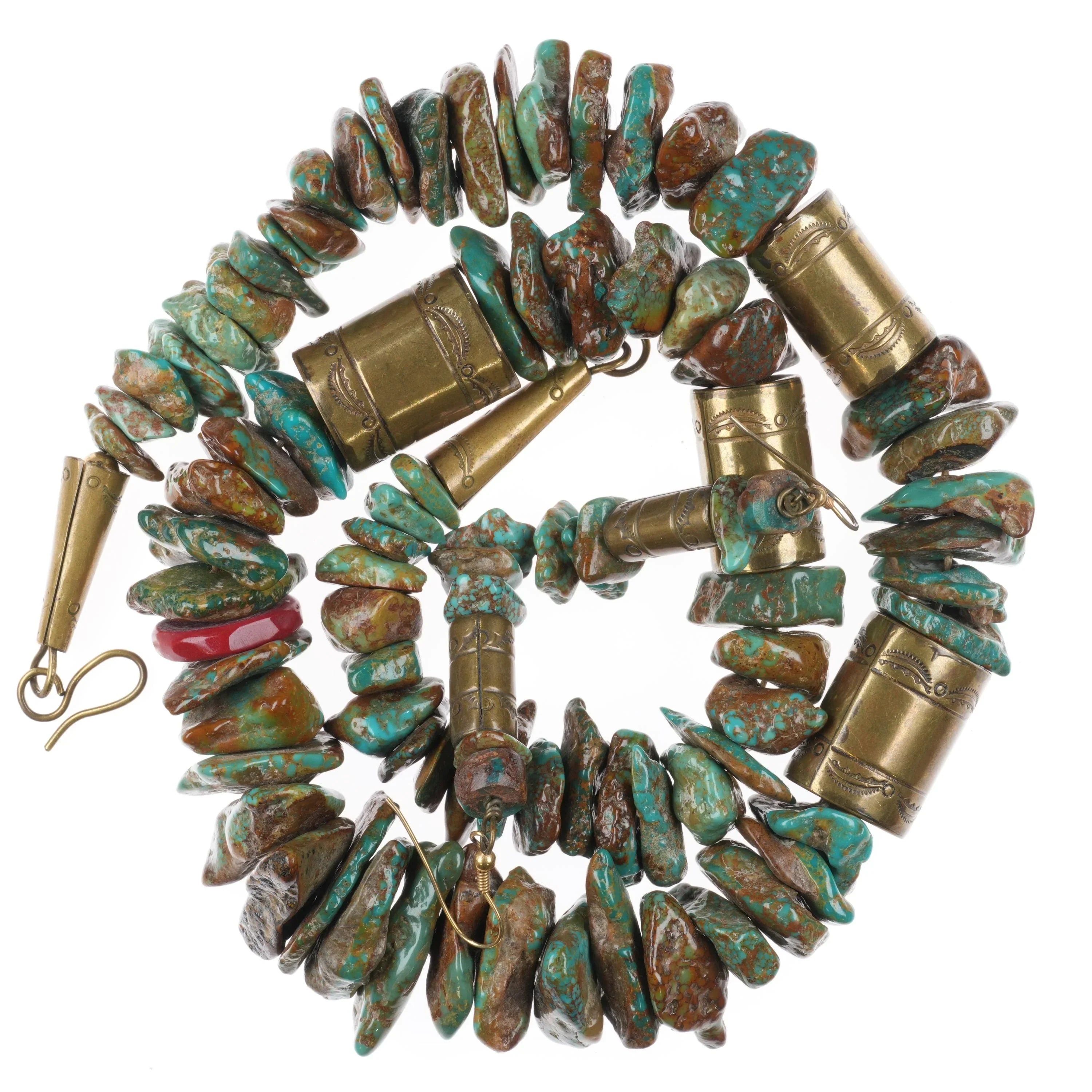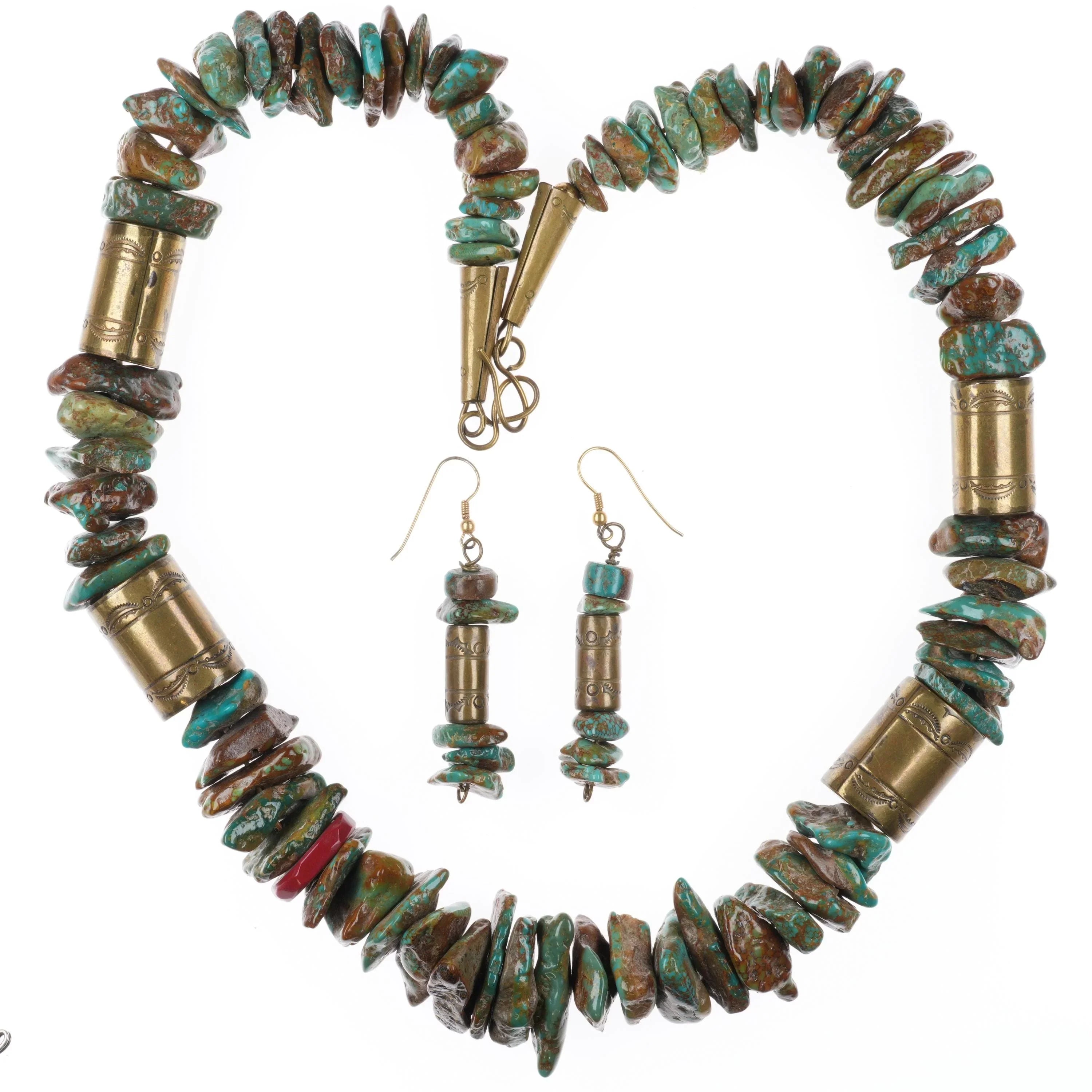 Tony Aguilar Sr Oversized turquoise/brass barrel bead necklace/earrings. Authentic with no damage, with weight and measurements in the pictures. Each cone hallmarked, can be seen on the one picture with the blue tape measure. 29" long necklace.