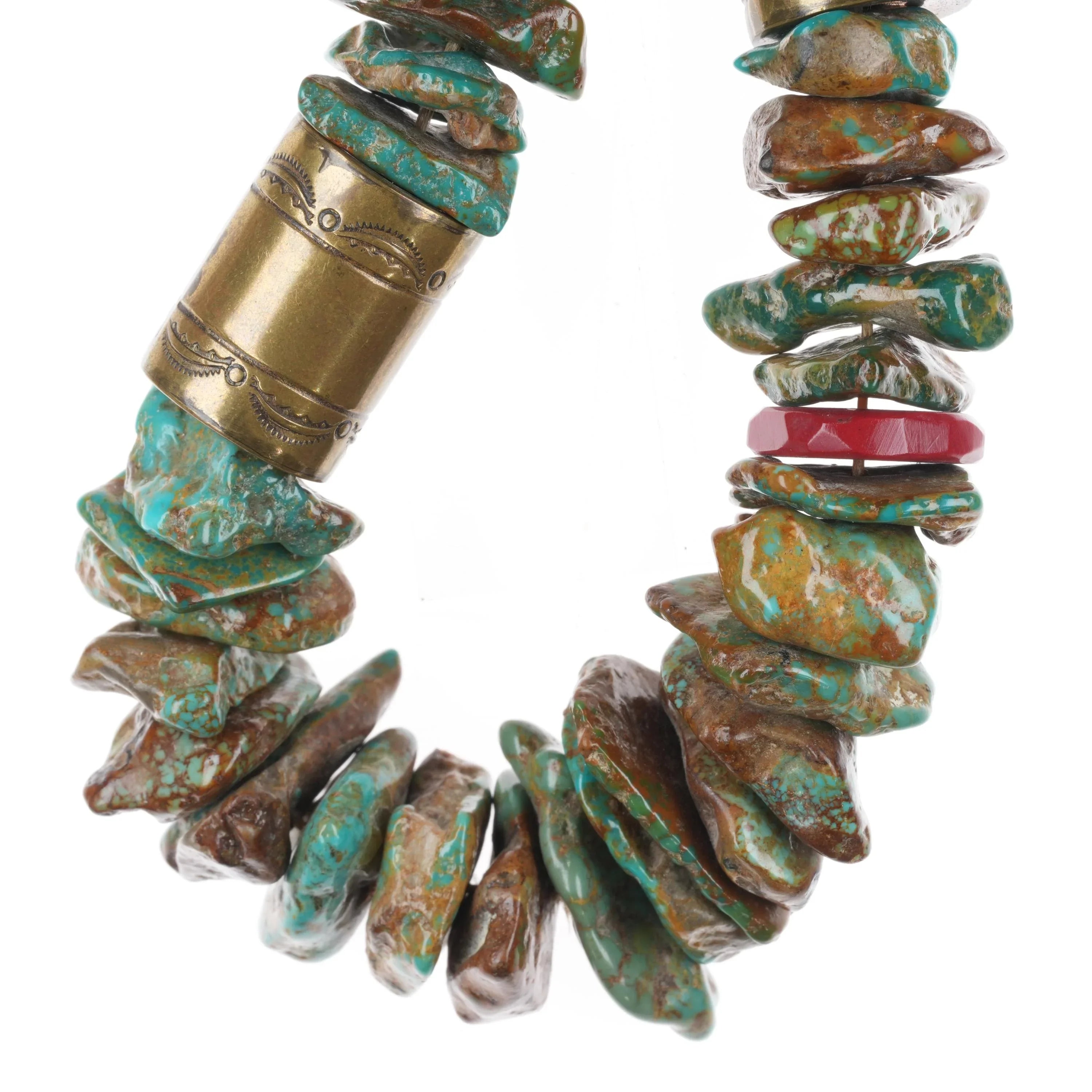 Tony Aguilar‘s life certainly influenced his jewelry. He was born in 1919 at Santo Domingo. From a family of jewelers including his own father and his uncle, Vidal Aragon, Tony Aguilar learned silversmithing from a Navajo jeweler while he attended the Santa Fe Indian School. The president of his class at the Indian School, Tony entered the United States Army during World War II. For 2 1/2 years, Tony Aguilar was stationed in the middle east, and while there he admired the heavy, ornate jewelry designs of Middle Eastern jewelry. Tony would return to the United States highly influenced by those jewelry designs. The resulting jewelry that Tony Aguilar created post World War II was often bold, big and brass with intricate stampwork and large natural turquoise stones. Tony‘s frequent use of brass was quite exceptional, for brass is actually very difficult to work with and very few jewelers can create brass jewelry that does the metal any justice. Tony Aguilar was one of the few who could. His brass work is some of the best around!