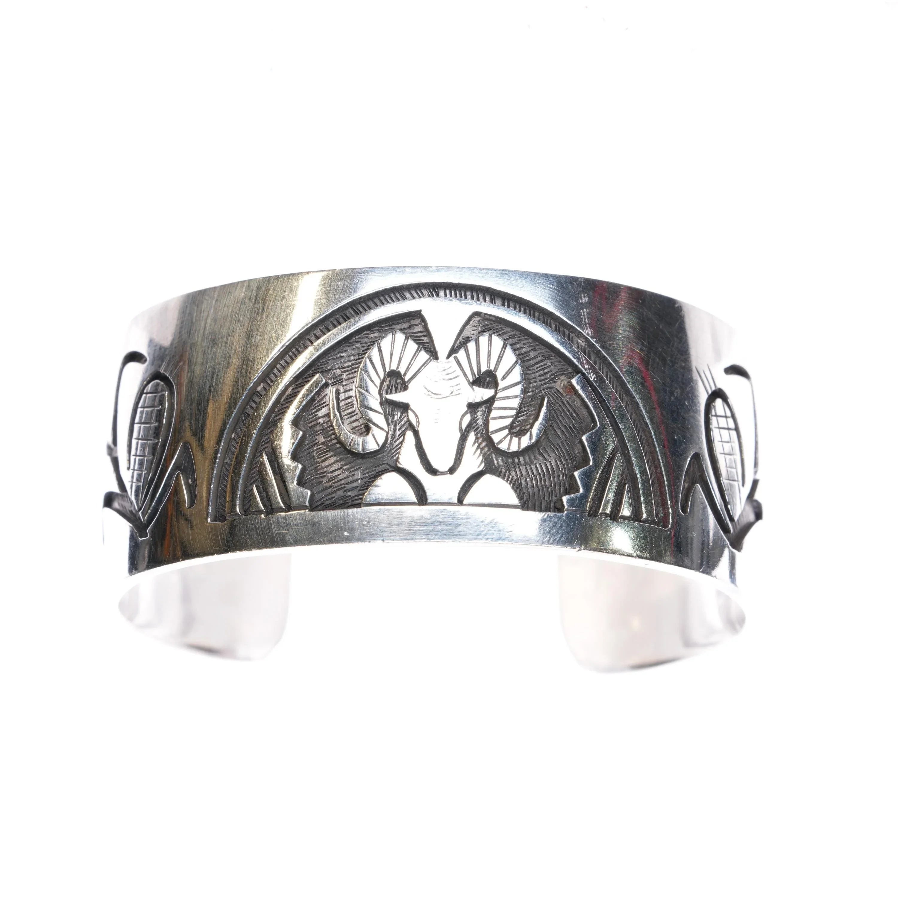 6.25" Victor Coochwytewa Hopi Overlay Kopavi- Ram/Corn cuff bracelet sterling silver. Tested and guaranteed solid sterling silver with artists/shop hallmark. Weight and measurements in pictures. Nice bracelet from the last quarter of the 20th century with no issues.