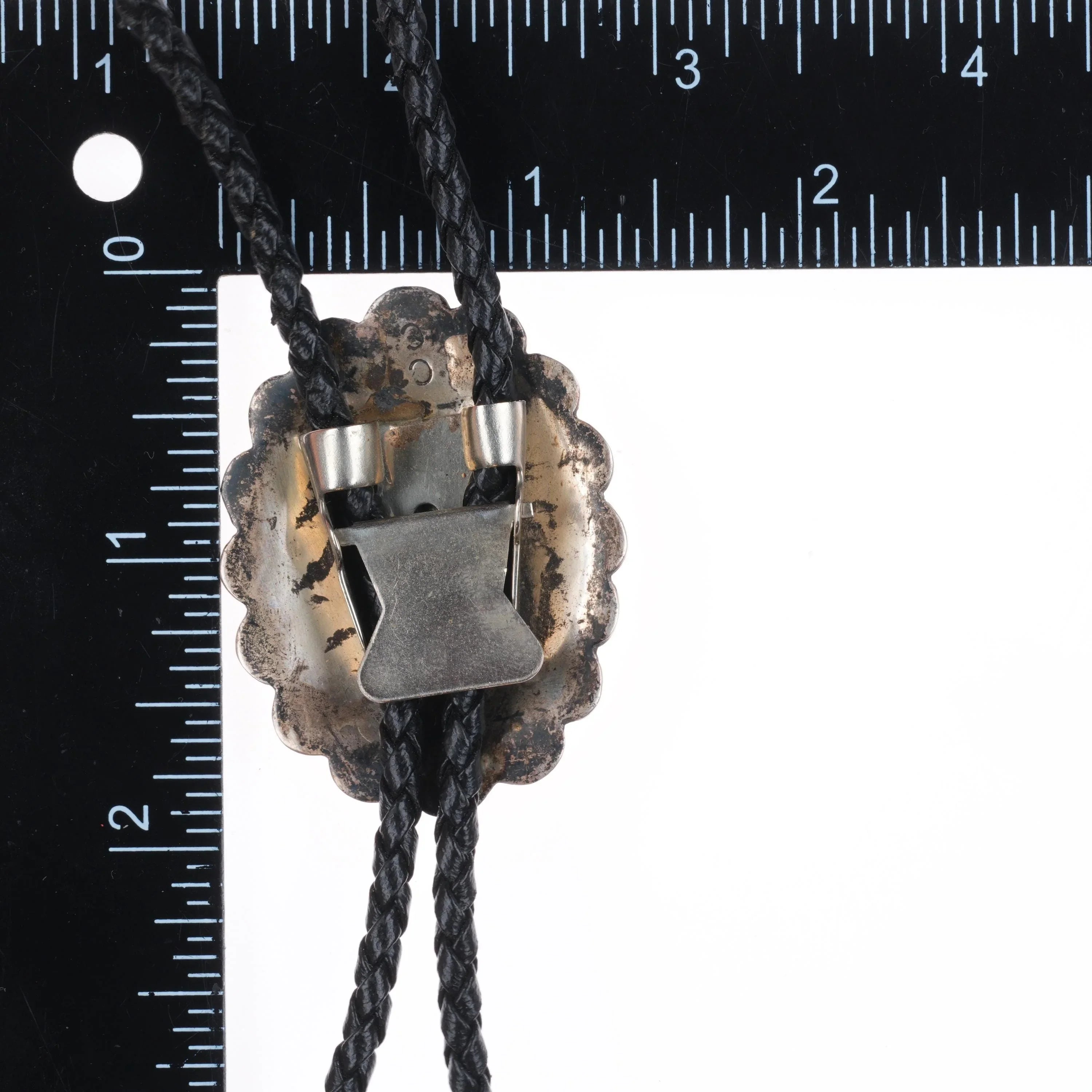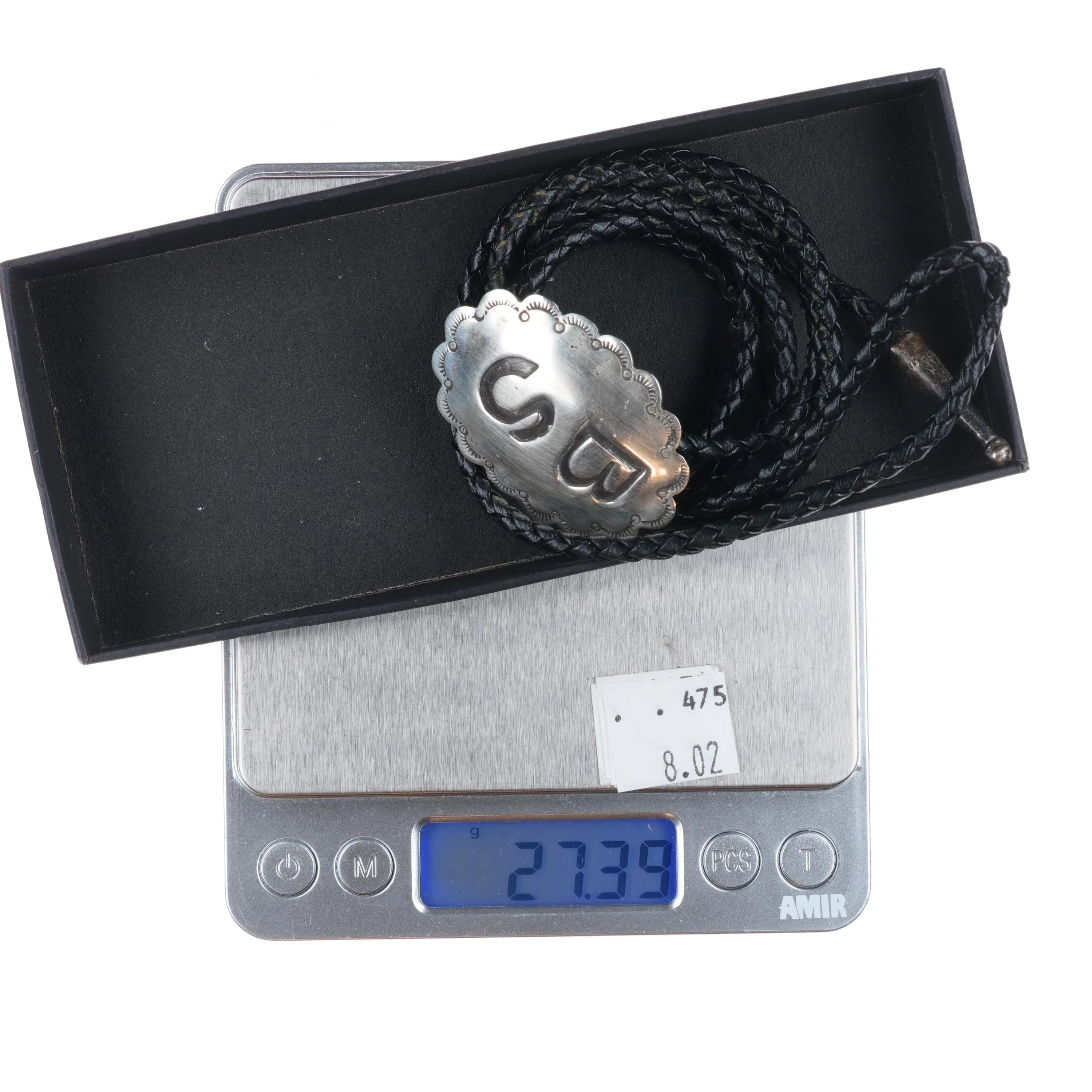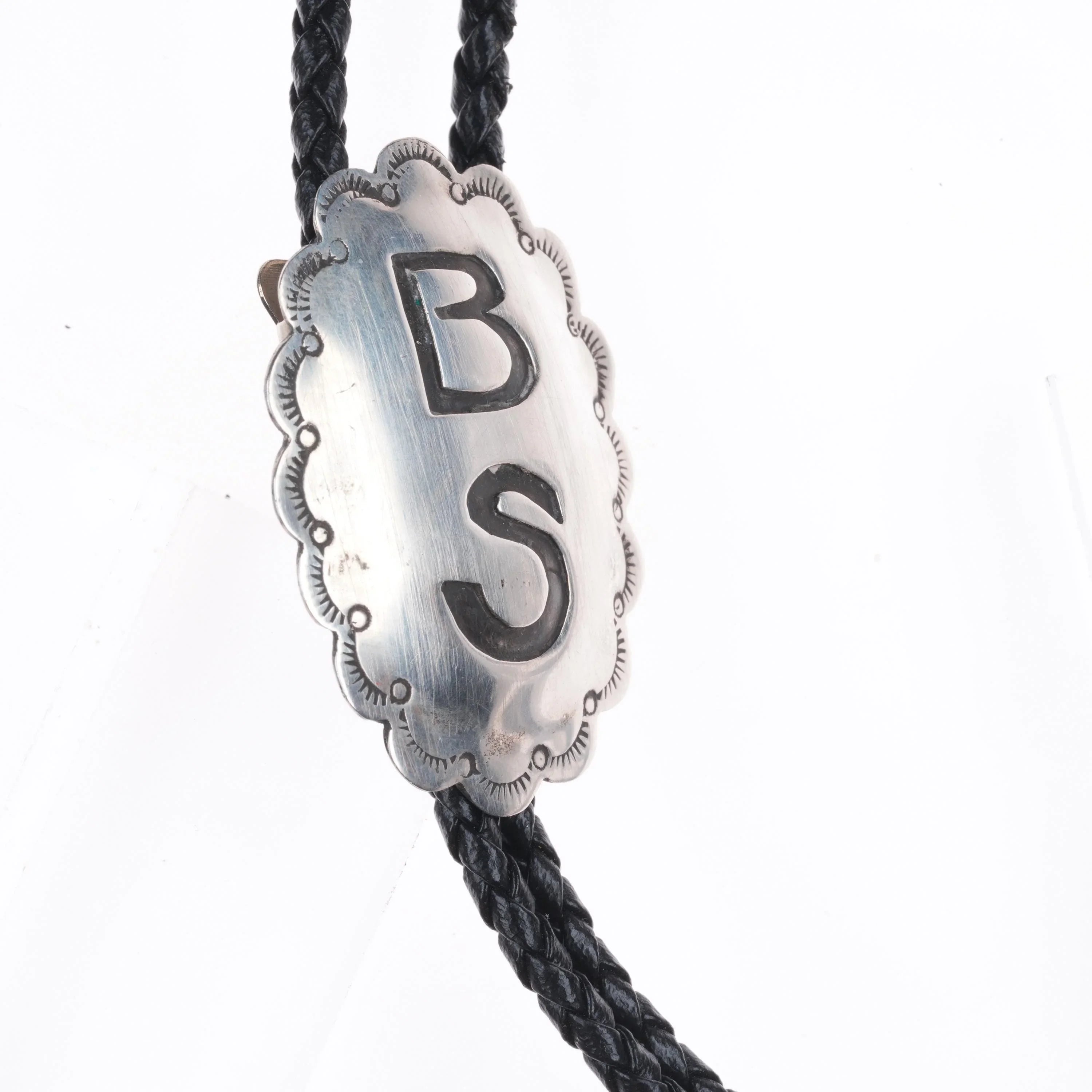 Vintage BS Navajo sterling silver concho style bolo tie. Tested and guaranteed solid sterling silver slide and tips. Weight and measurements in pictures. 42" long with no issues. Tray is tared out, so weight shown is just the bolo of course. Marked as shown by unknown artist.