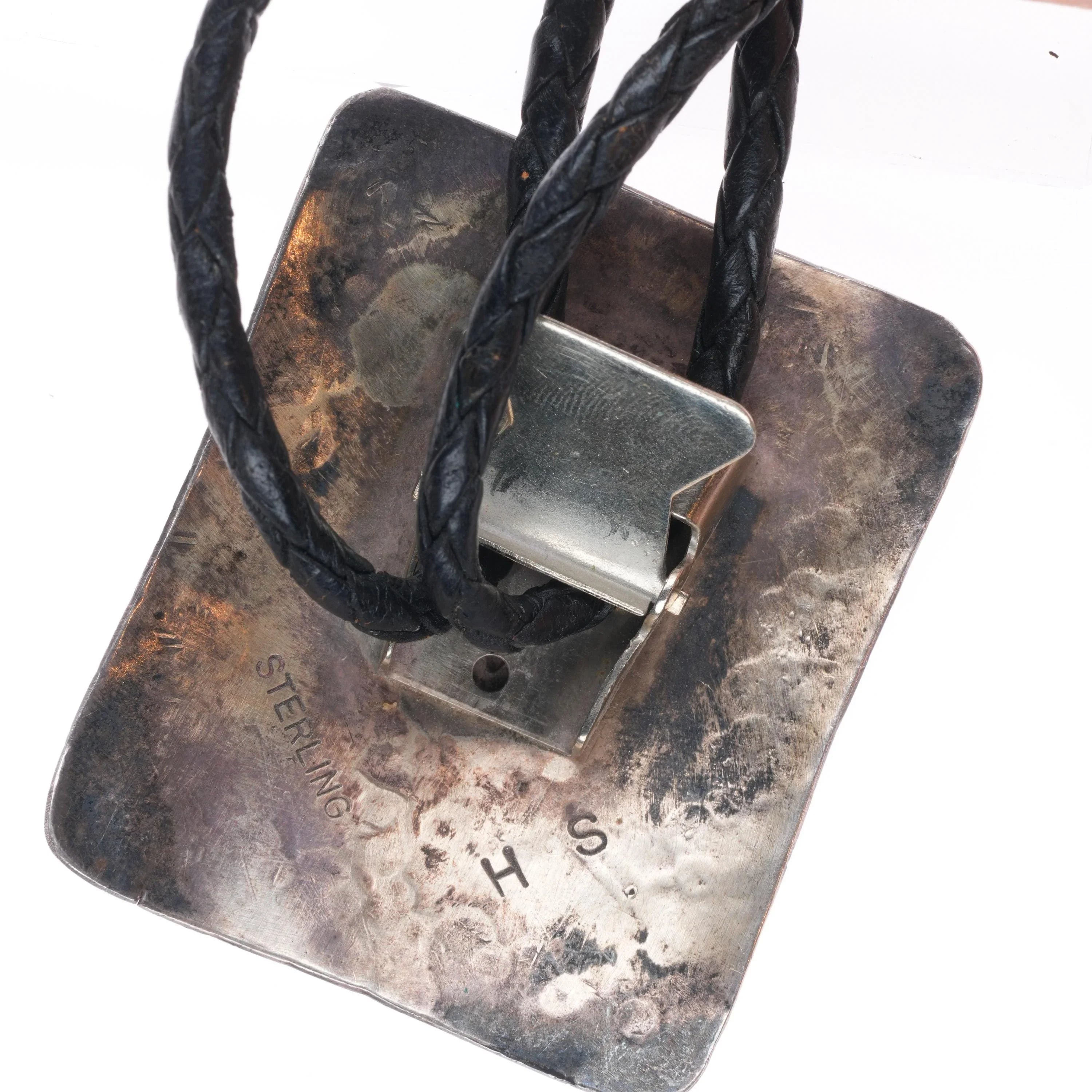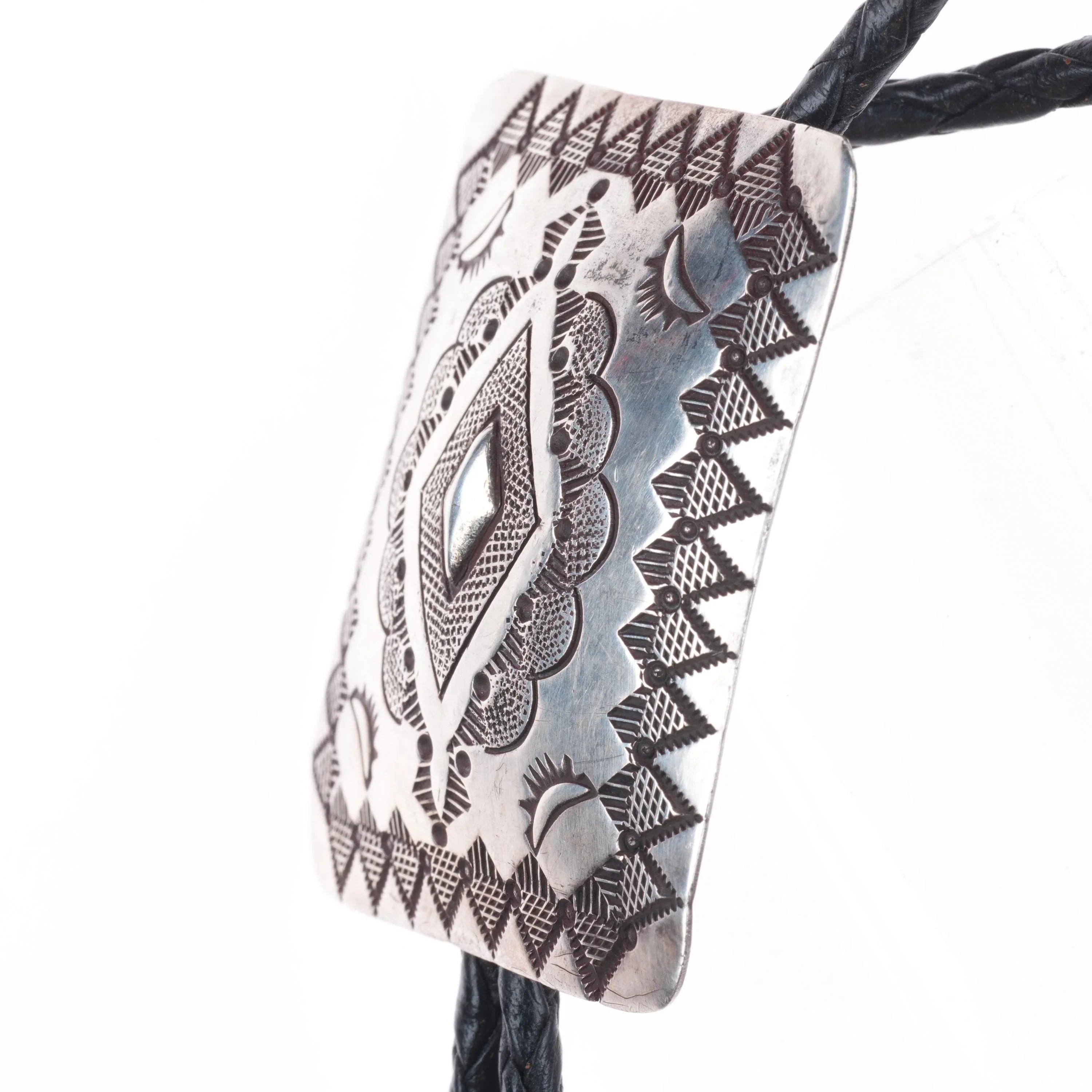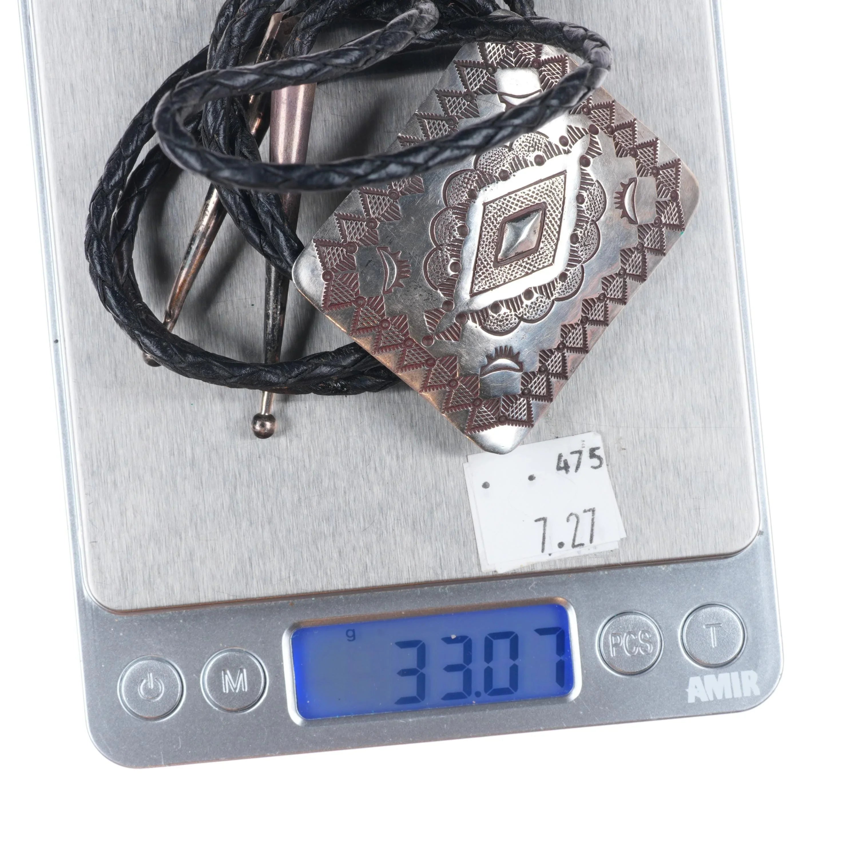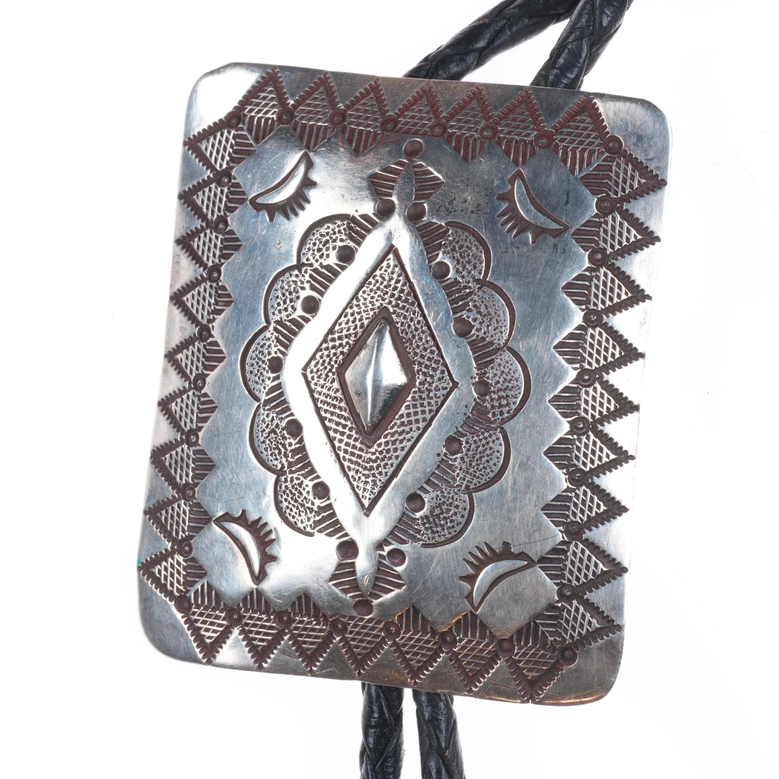 Vintage Herman Smith Navajo rug pattern sterling silver heavily stamped bolo tie. Tested and guaranteed solid sterling silver slide and tips. Weight and measurements in pictures. Great bolo, 41" long with no issues. Tray is tared out, so weight shown is just the bolo of course.