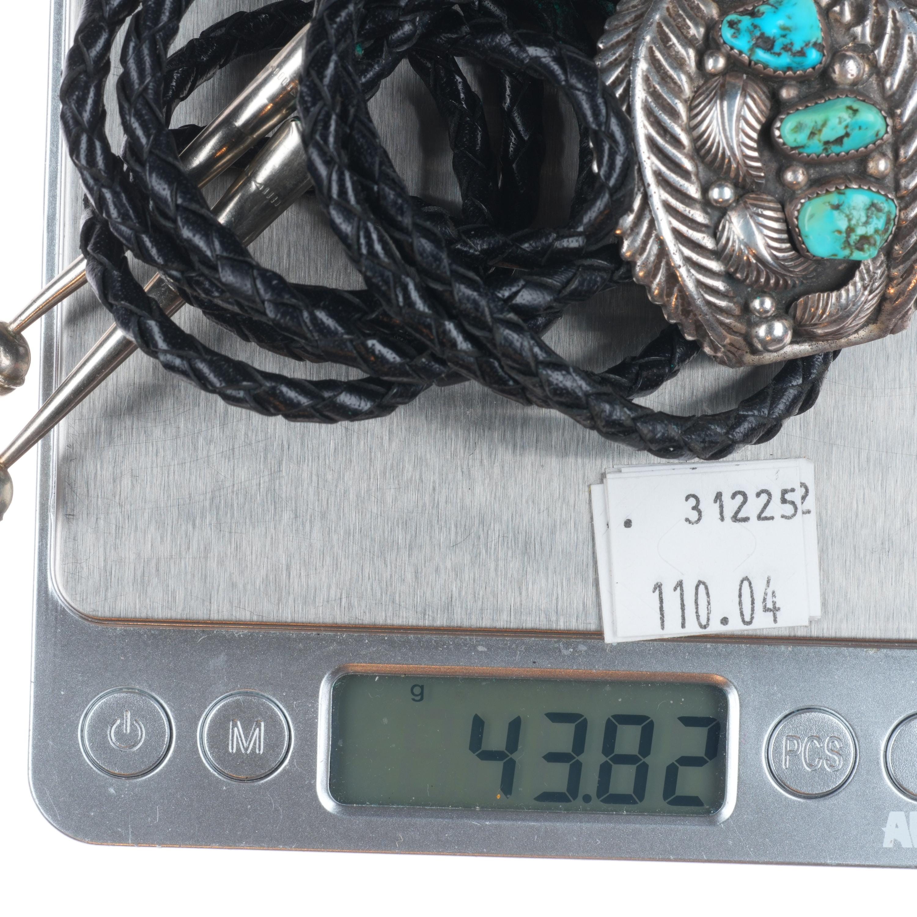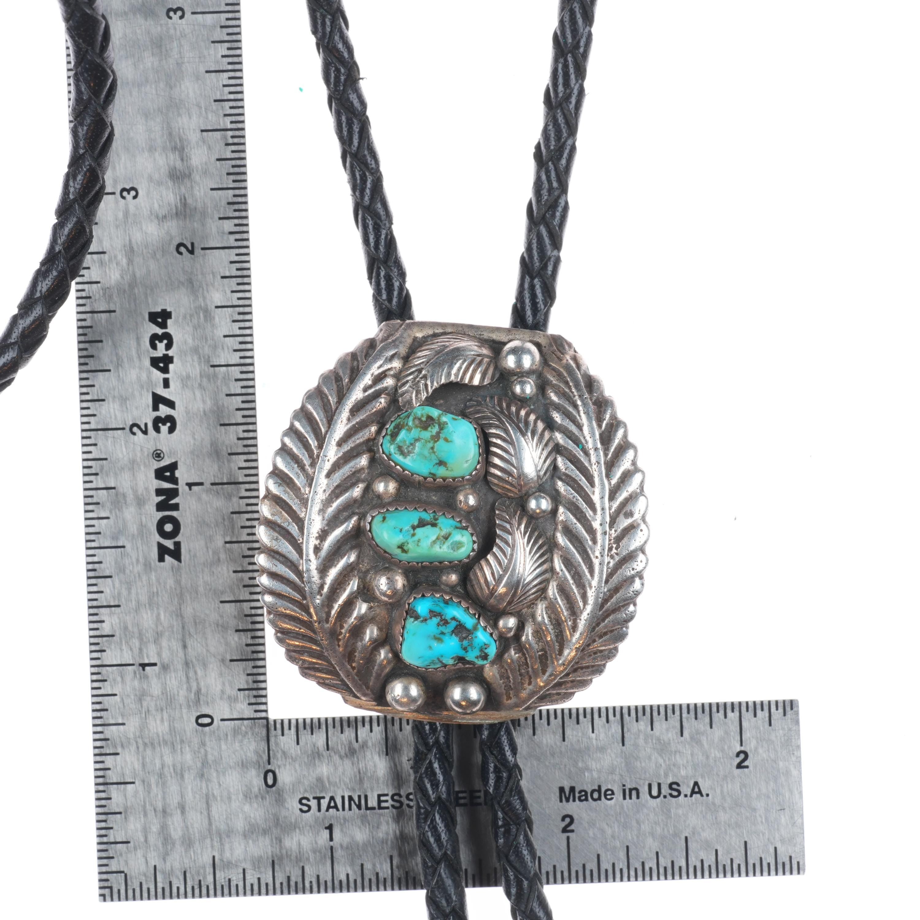 Vintage Navajo sterling silver and turquoise feather edge bolo tie. Tested and guaranteed solid sterling silver slide and tips. Weight and measurements in pictures. 41" long, there is some epoxy that is very securely holding the sterling front to the clip. I‘m not sure if this is a repair or if was something else that someone made a bolo out of. But it looks great when worn.
