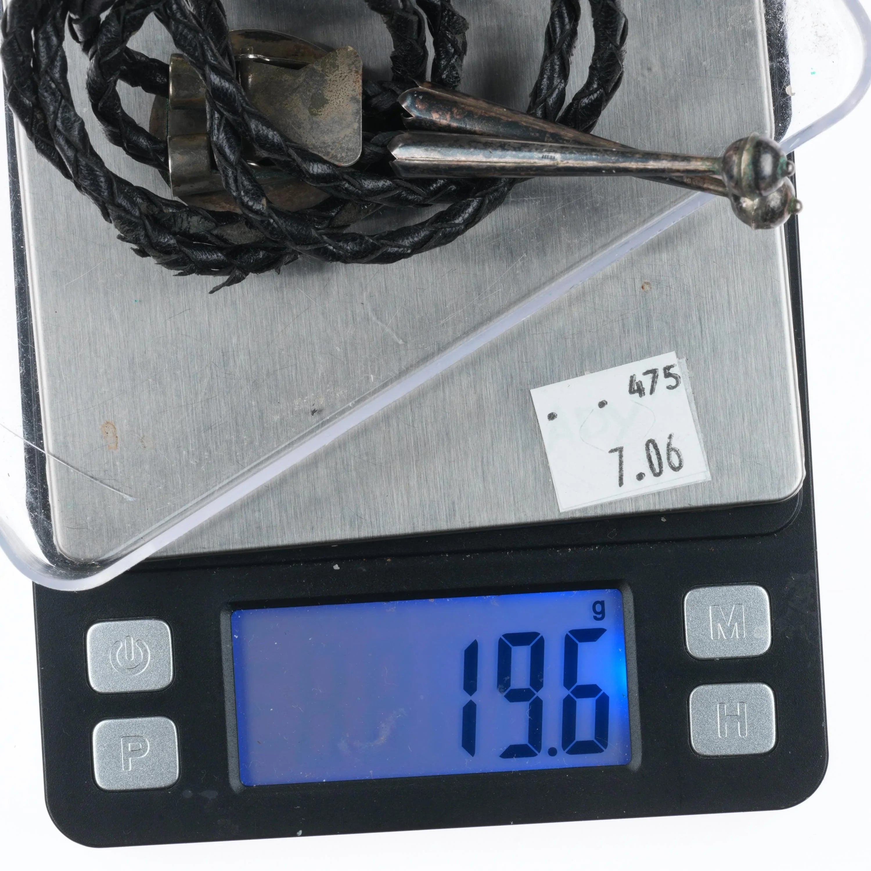 Vintage Navajo sterling silver bear paw shadowbox turquoise bolo tie. Tested and guaranteed solid sterling silver slide, tips not sterling. Weight and measurements in pictures. Great bolo, 38" long with no issues. Tray is tared out, so weight shown is just the bolo of course. No detectable markings.
