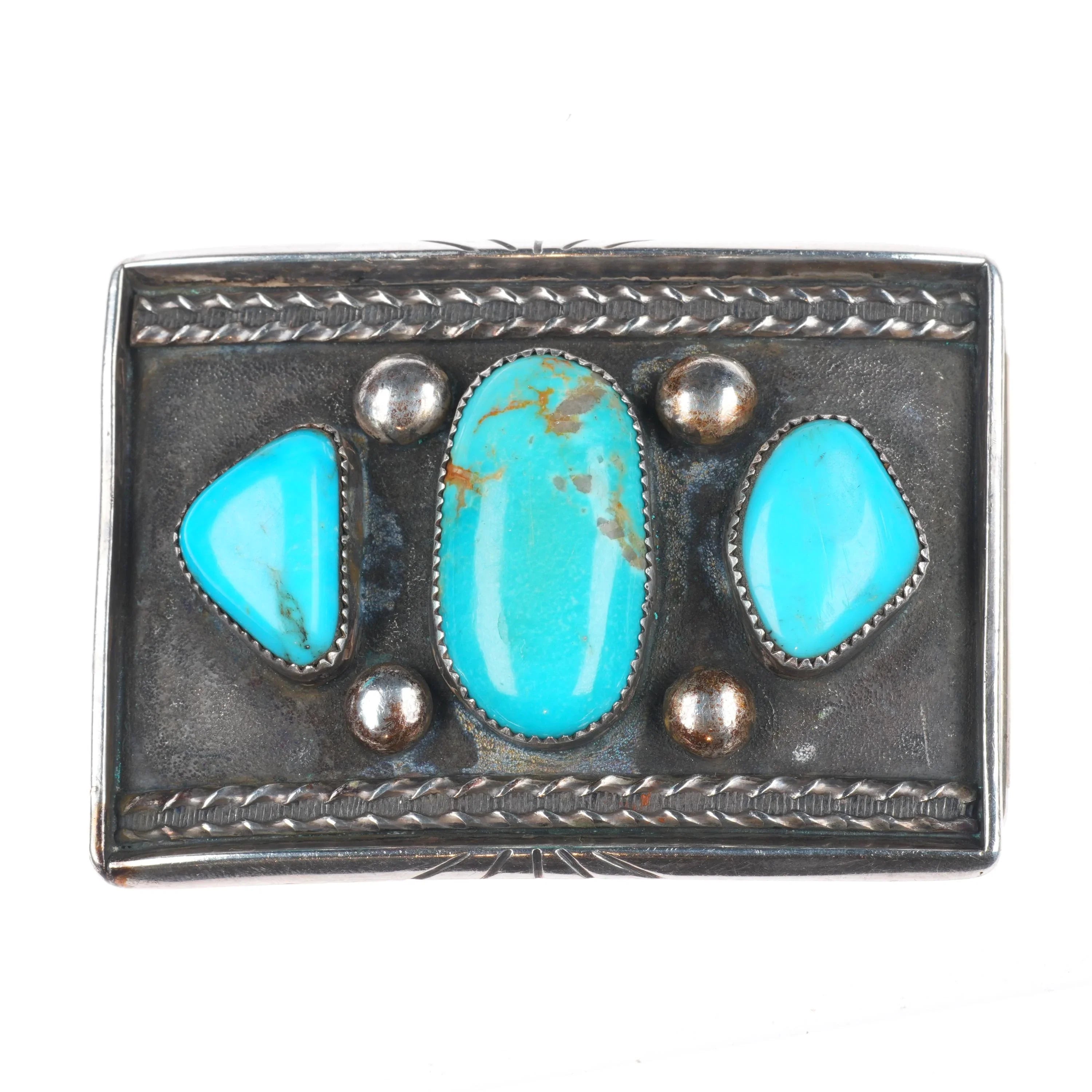 Vintage Navajo sterling silver belt buckle with three turquoise
