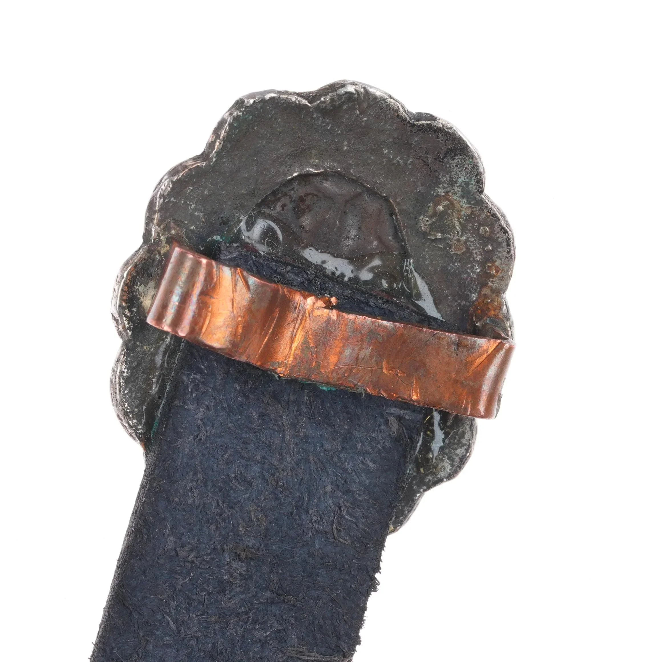 Vintage Navajo sterling silver concho hatband for cowboy hat on leather belt. Tested and guaranteed sterling silver. Weight and measurements in pictures, 10 conchos with no buckle. The end just slides under the copper loop for the last concho Fits up to a 26" hat but can of course be worn shorter.