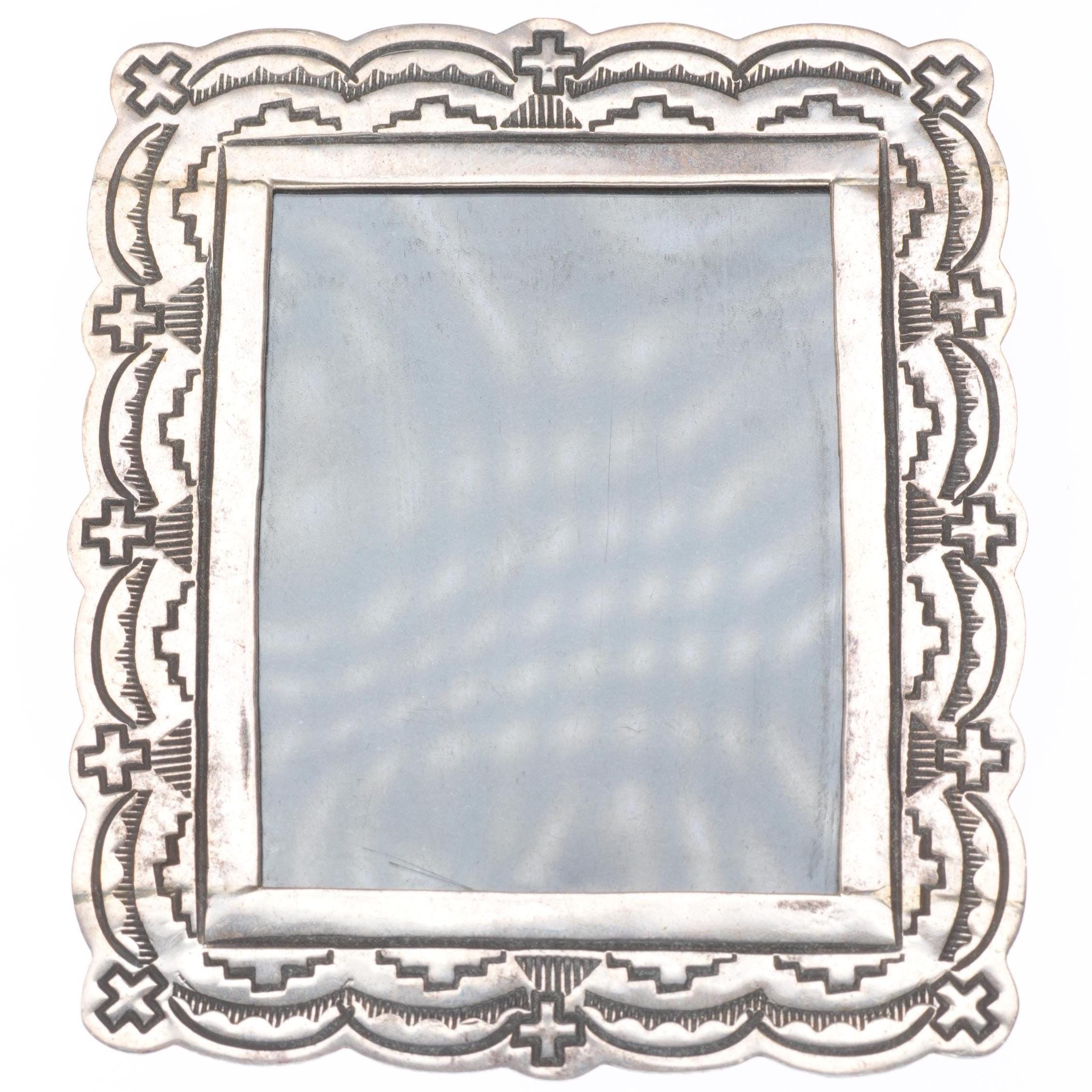 Vintage Navajo sterling silver hand stamped picture frame. Weight and measurements in pictures. Tested and guaranteed solid sterling silver with no issues, circa last quarter of the 20th century. Unresearched arrow hallmark attributed to Navajo tribe.