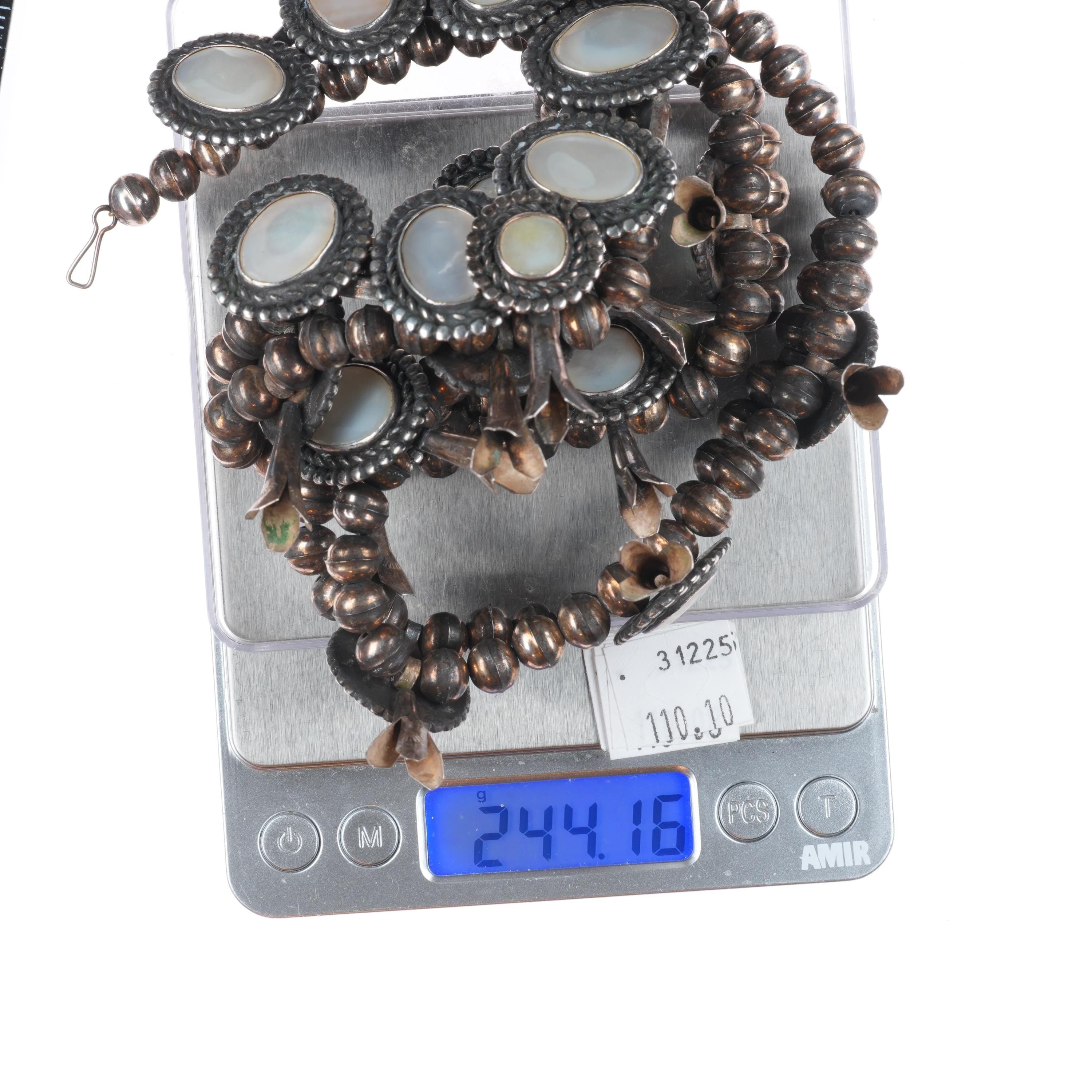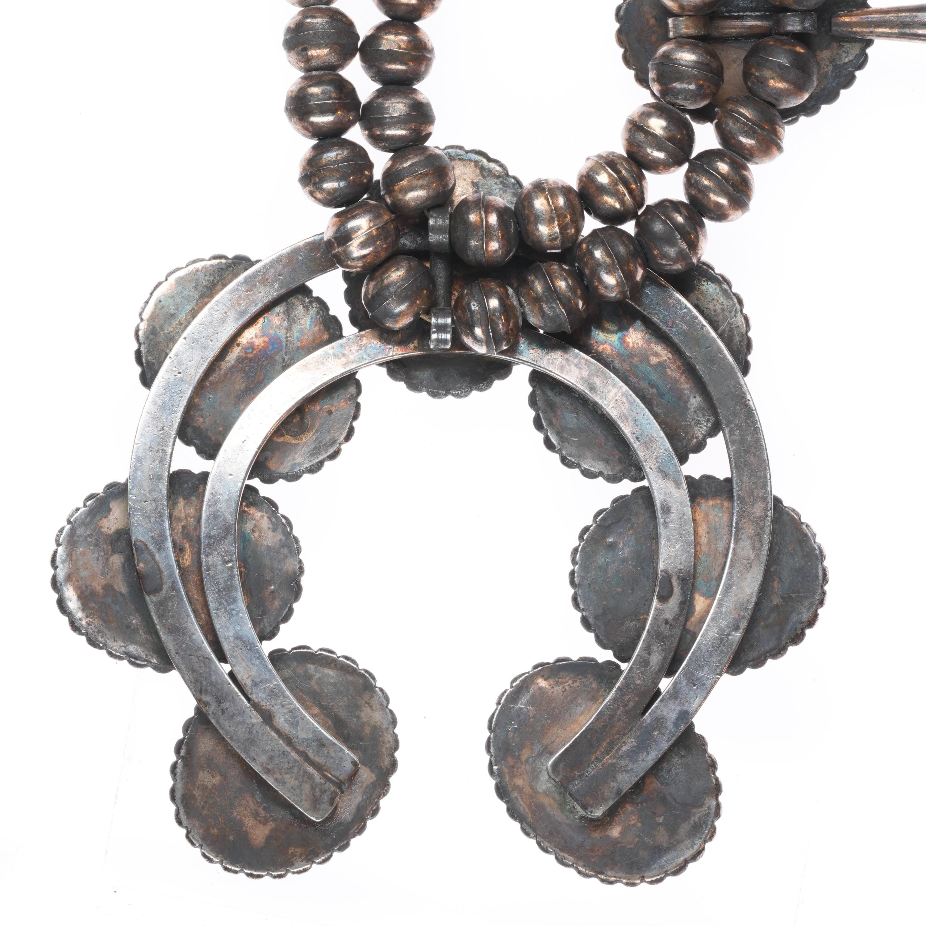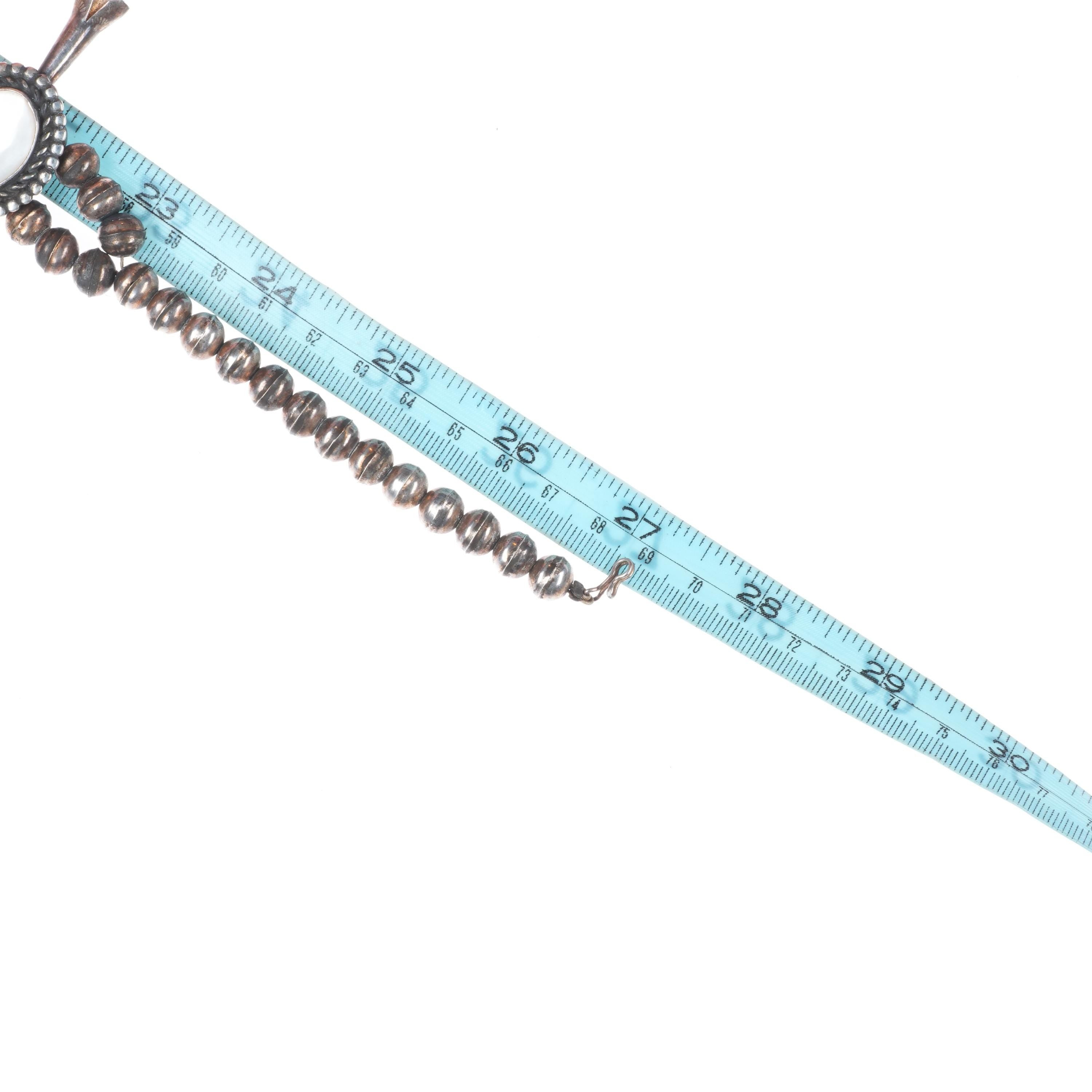 27" long Vintage Navajo sterling silver mother of pearl squash blossom necklace/earrings. Solid sterling silver tested and guaranteed with weight and measurements in the pictures. Circa third quarter of the 20th century. No apparent markings. No significant issues 244 grams total weight.