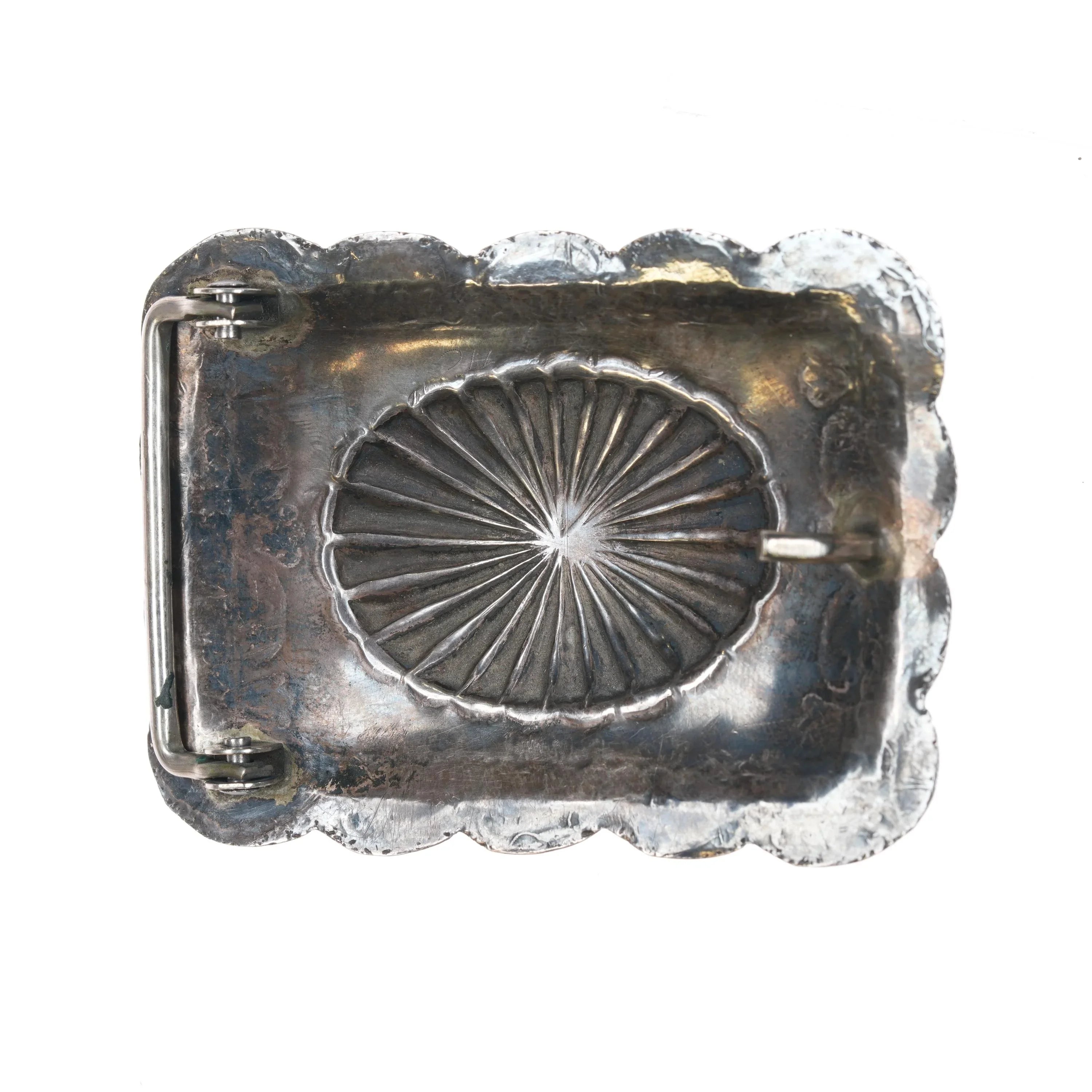 Vintage Navajo sterling silver nicely stamped belt buckle with center turquoise
