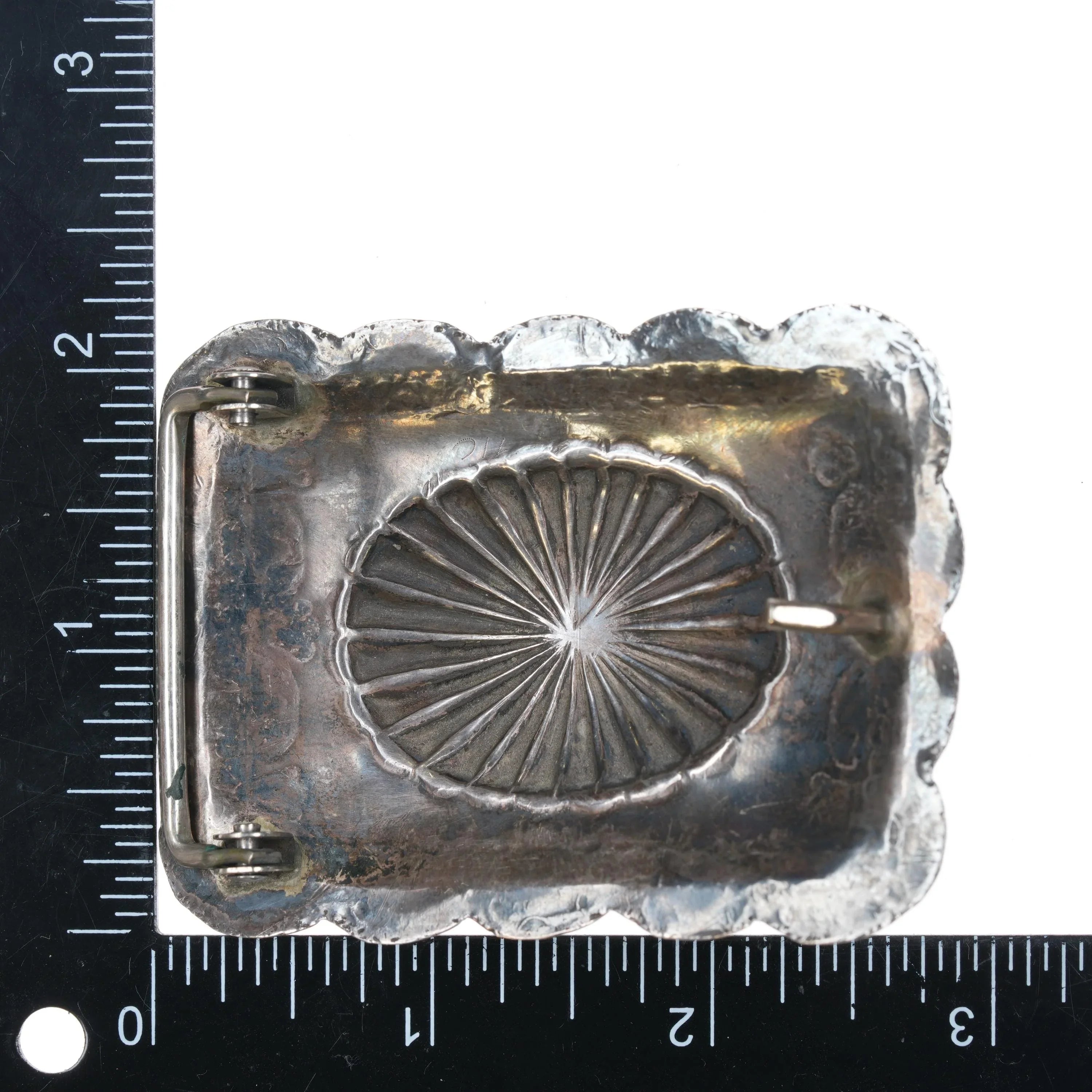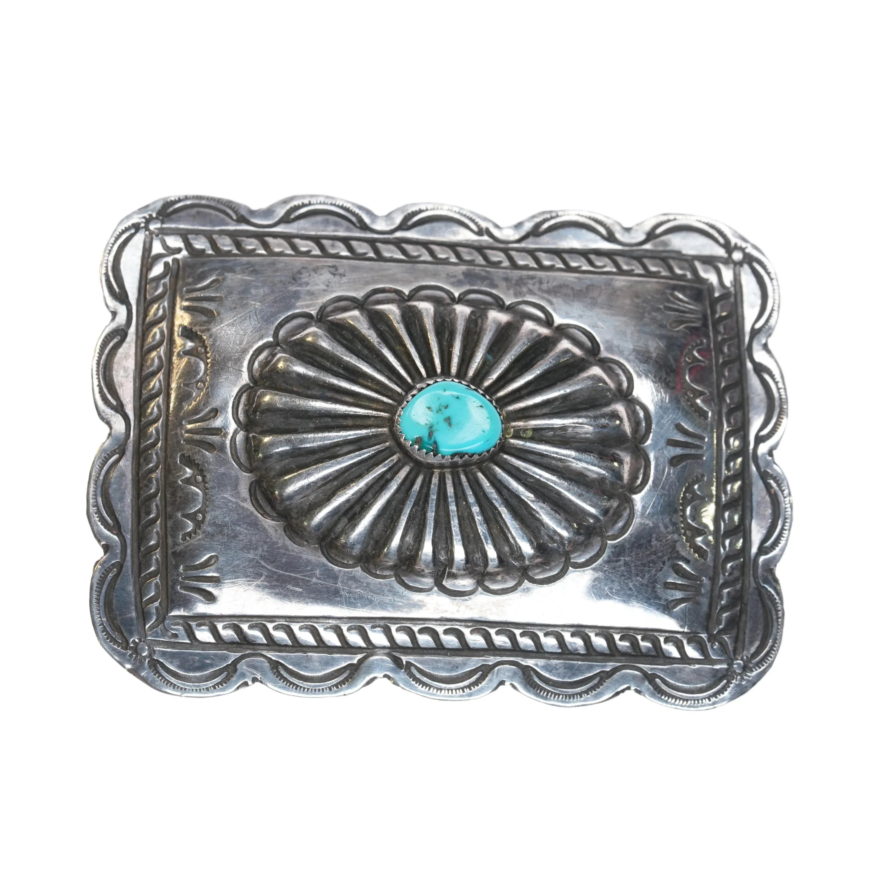 Vintage Navajo sterling silver nicely stamped belt buckle with center turquoise. Solid sterling silver (tested) with weight and measurements in pictures.. Fits a 1.5" belt. No issues, apparently unmarked.