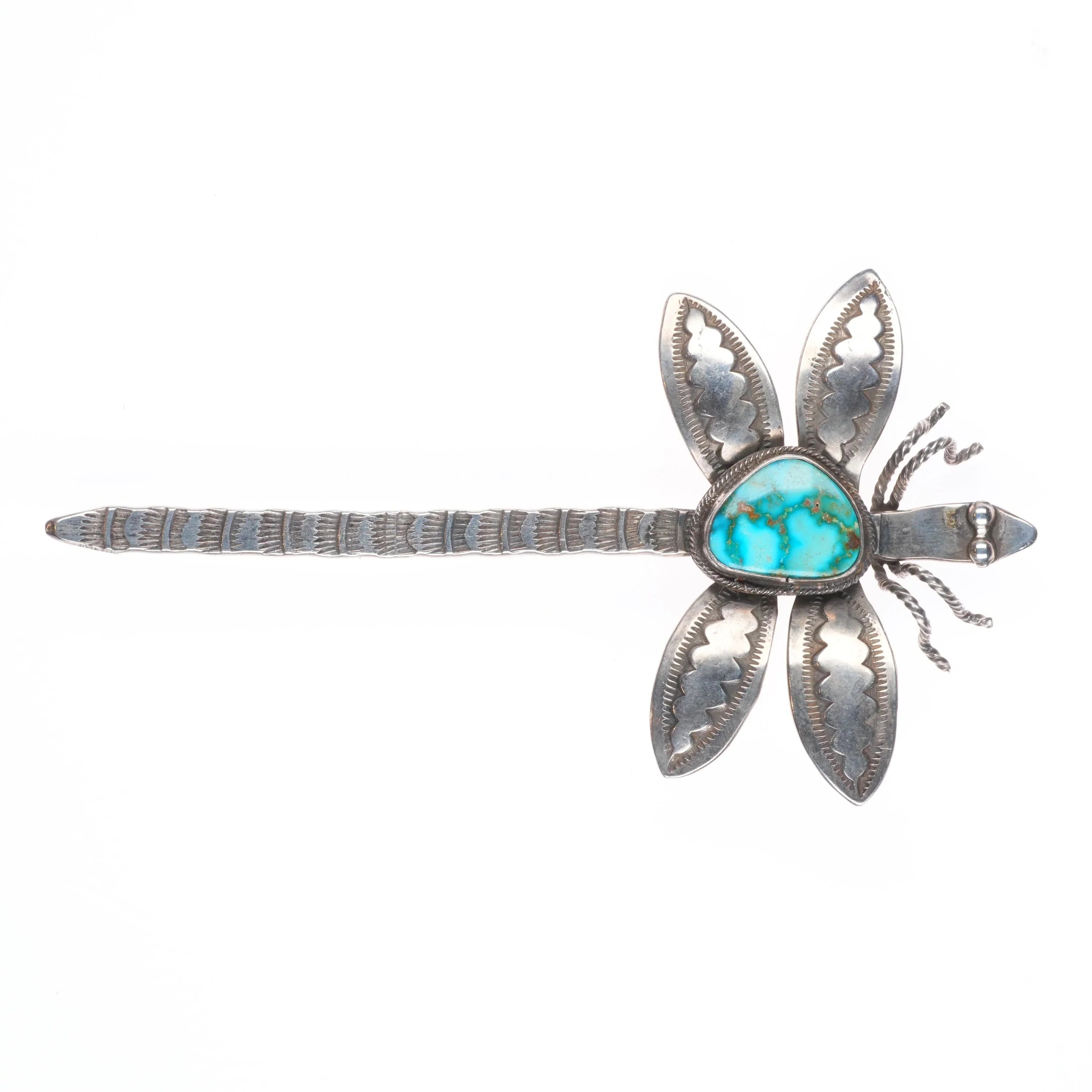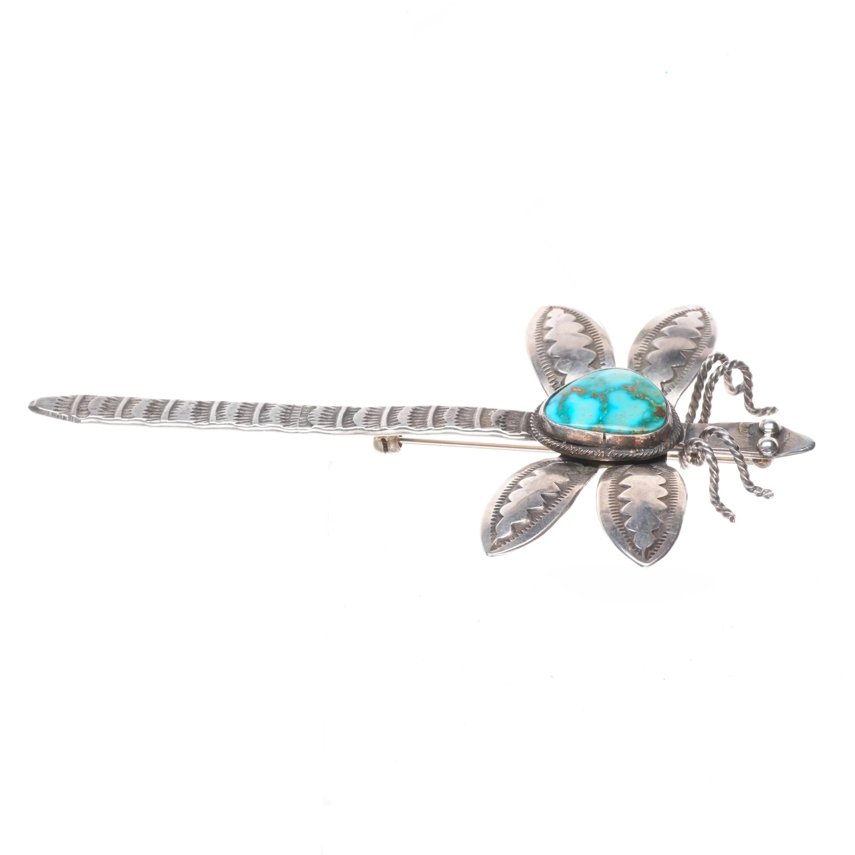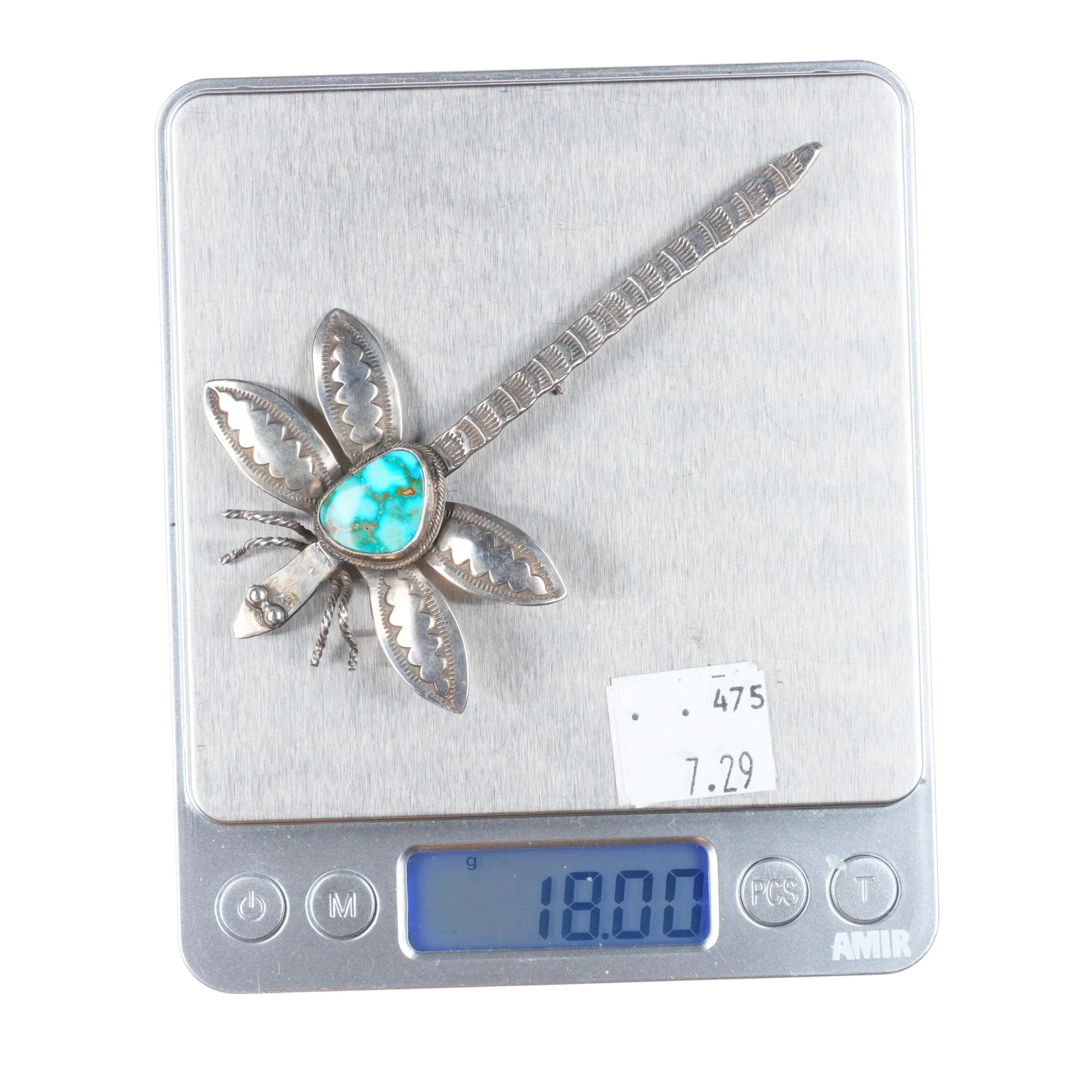 Vintage southwestern sterling silver dragonfly pin/brooch - high grade turquoise. Weight and measurements in pics, all solid sterling. Tested and guaranteed solid sterling silver. Circa last quarter of the 20th century.