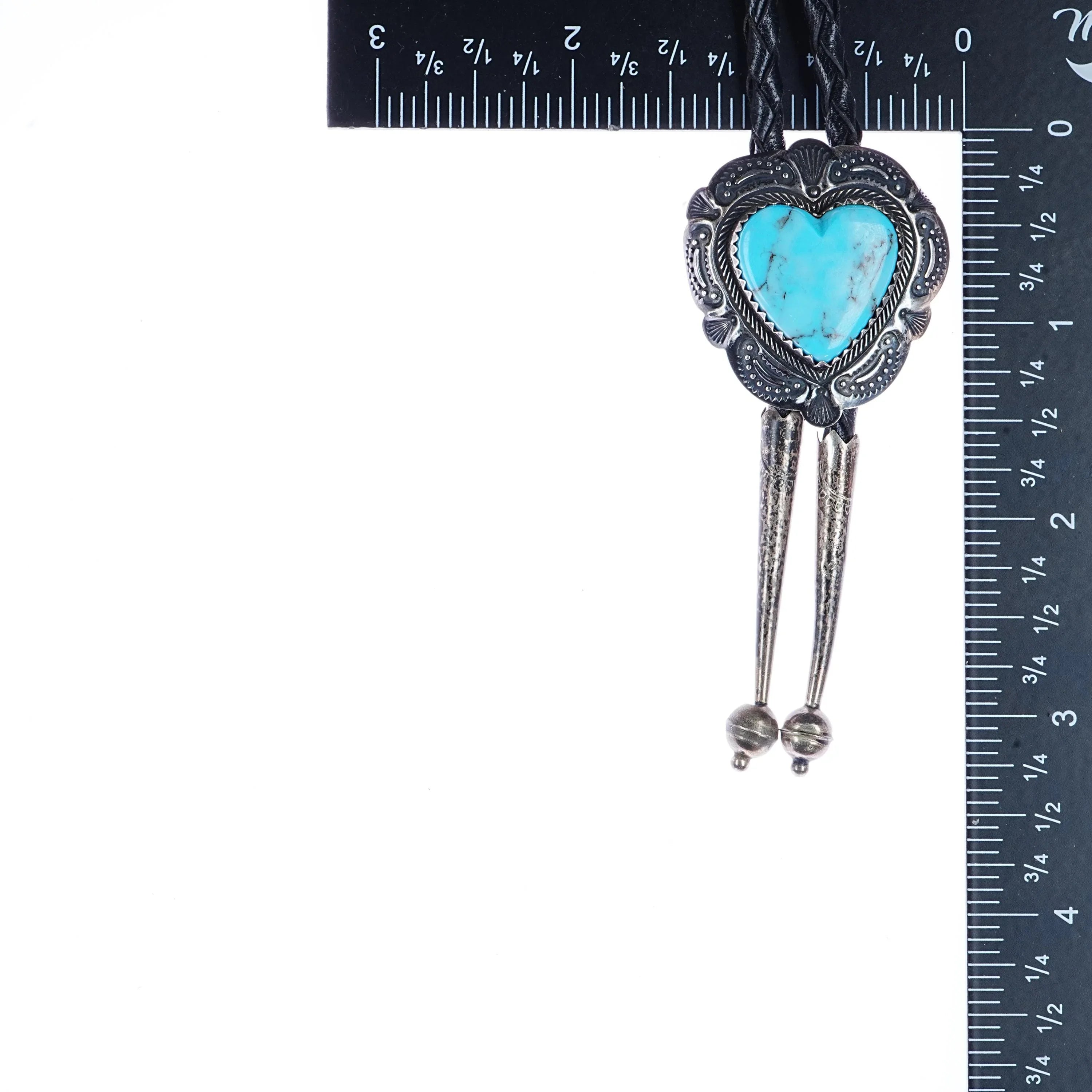 Vintage Southwestern sterling silver heart bolo tie. Solid sterling silver, weight and measurements in pics (scale tared out with containter, weight shown is just the bolo). Fully functional with overall attractive appearance. 38" total length. Sterling slide and tips.
