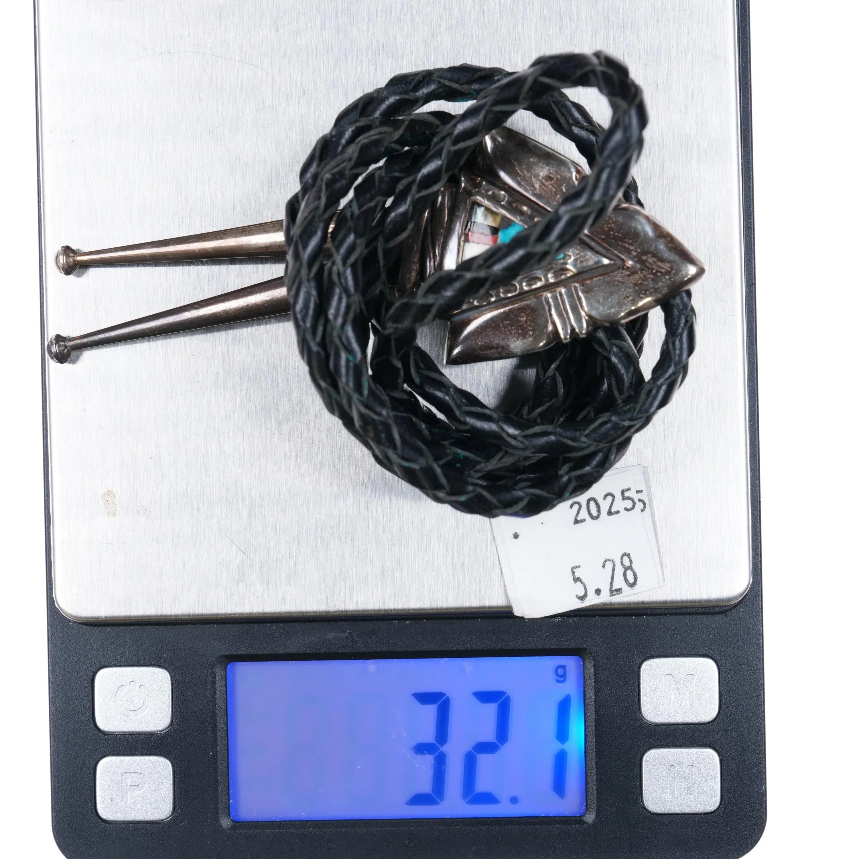 Vintage Southwestern sterling silver inlaid turquoise arrowhead form bolo tie. Solid sterling silver slide (tested), slide and tips. Weight and measurements in pictures. Great bolo with no issues. 38" long. No apparent markings.