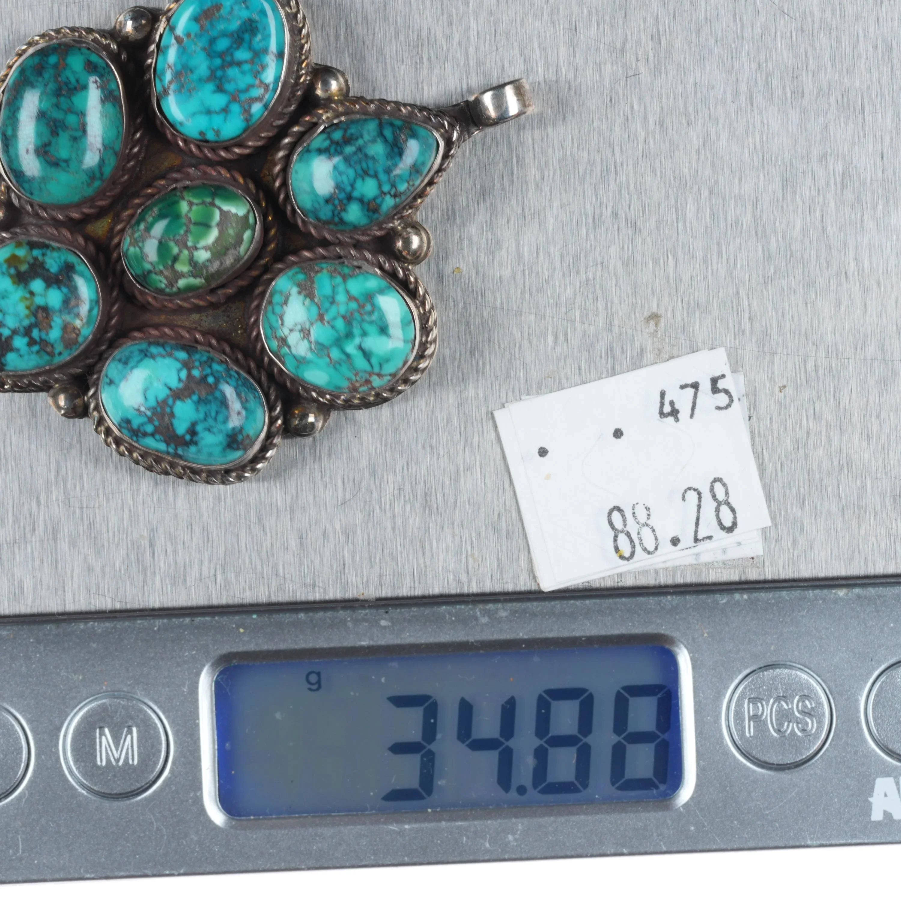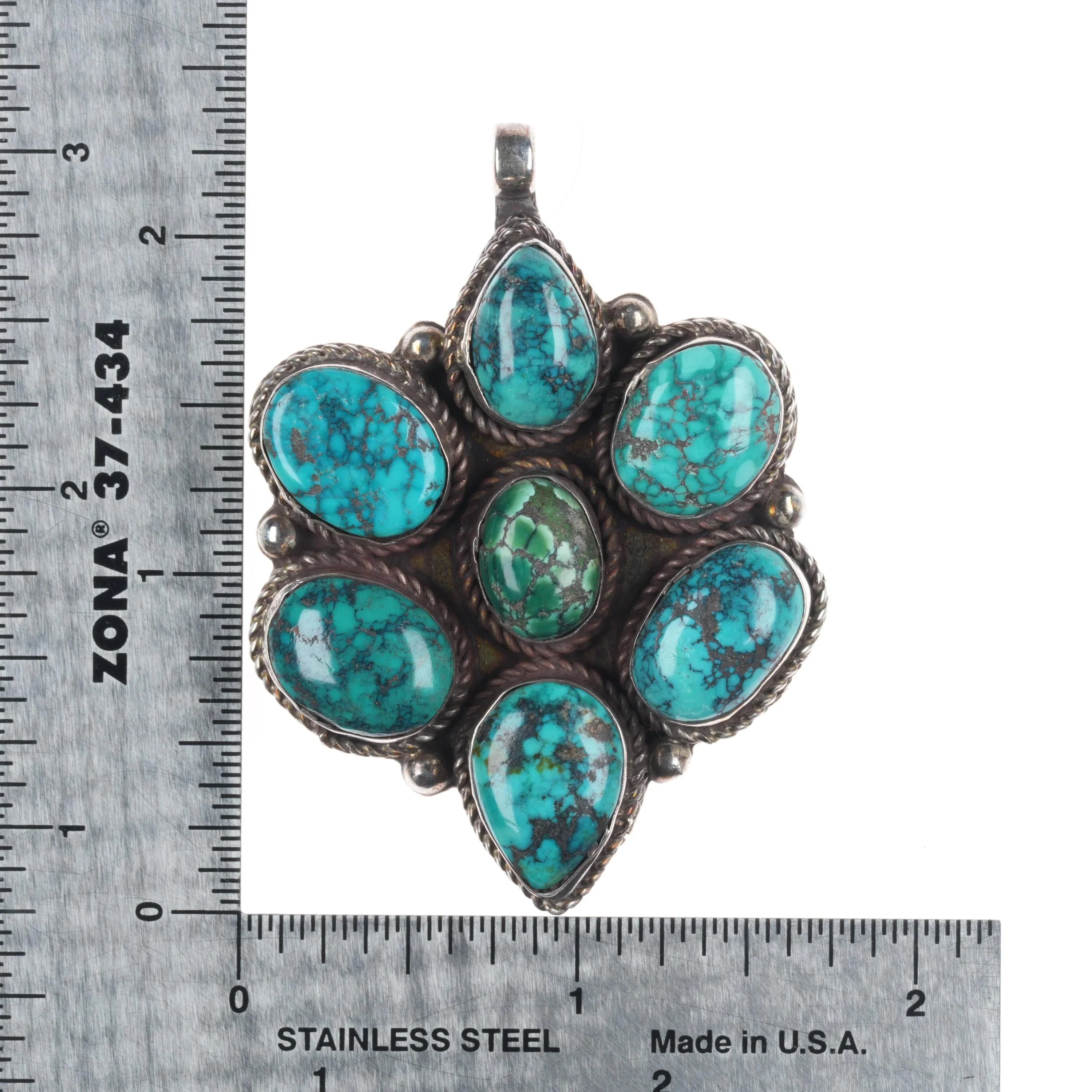 Vintage Southwestern sterling silver spiderweb turquoise cluster pendant. Solid sterling silver tested and guaranteed with weight and measurements in the pictures. No issues, circa third quarter of the 20th century.