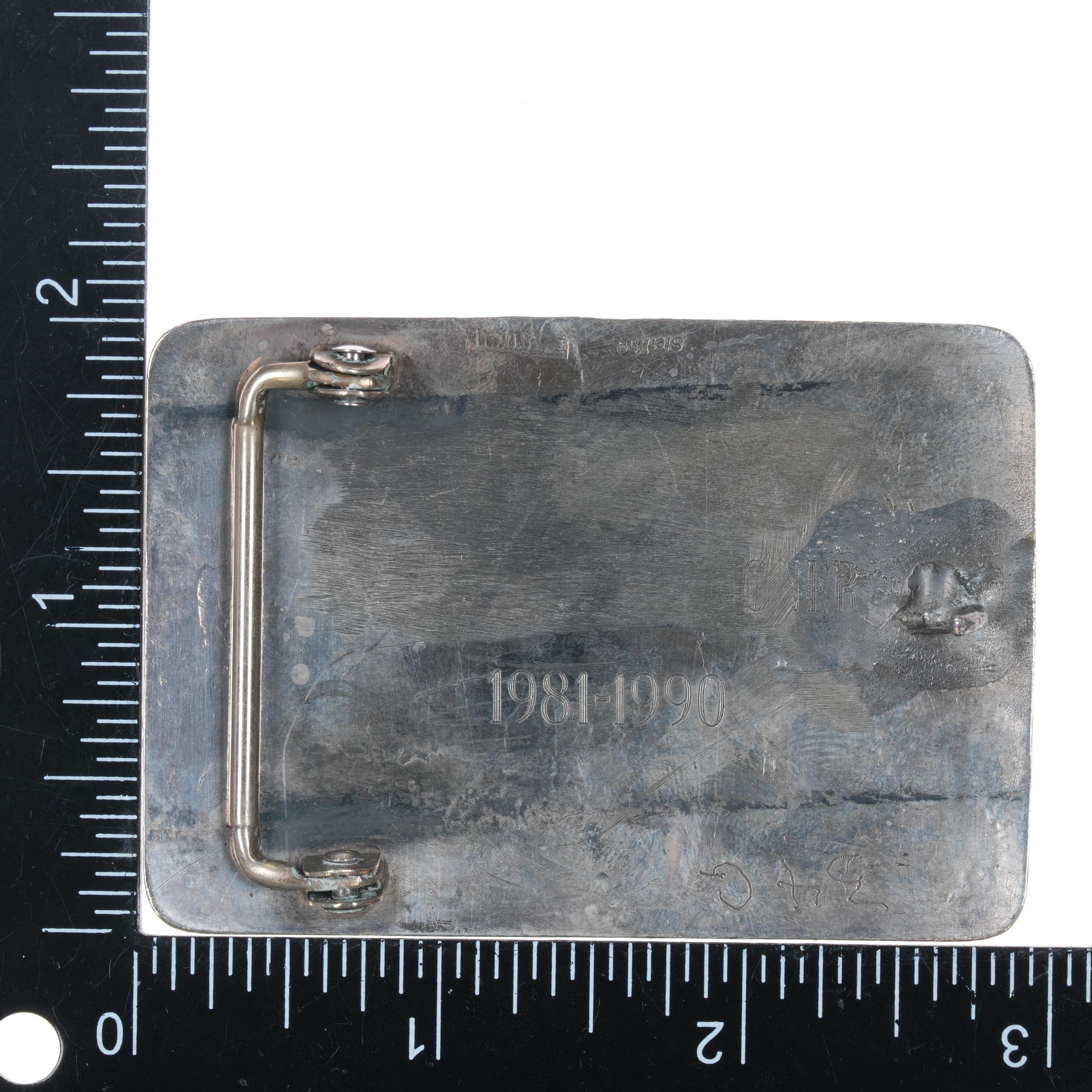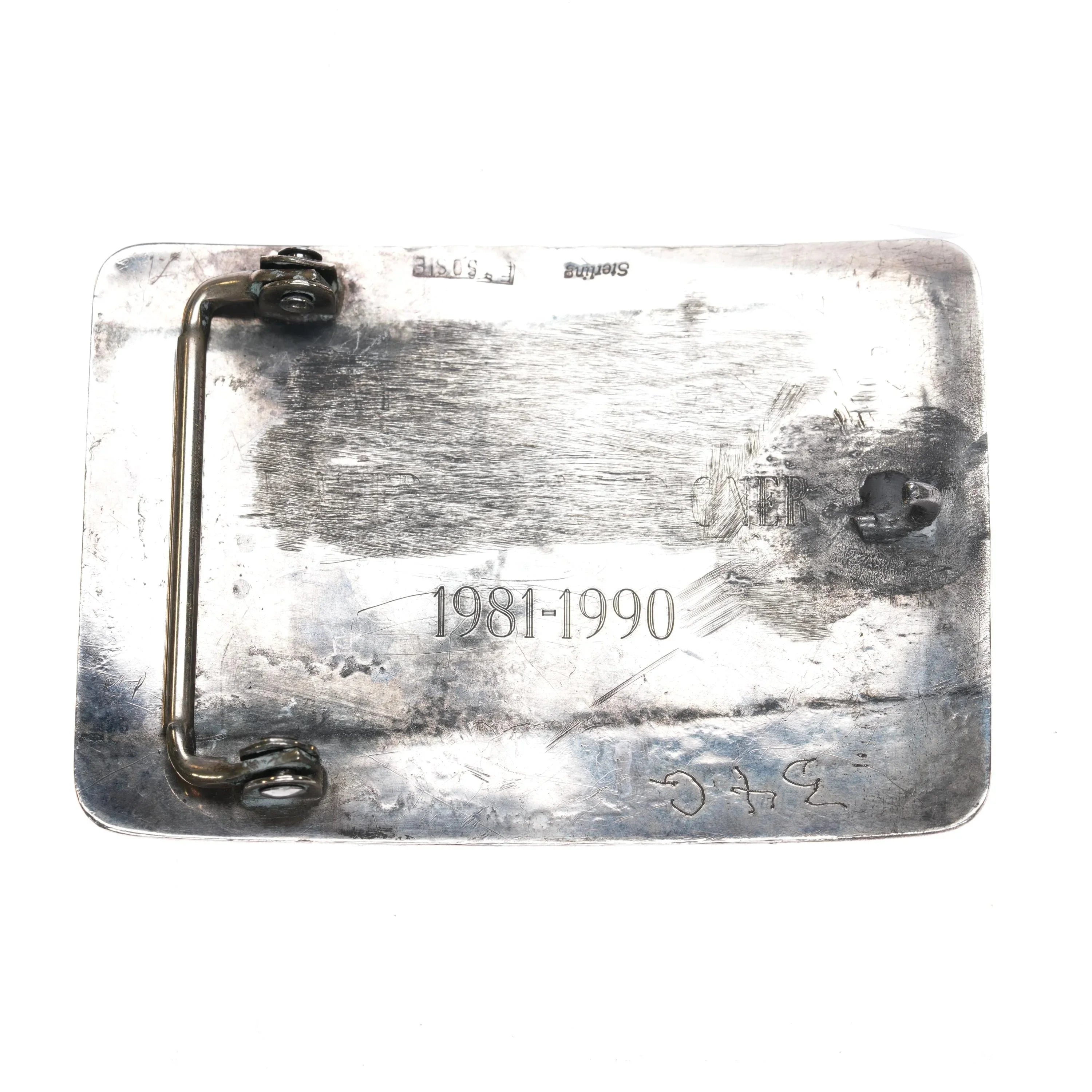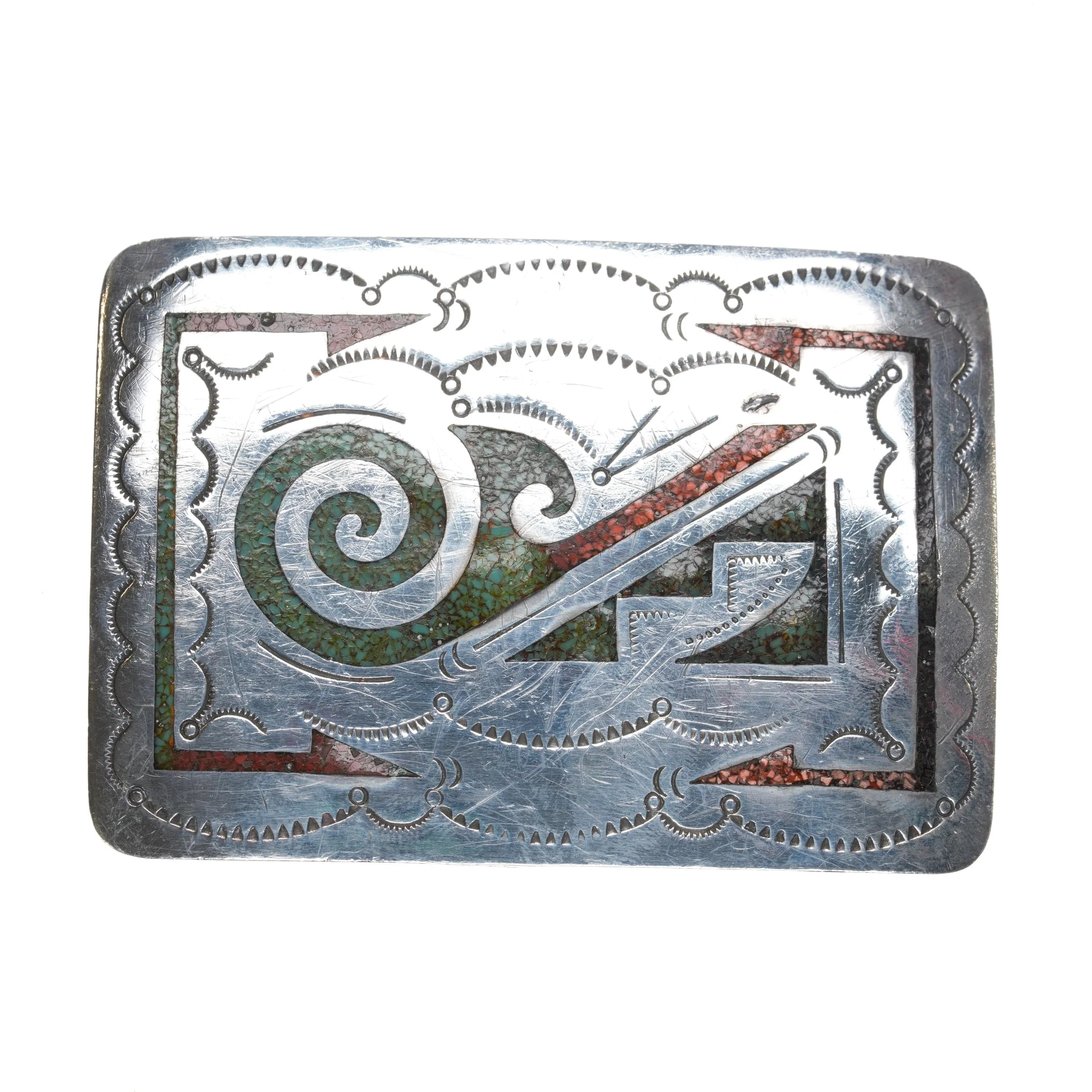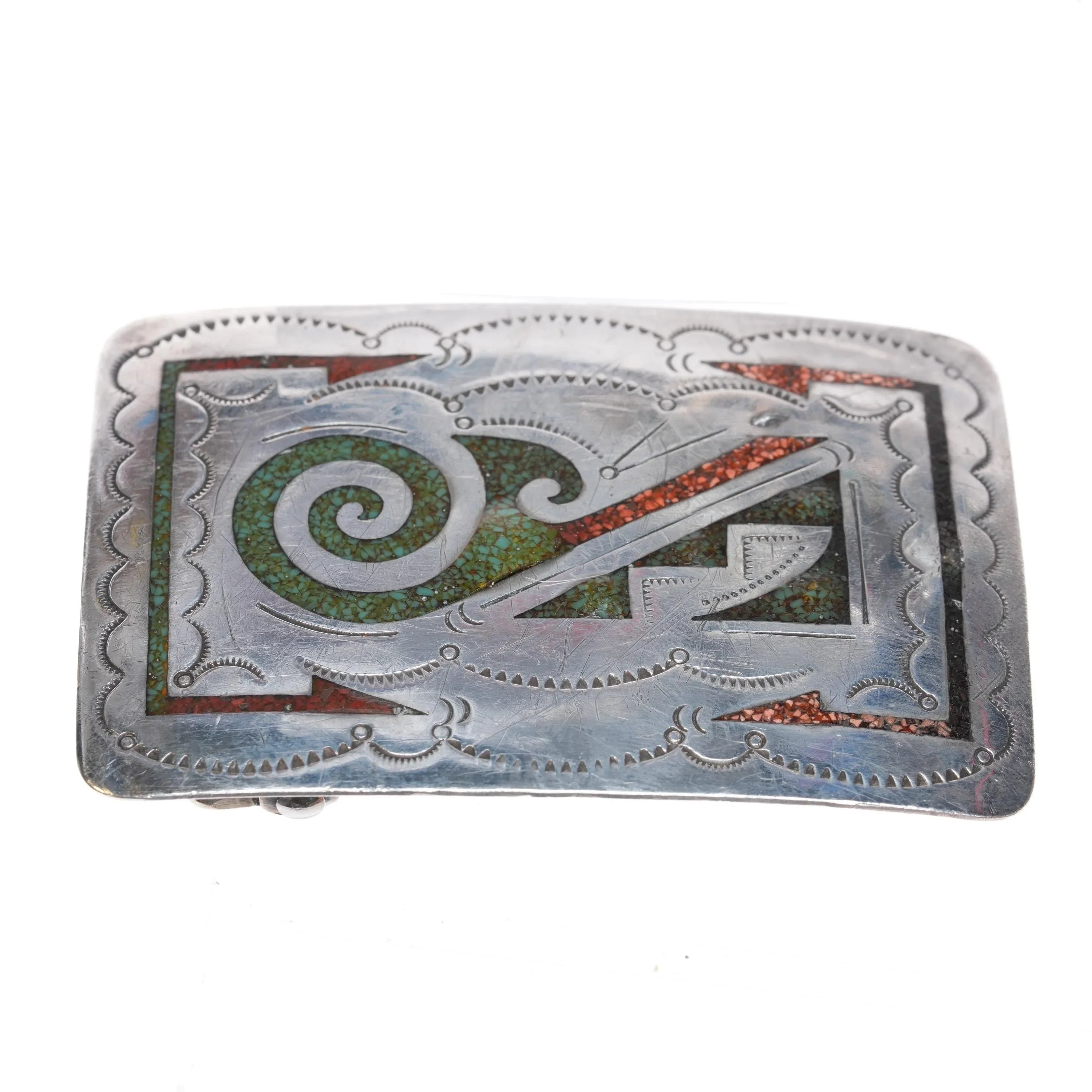 Vintage sterling silver Navajo chip inlay belt buckle. Solid sterling silver and with weight and measurements in the pictures. Fully functional with age appropriate wear, no damage unless noted. Marked as shown, fits up to a 1.5" belt. Monogram on back, significant wear with a few small dents. Marked sterling.
