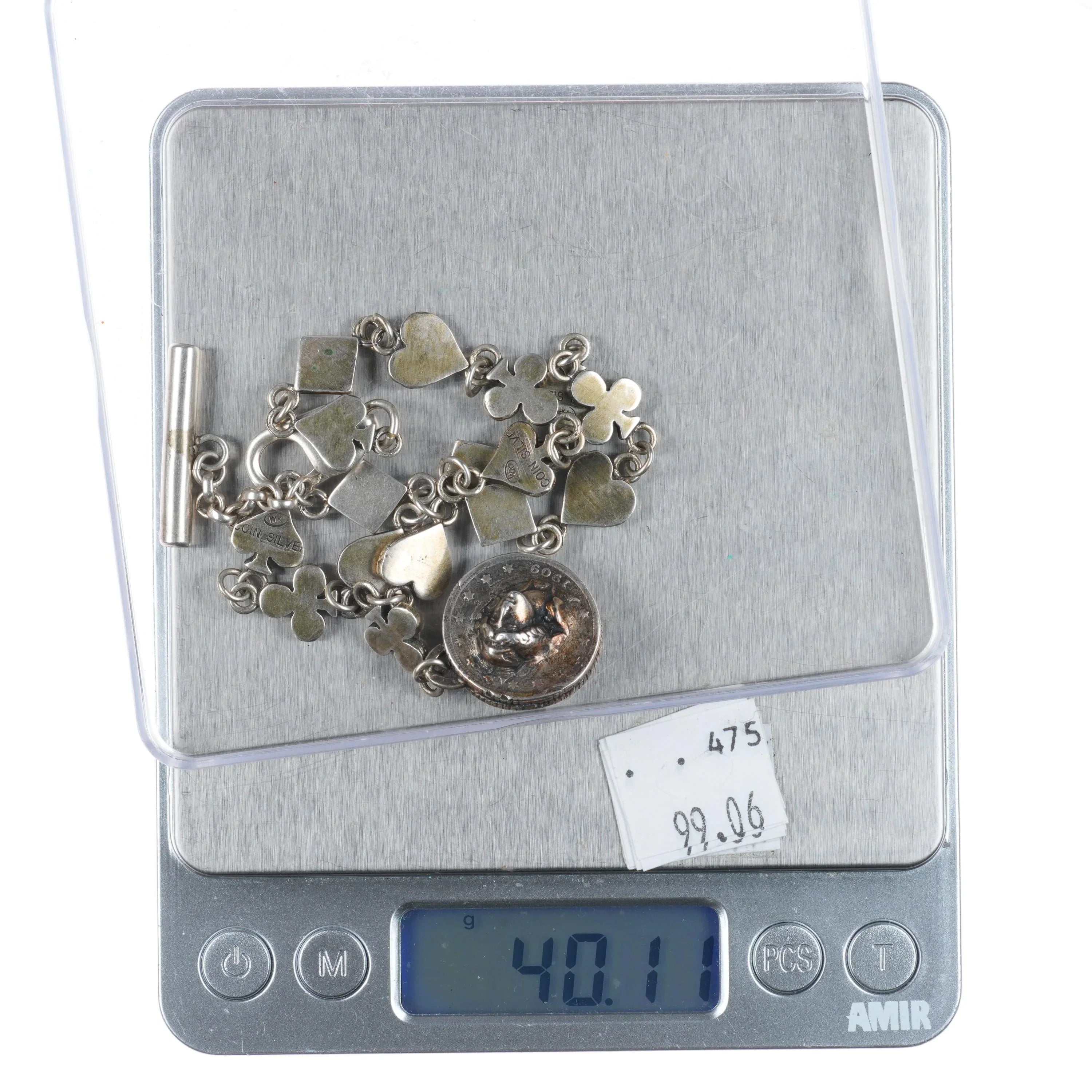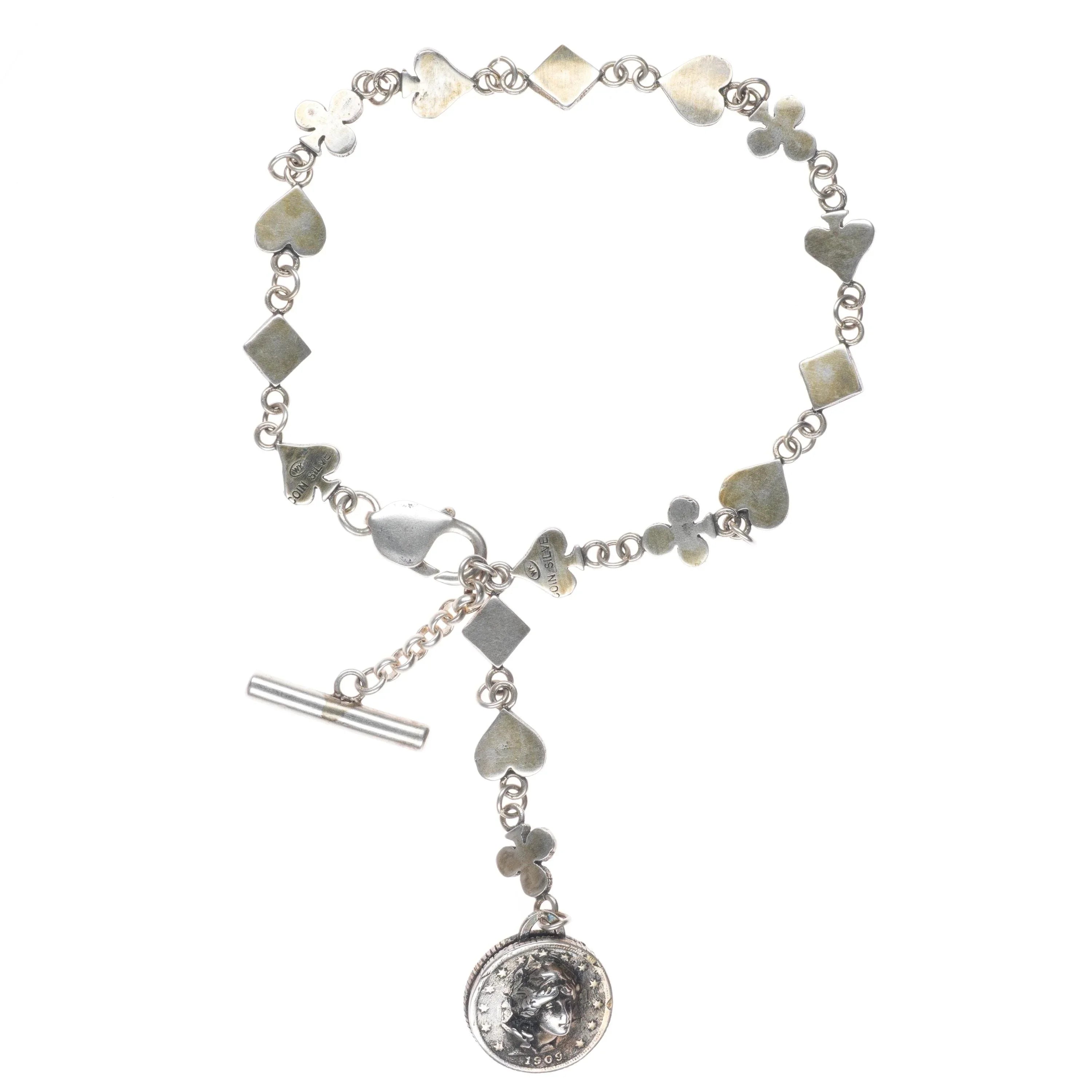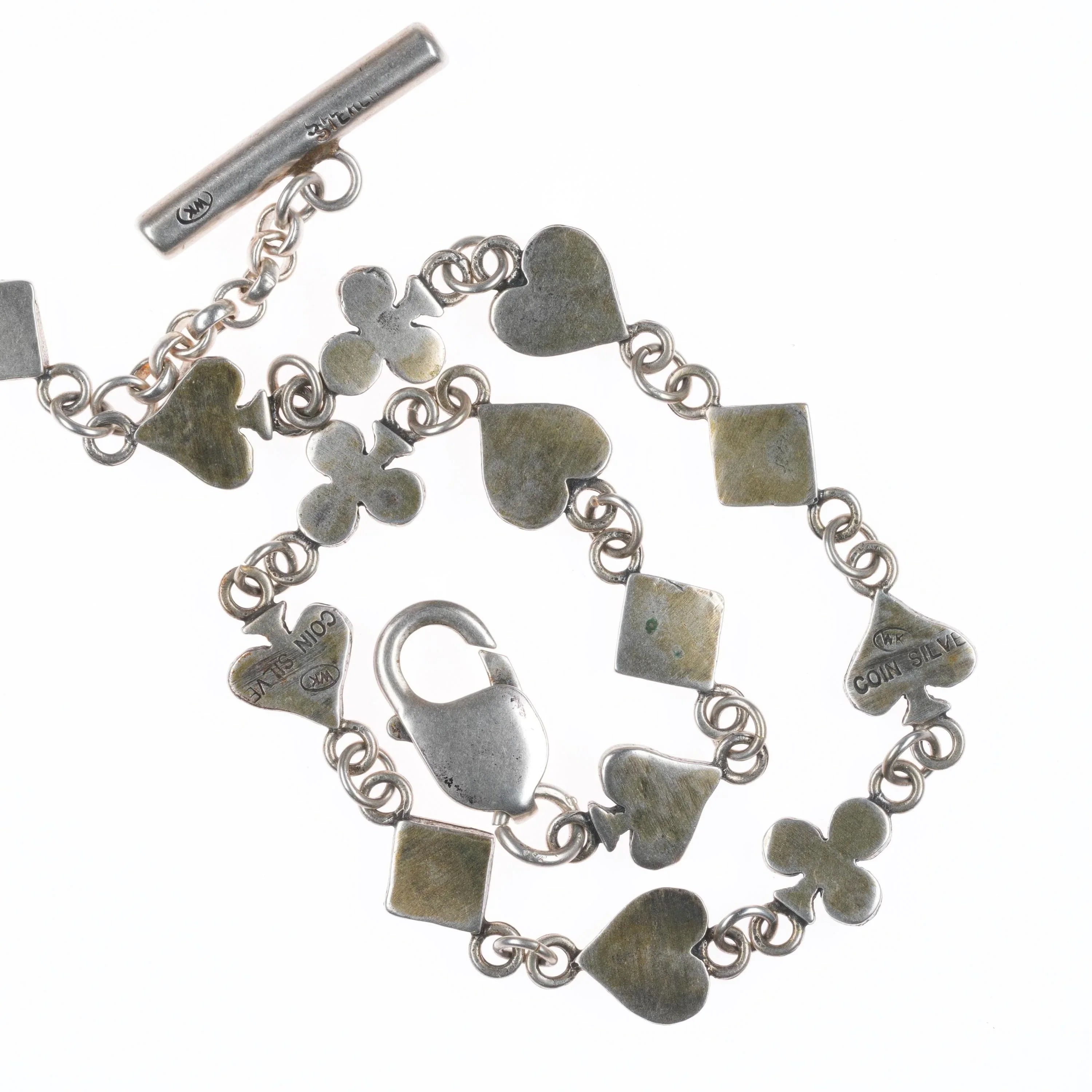 Vintage WK Coin silver watch fob anklet/choker necklace card symbols. Weight and measurements in pictures, solid sterling silver no issues.. Signed on back as shown. Circa last quarter of the 20th century. Really not sure if it‘s big enough for a choker, and would be a weird anklet....so probably just a watch fob unless you want to be creative.