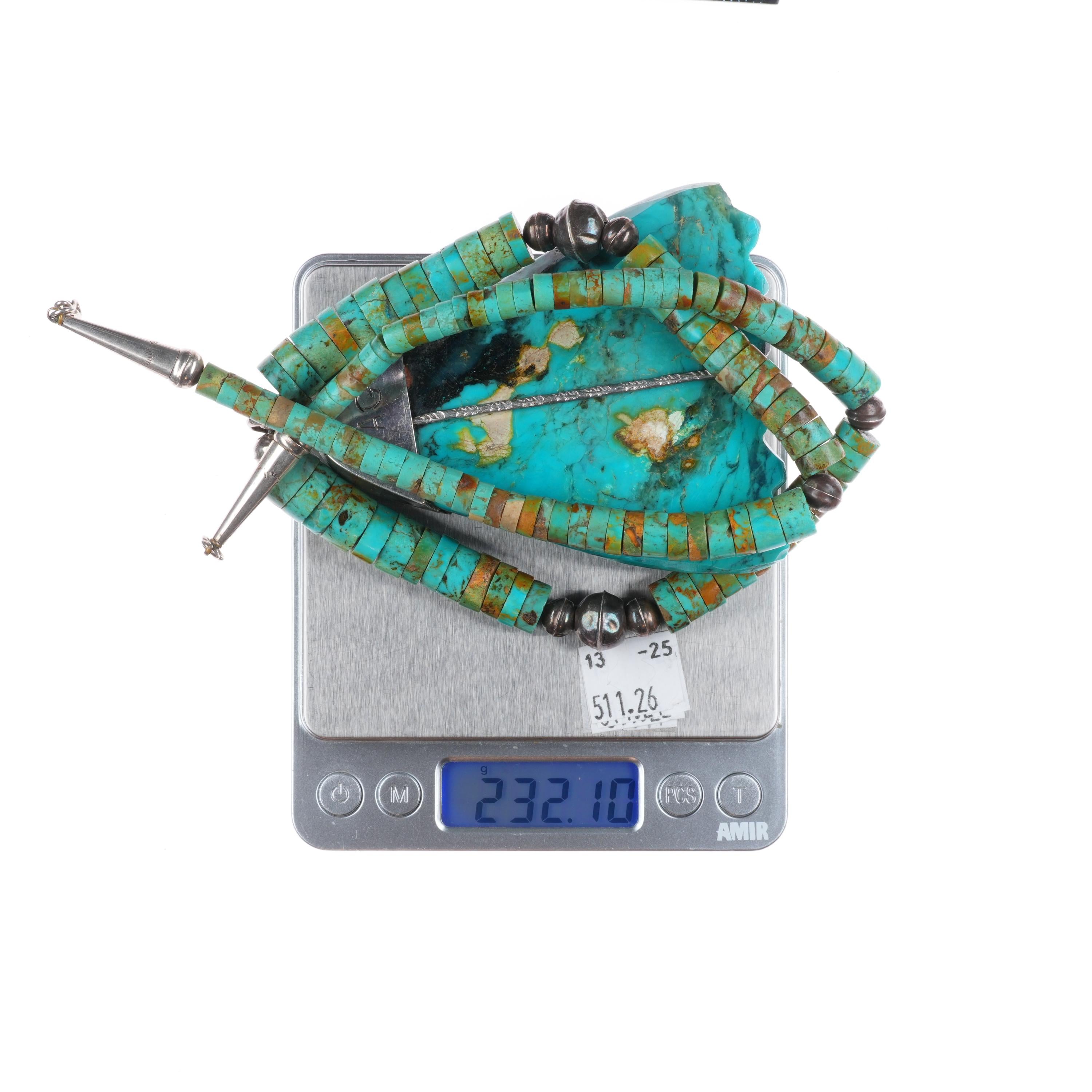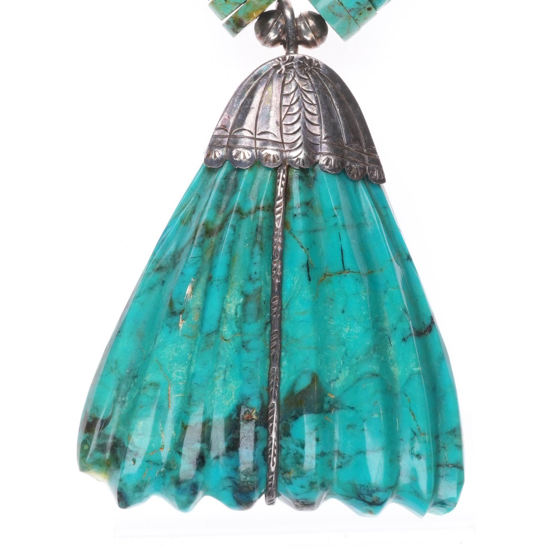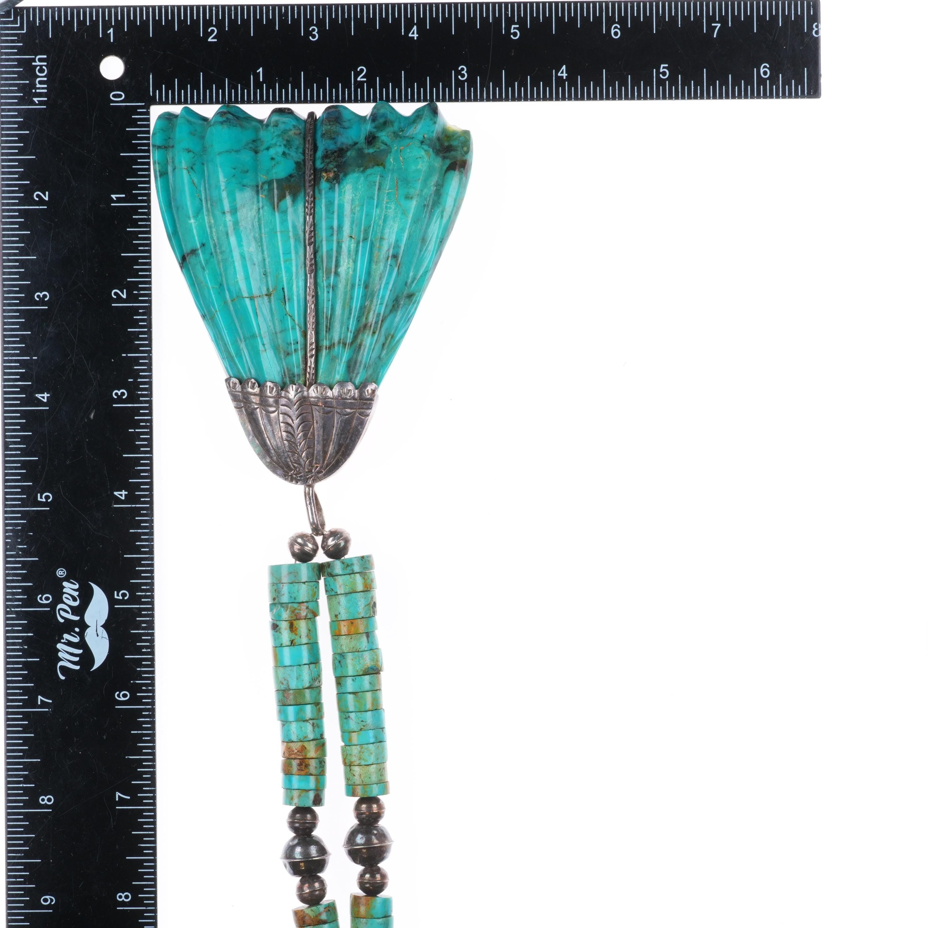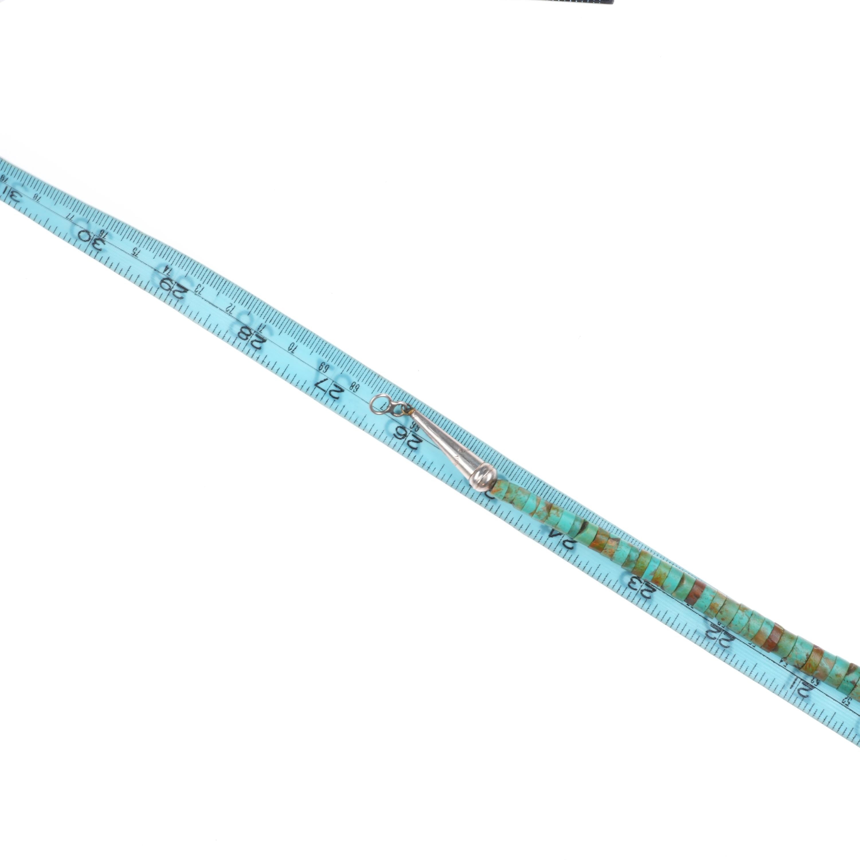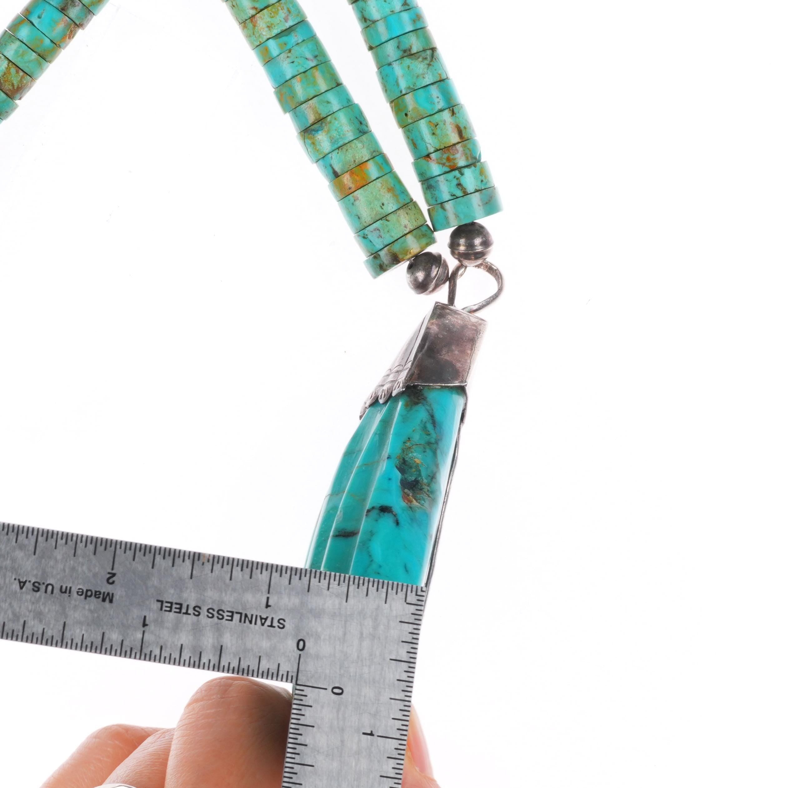 Vintage Zuni/Santo Domingo sterling silver carved turquoise leaf Heishi necklace. Tested and guaranteed solid sterling silver mountings with weight and measurements in pictures. 26.5" long with no significant issues. Circa third quarter of the 20th century. Pendant signed as shown by a silversmith once known.