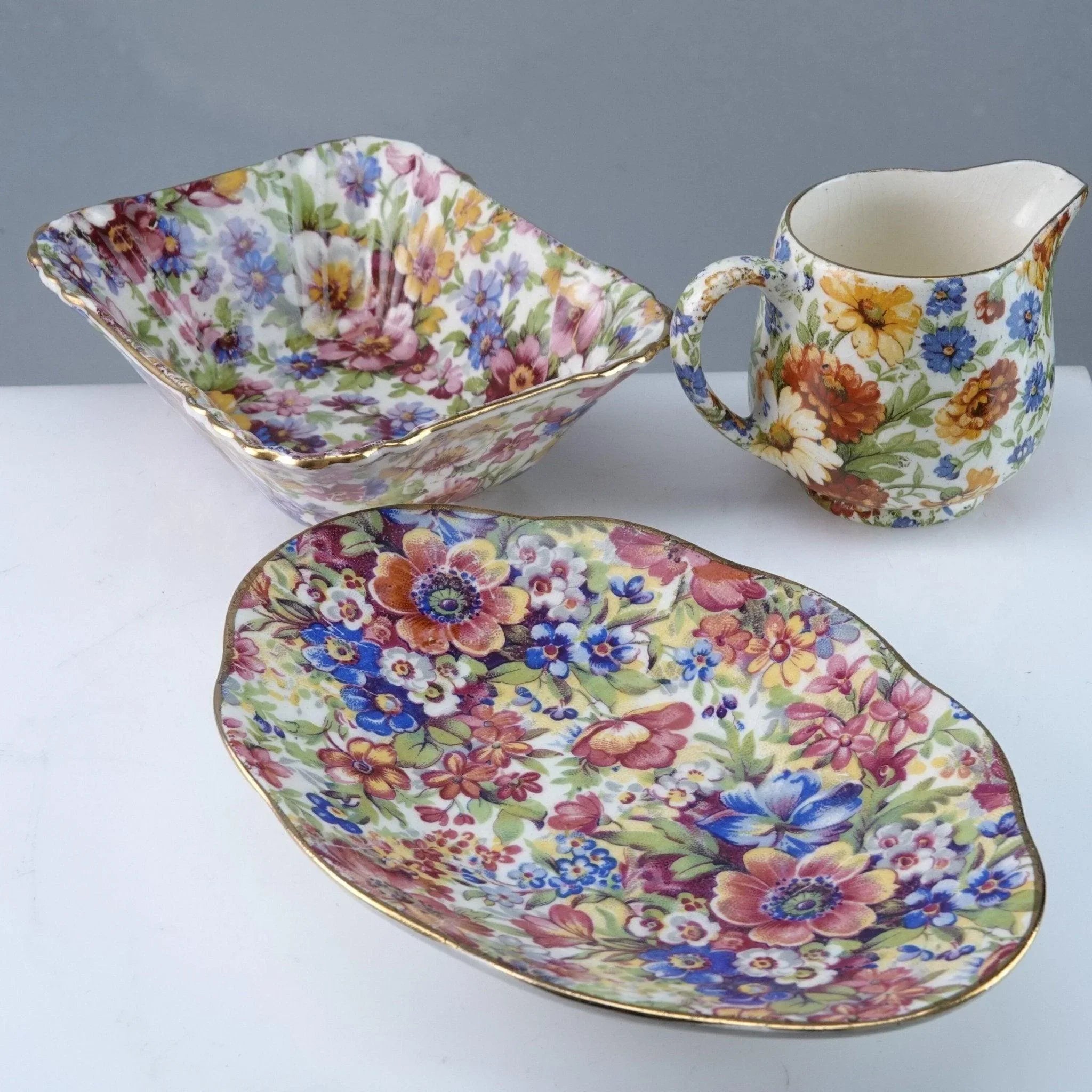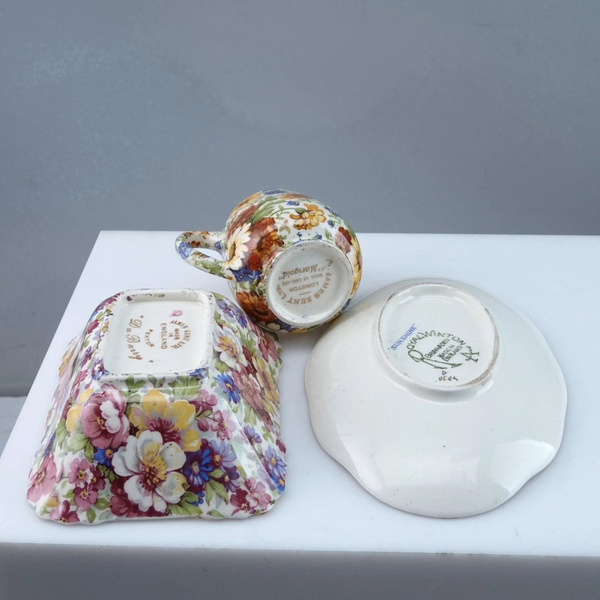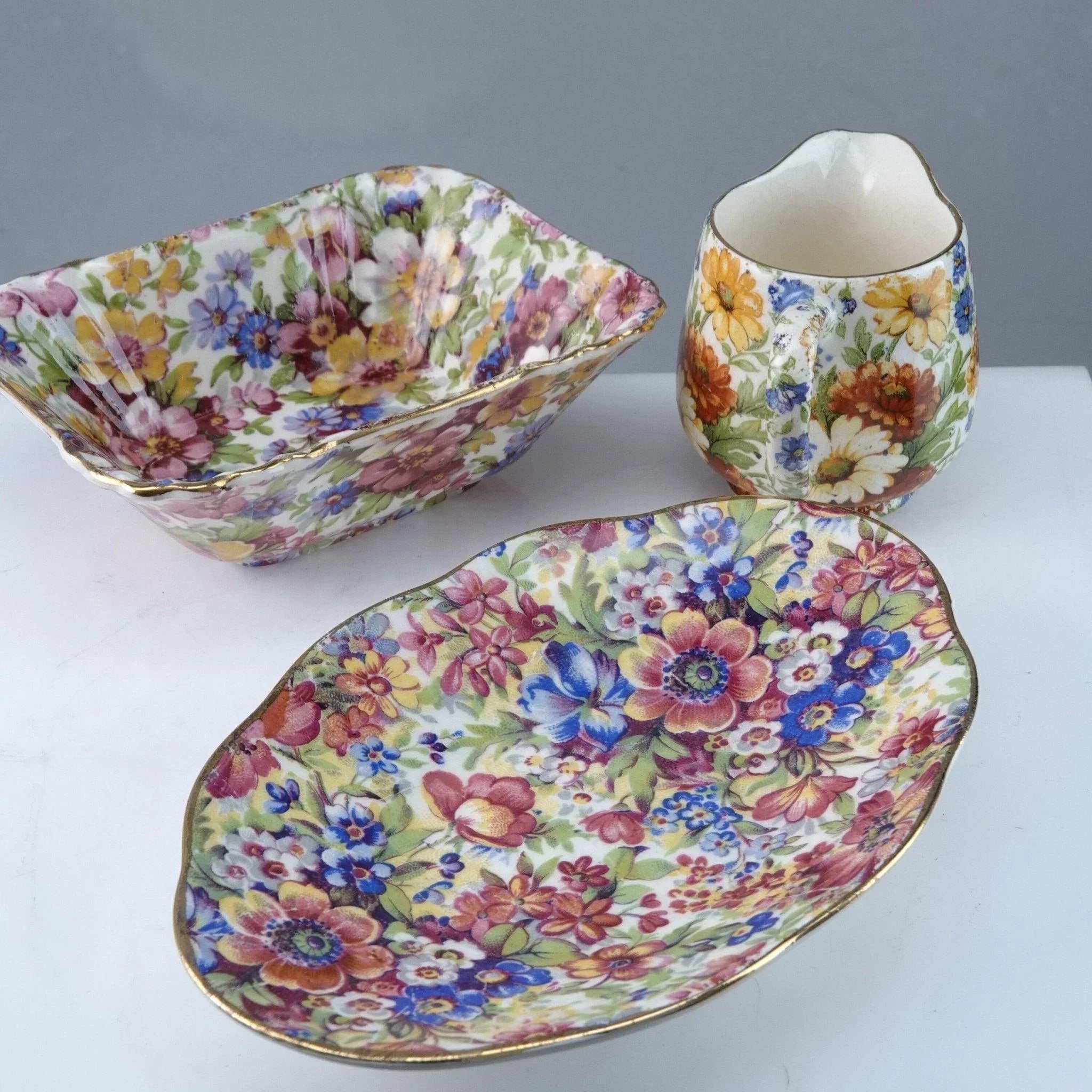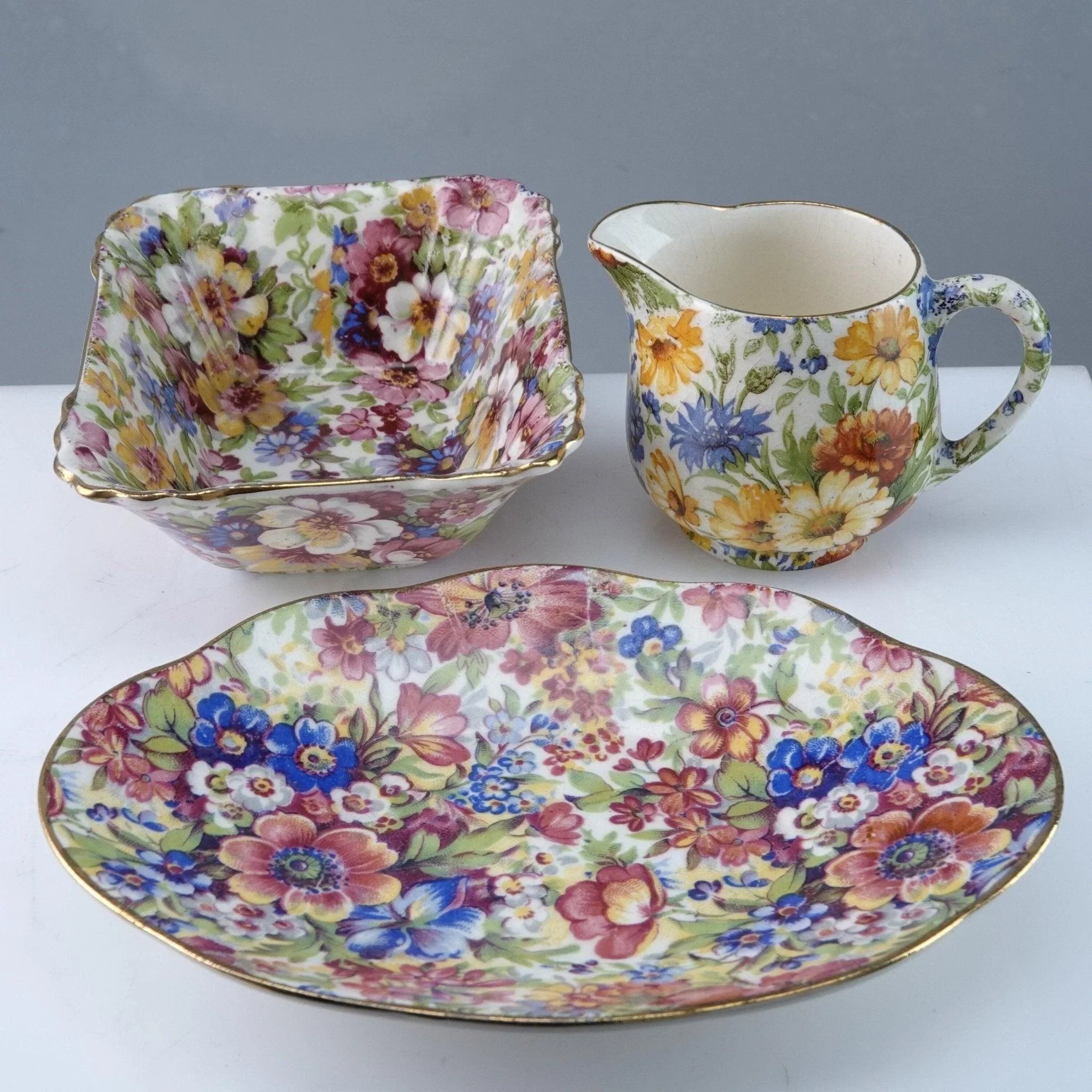 1950 年 Royal Winton/James Kent 英国印花布 3 件装。出售所有三件 20 世纪中期的作品,没有裂缝、缺口、修复或污渍。仔细检查后,这三者都可见一些预期的裂纹。奶精高 2.25 英寸最大托盘宽 5 3/8 英寸。