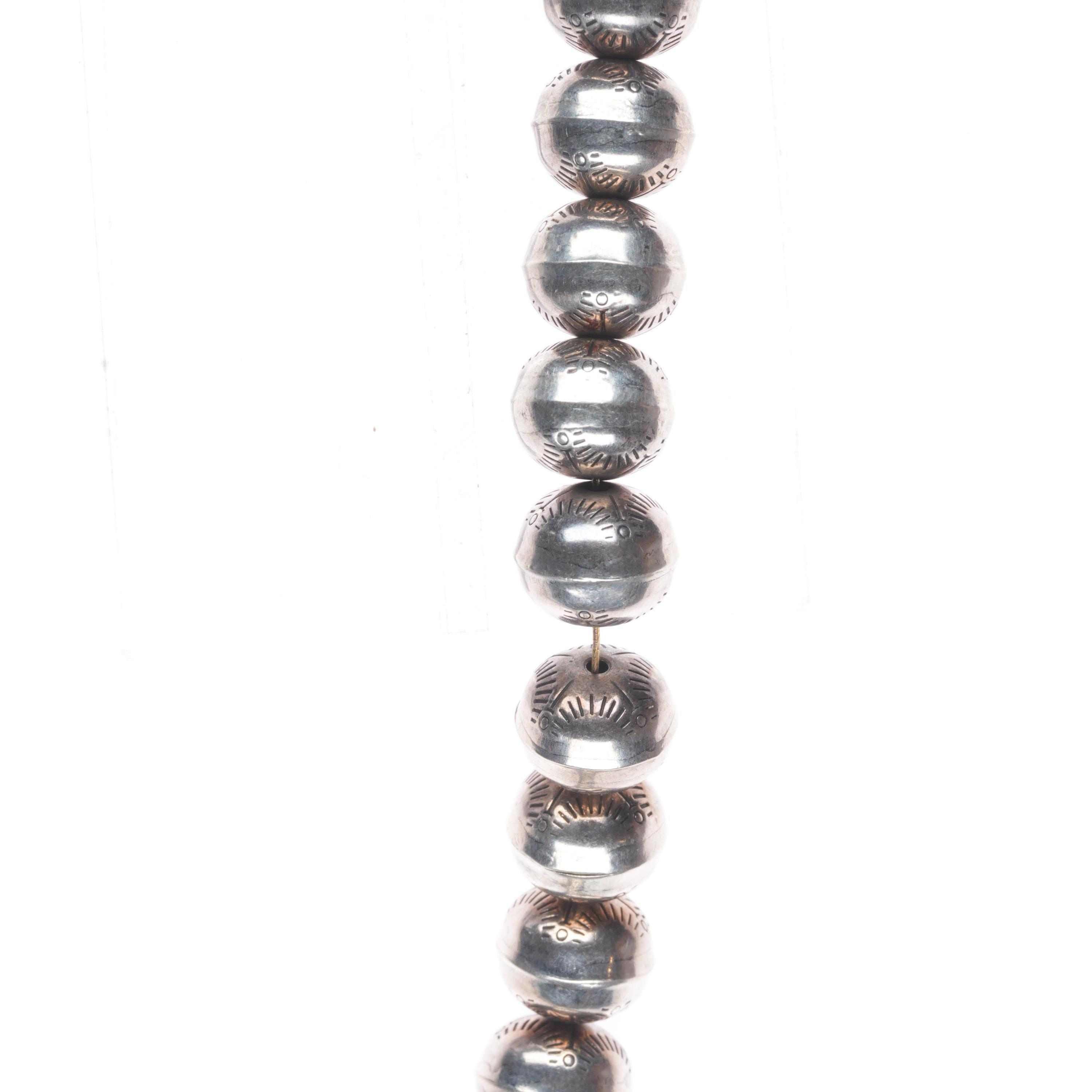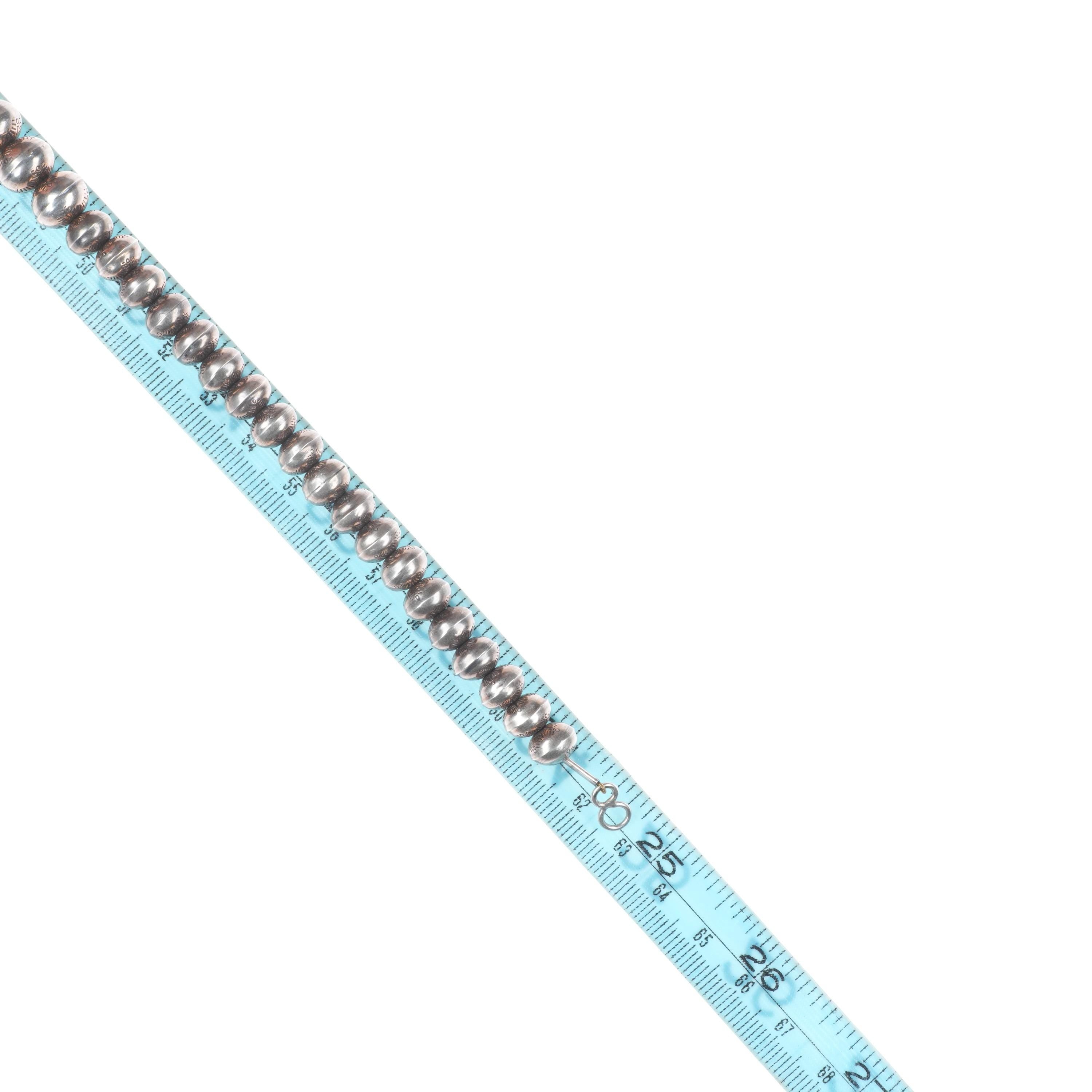 24.5" Vintage Navajo Pearls hand stamped sterling silver beaded necklace. Selling the necklace shown in good condition with measurements in pictures. Tested and guaranteed solid sterling silver. Weight and measurements in pictures. Circa last quarter of the 20th century. 24.5" long. Handmade beads, hand stamped.