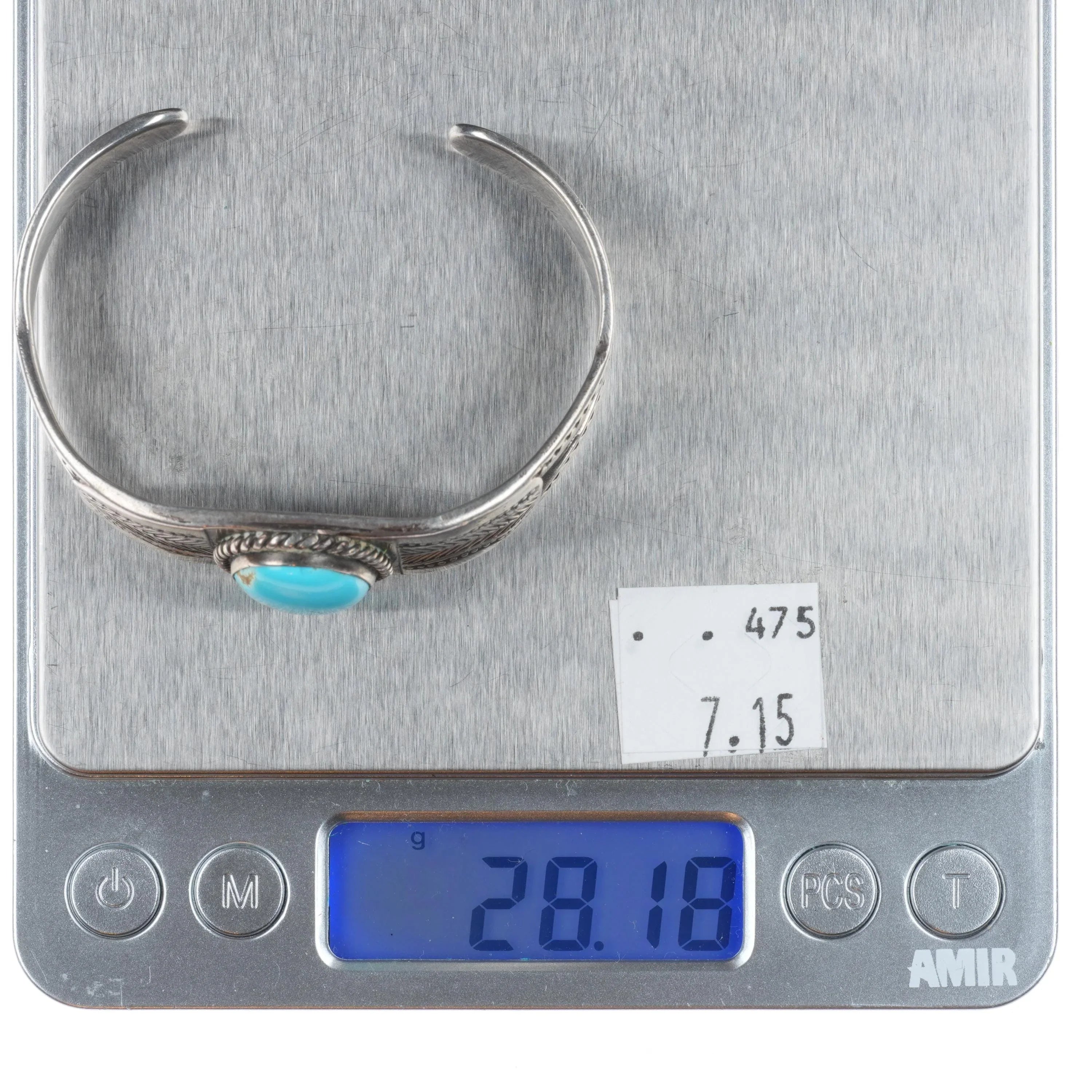 6.1" 1930‘s Navajo arrow stamped sterling silver cuff bracelet w/nice turquoise. Tested and guaranteed solid sterling silver with weight and measurements in pictures. Good condition, circa second quarter of the 20th century. All stones secure, with no damage.