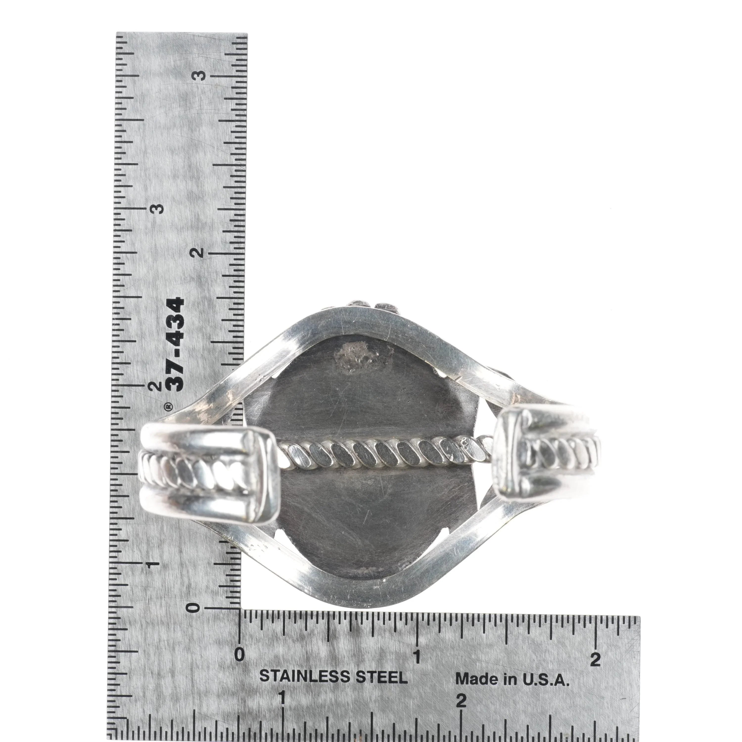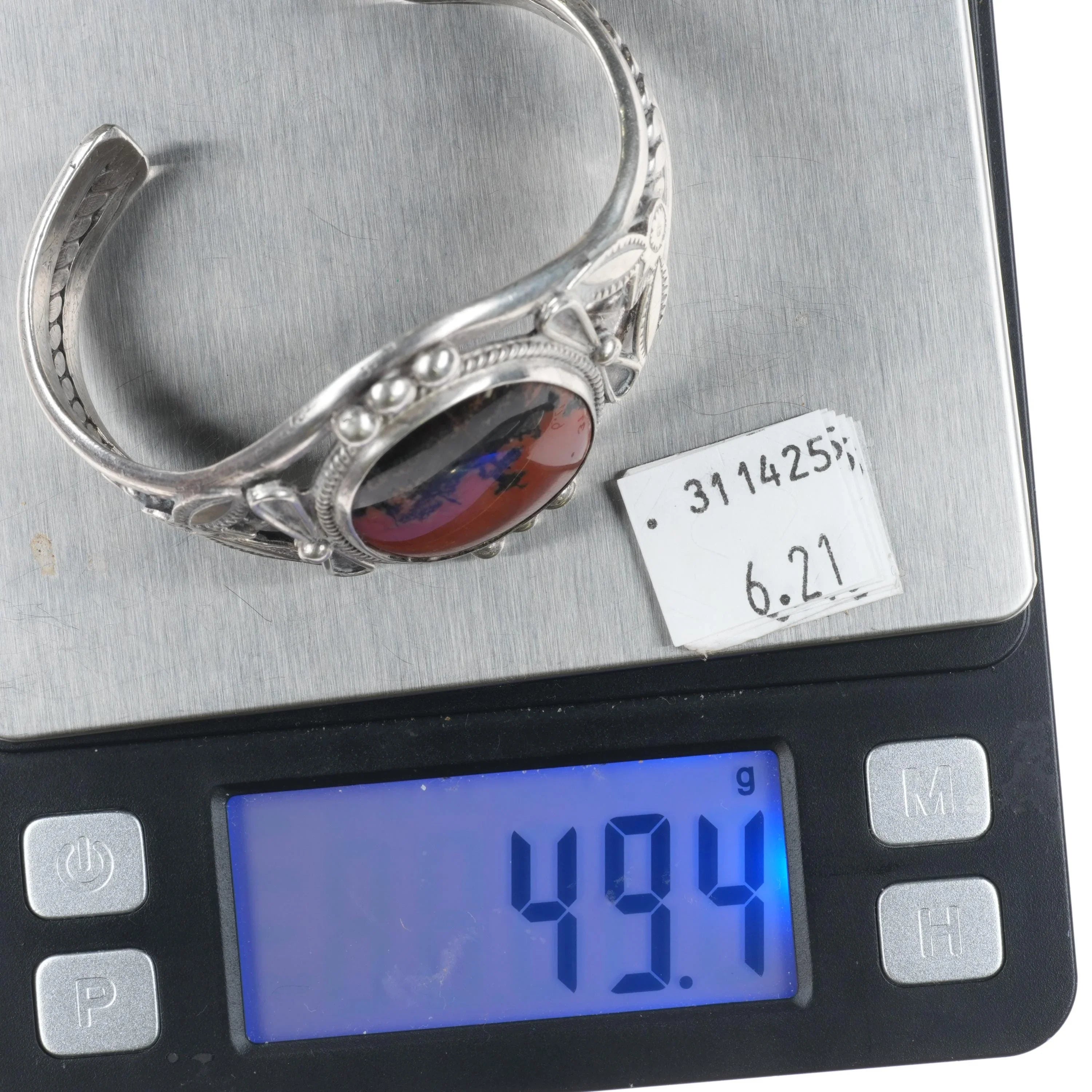 6.1" 40‘s-50‘s Navajo sterling silver petrified wood wide cuff bracelet. Tested and guaranteed solid sterling silver with no markings . Some expected wear, no damage. Weight and measurements in pictures. Circa second quarter of the 20th century.