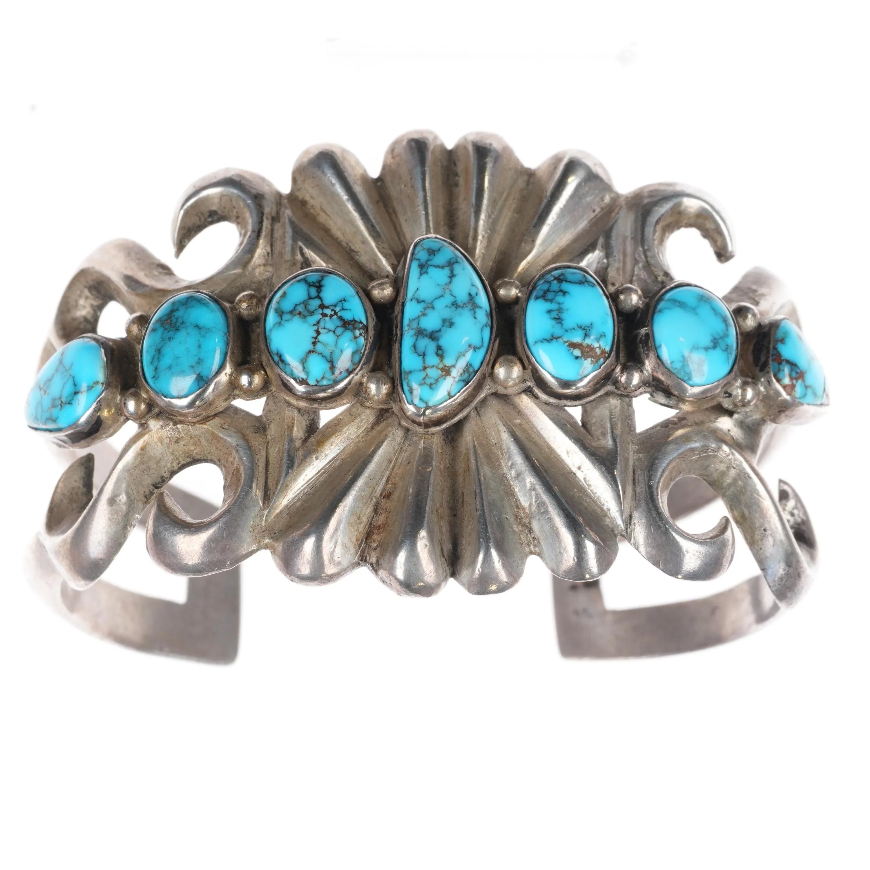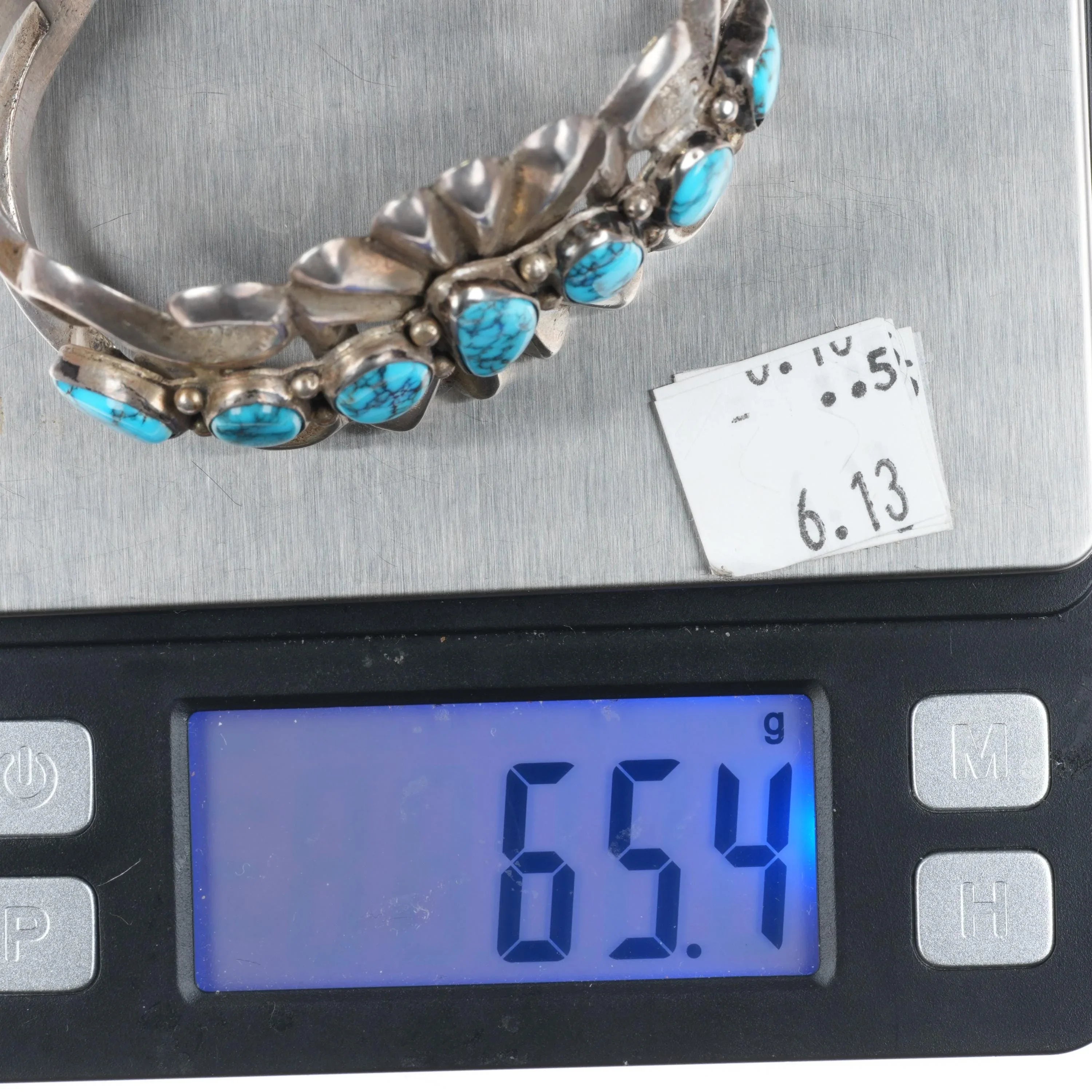 6.1" c1940‘s Candelaria spiderweb turquoise cast sterling silver cuff bracelet. Amazing bracelet, mid 20th centuryk, Native American made. Could be Zuni or Navajo made. Amazing Natural American turquoise, likely from Nevada. Appears to be from the Candelaria mine. Regardless of what mine it is from, it‘s high grade and rare turquoise. One of the side stones has an old fracture, but is secure in it‘s bezel. Only markings are what I believe to be a C.G. Wallace pricing code on the back.