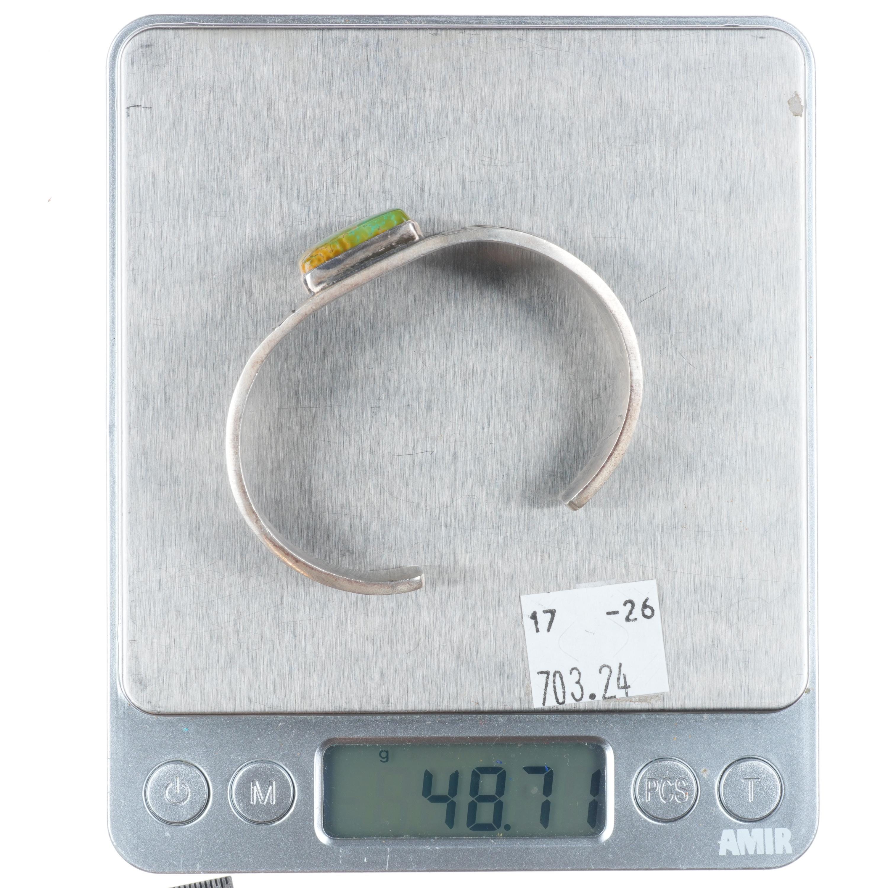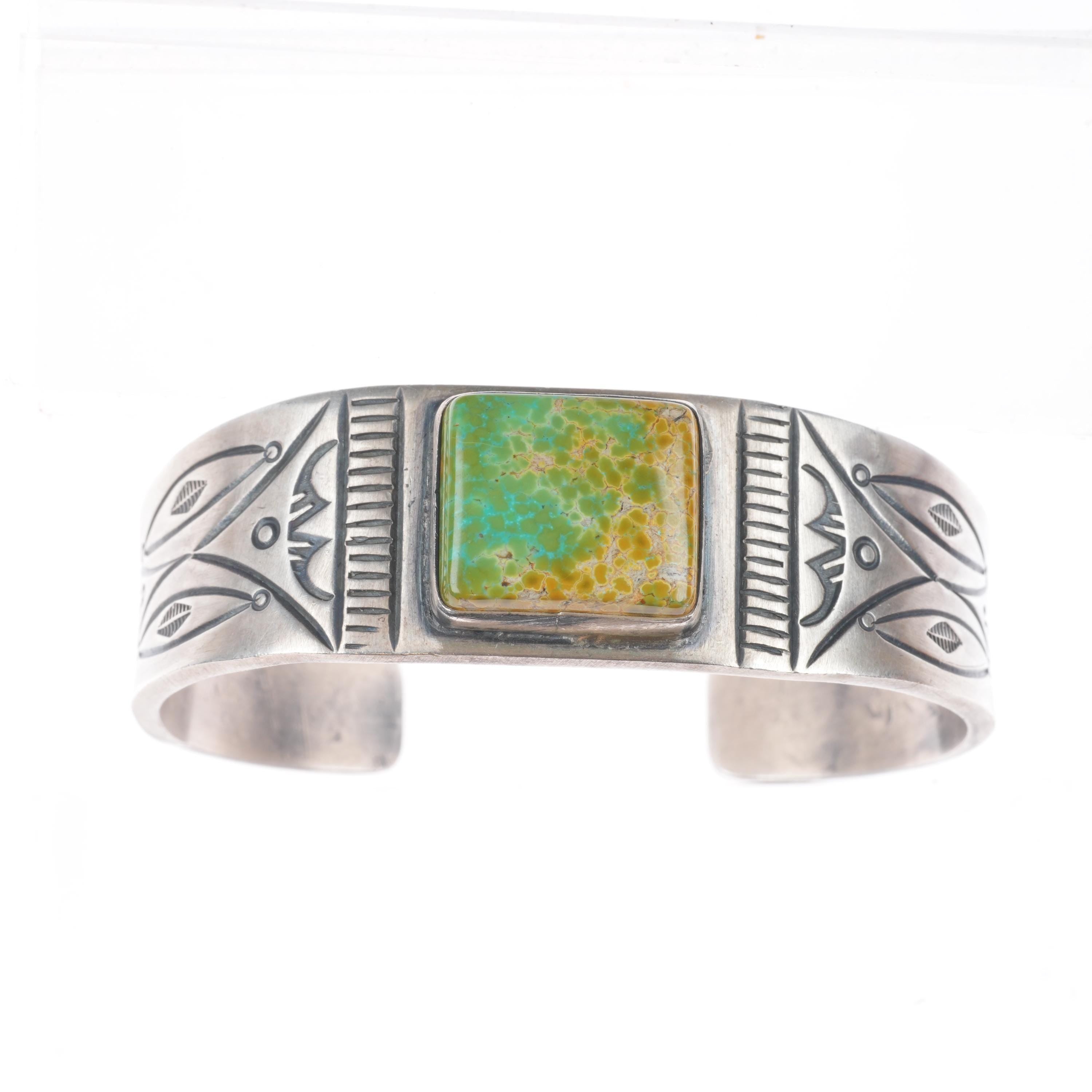 6.1" Danny Clark Navajo stamped sterling silver Royston turquoise cuff bracelet. Tested and guaranteed solid sterling silver, with weight and measurements in pictures, circa last quarter of the 20th century.