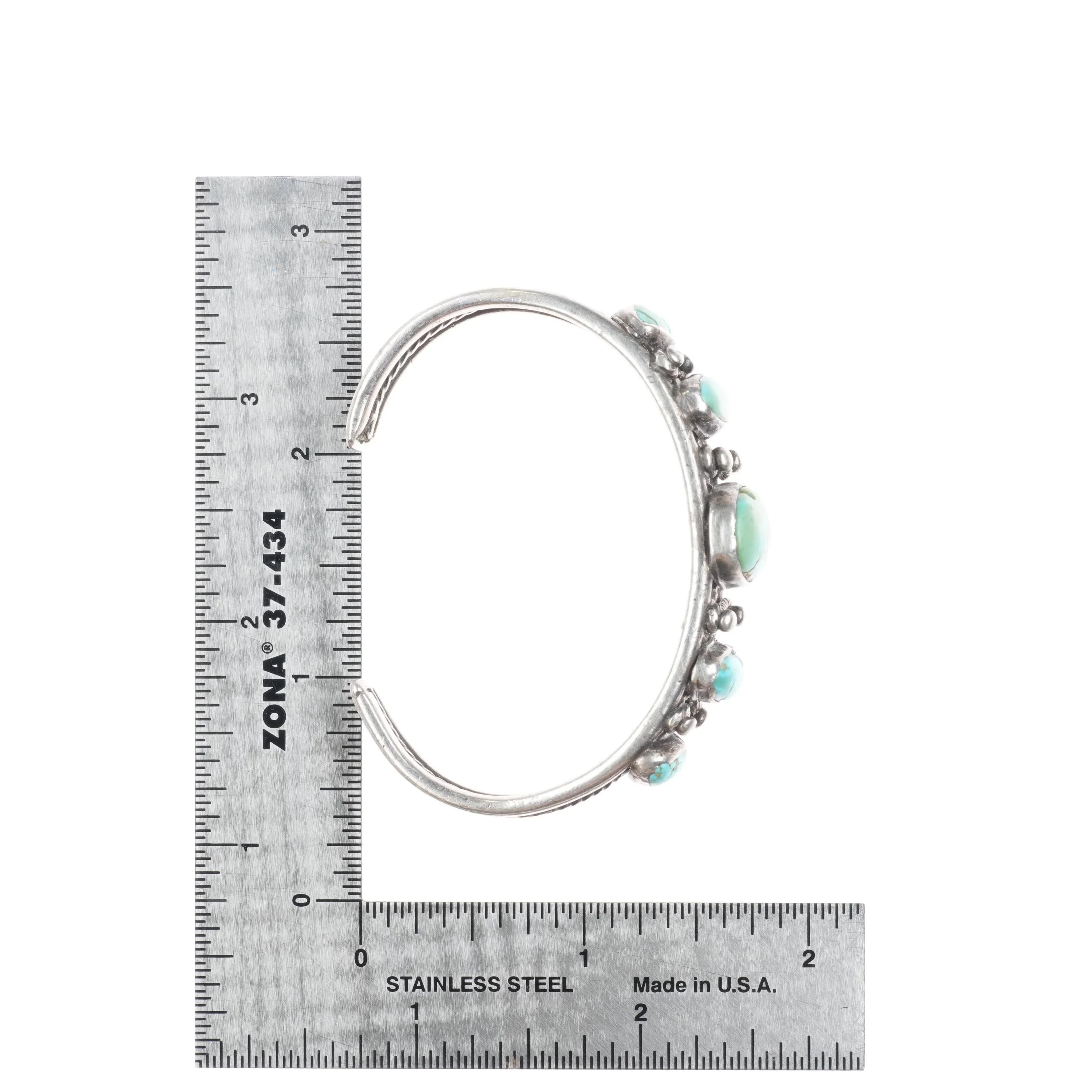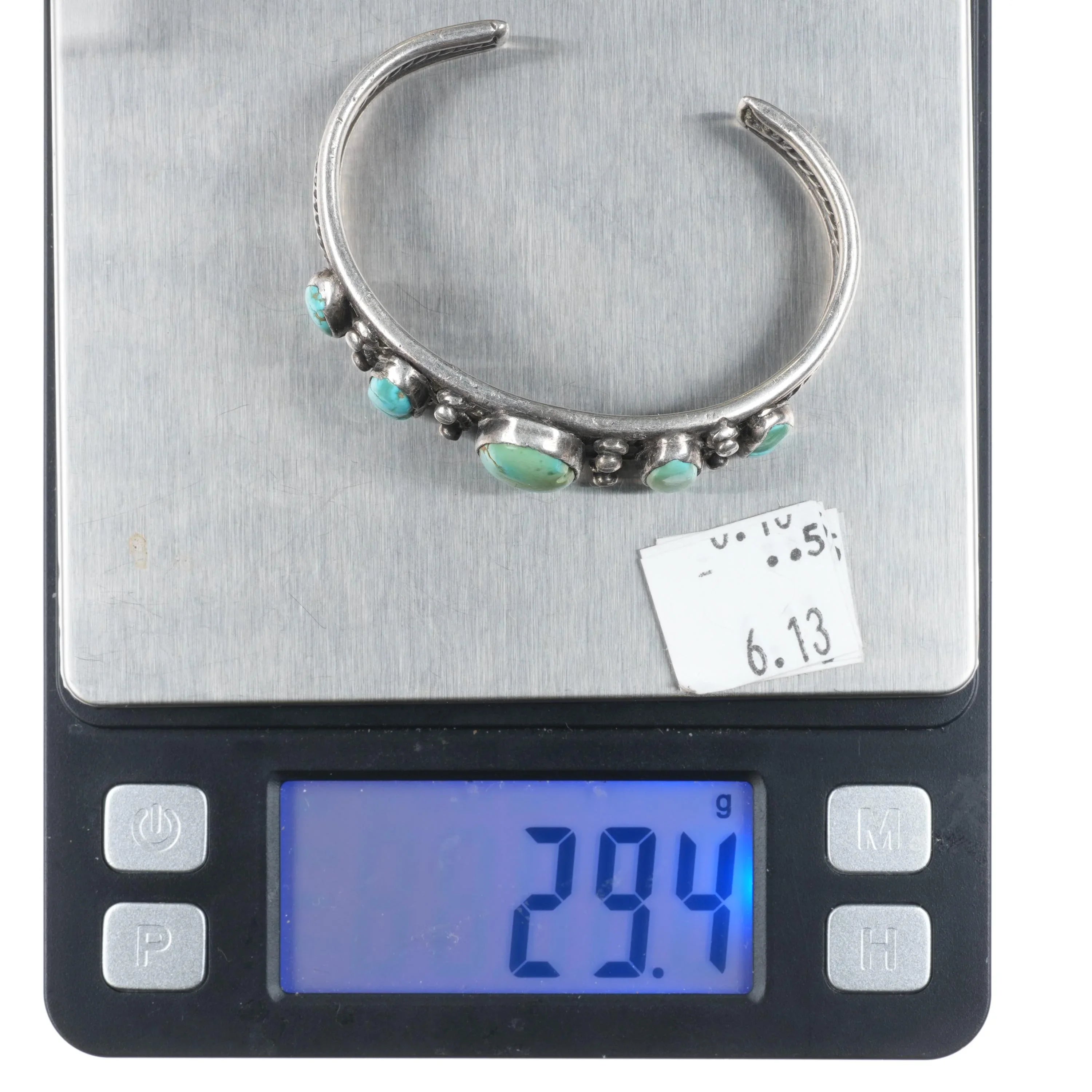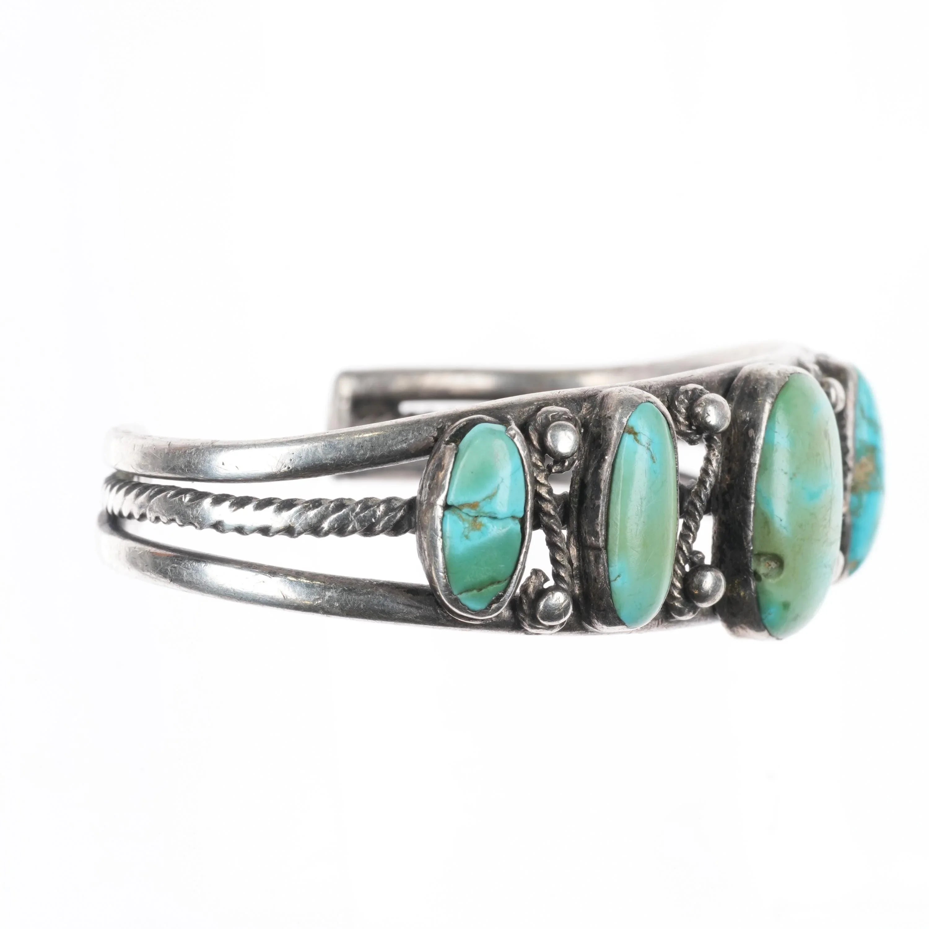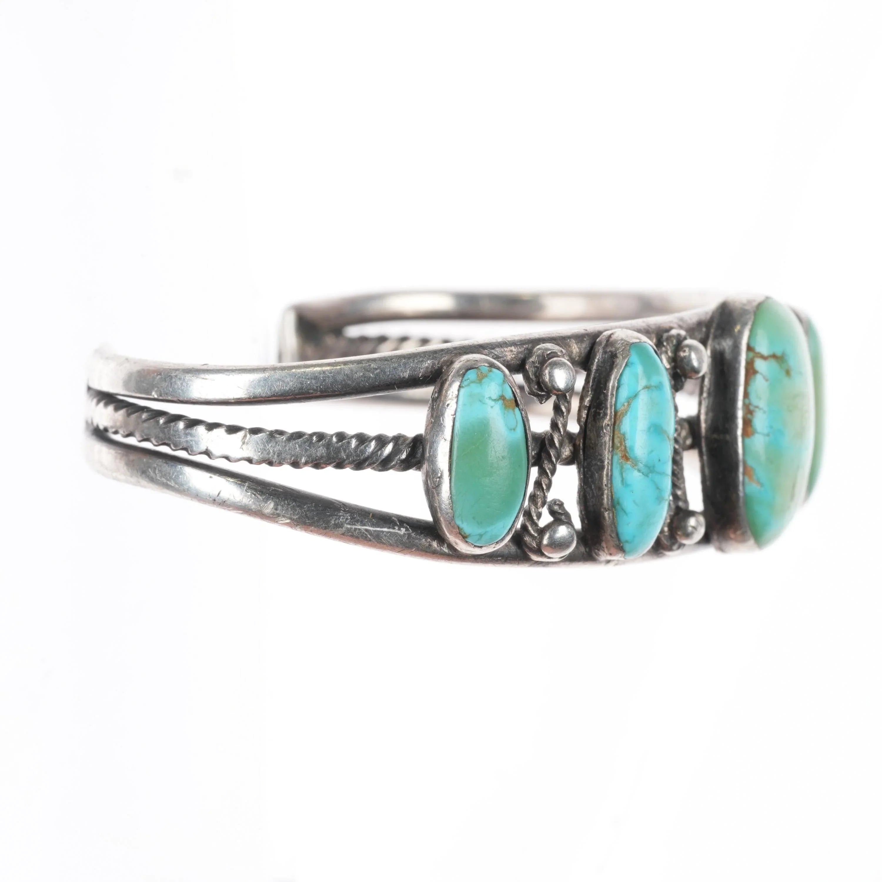 6" 20‘s-30‘s Navajo ingot silver row cuff bracelet w/fancy twisted wire. Second quarter of the 20th century, one stone with old fracture, center stone with old chip, stones secure in bezels, wear to bezel with fractured stone, expected overall wear. Unmarked, tested and guaranteed solid ingot 90%+ silver.