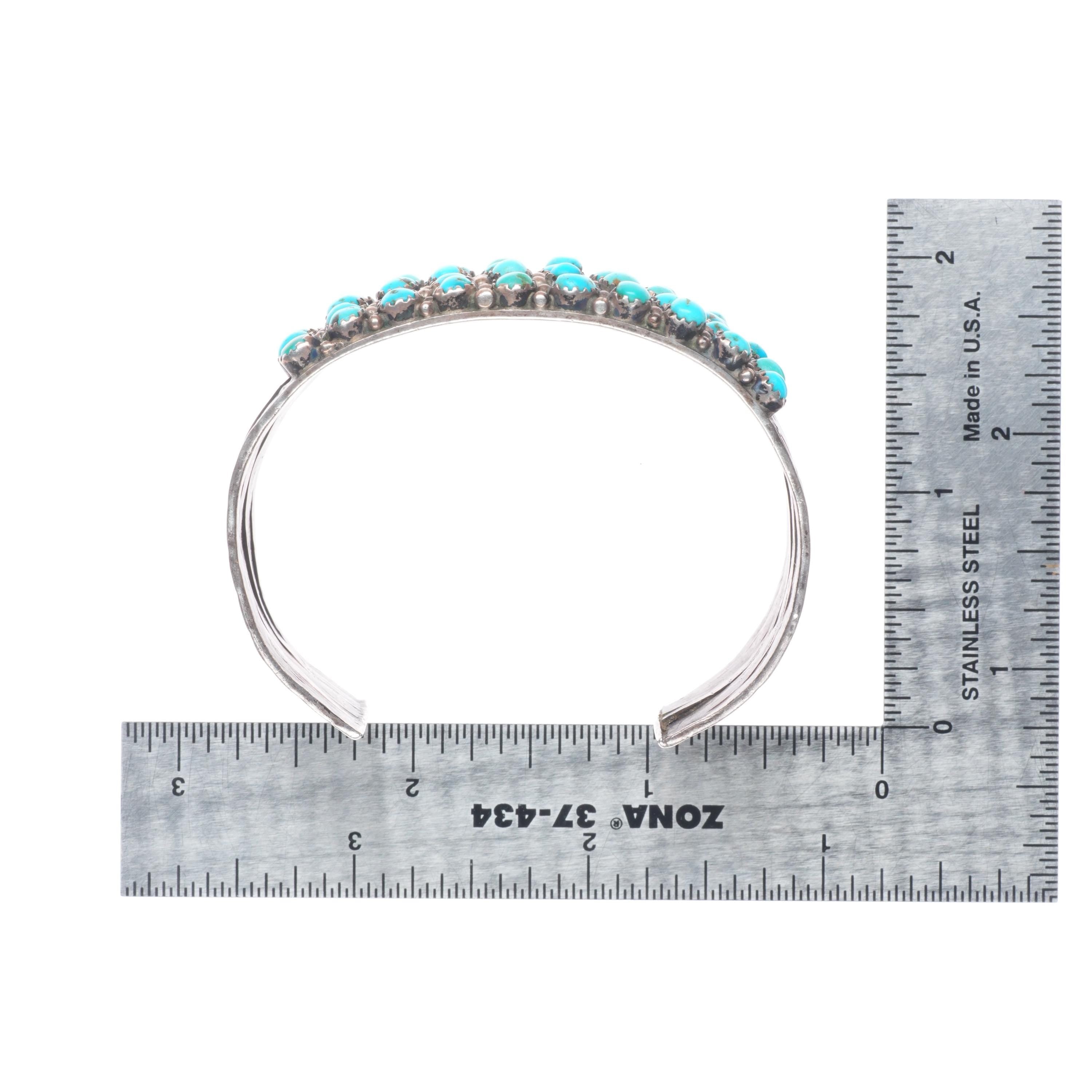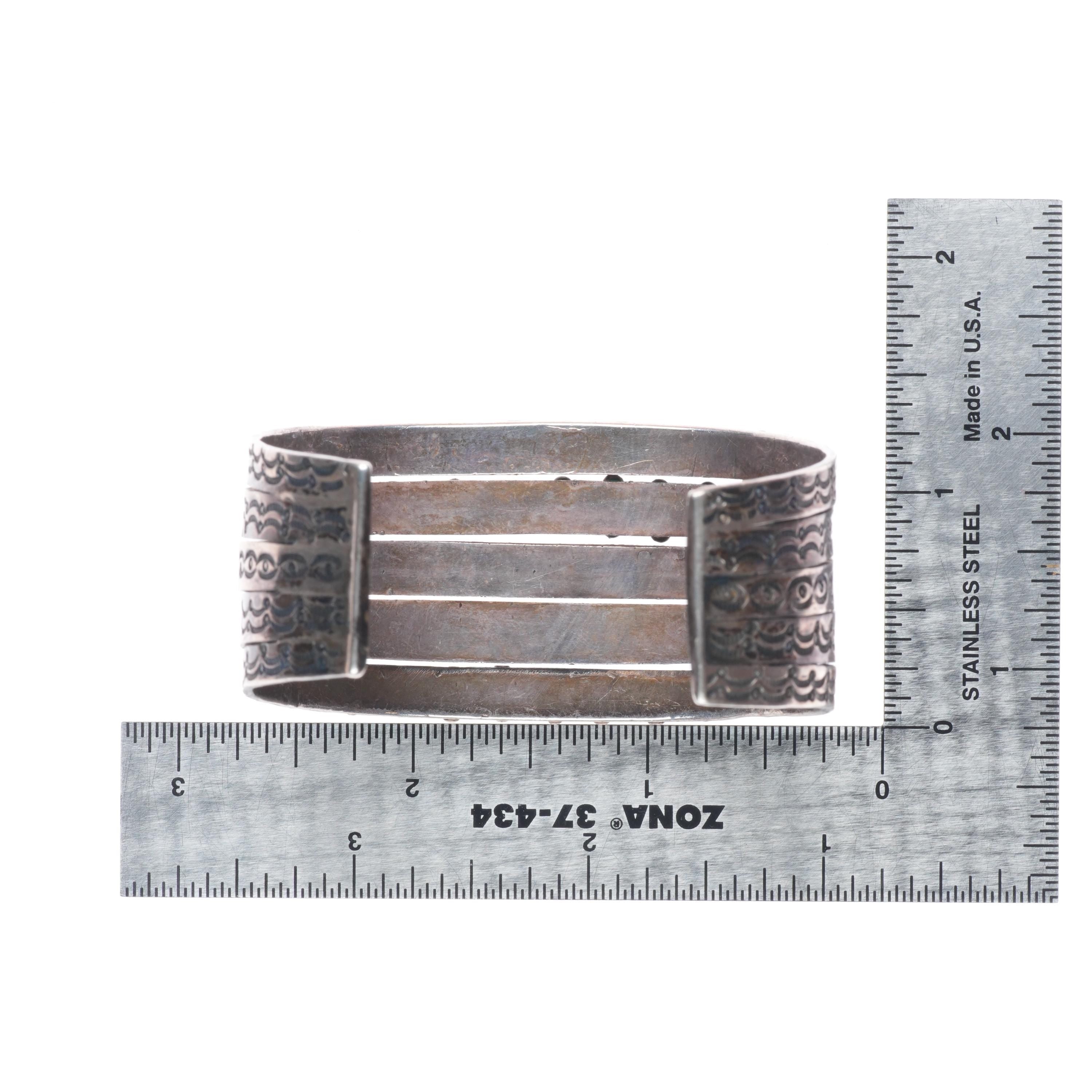 6.4" 1930's Ingot Silver Zuni snake eye turquoise 5 stack row cuff bracelet. Tested and guaranteed solid ingot/sterling silver with weight and measurements in pictures. Great condition with age appropriate wear, circa second quarter of the 20th century.