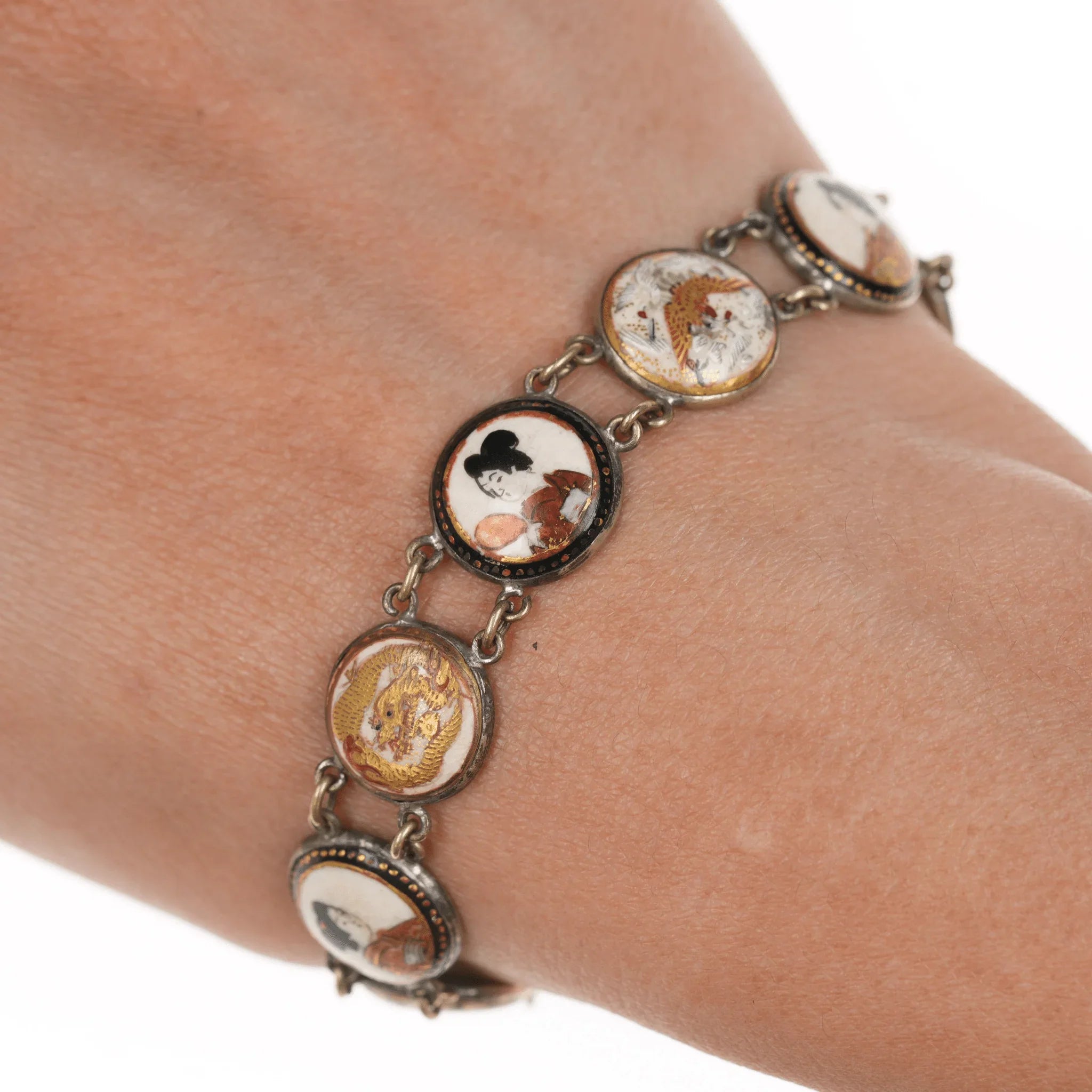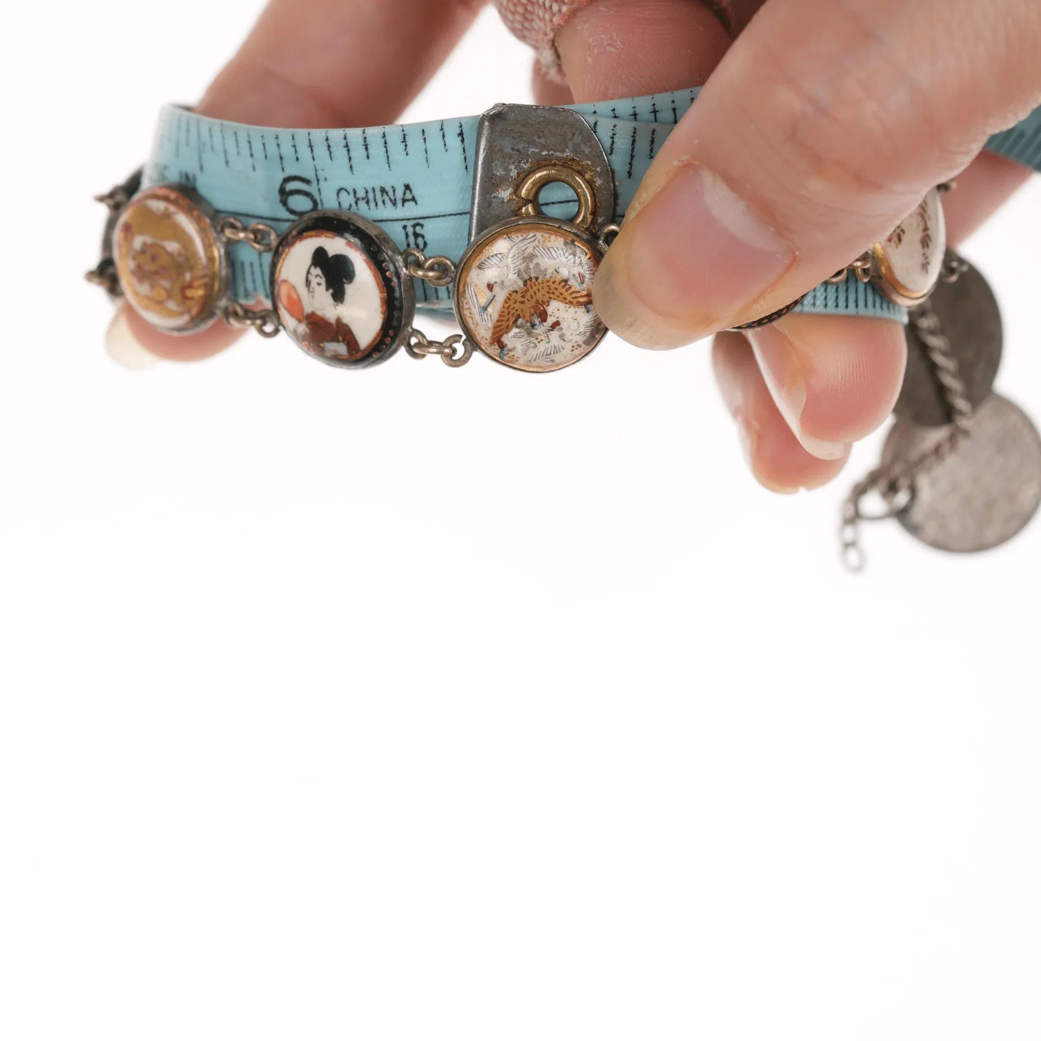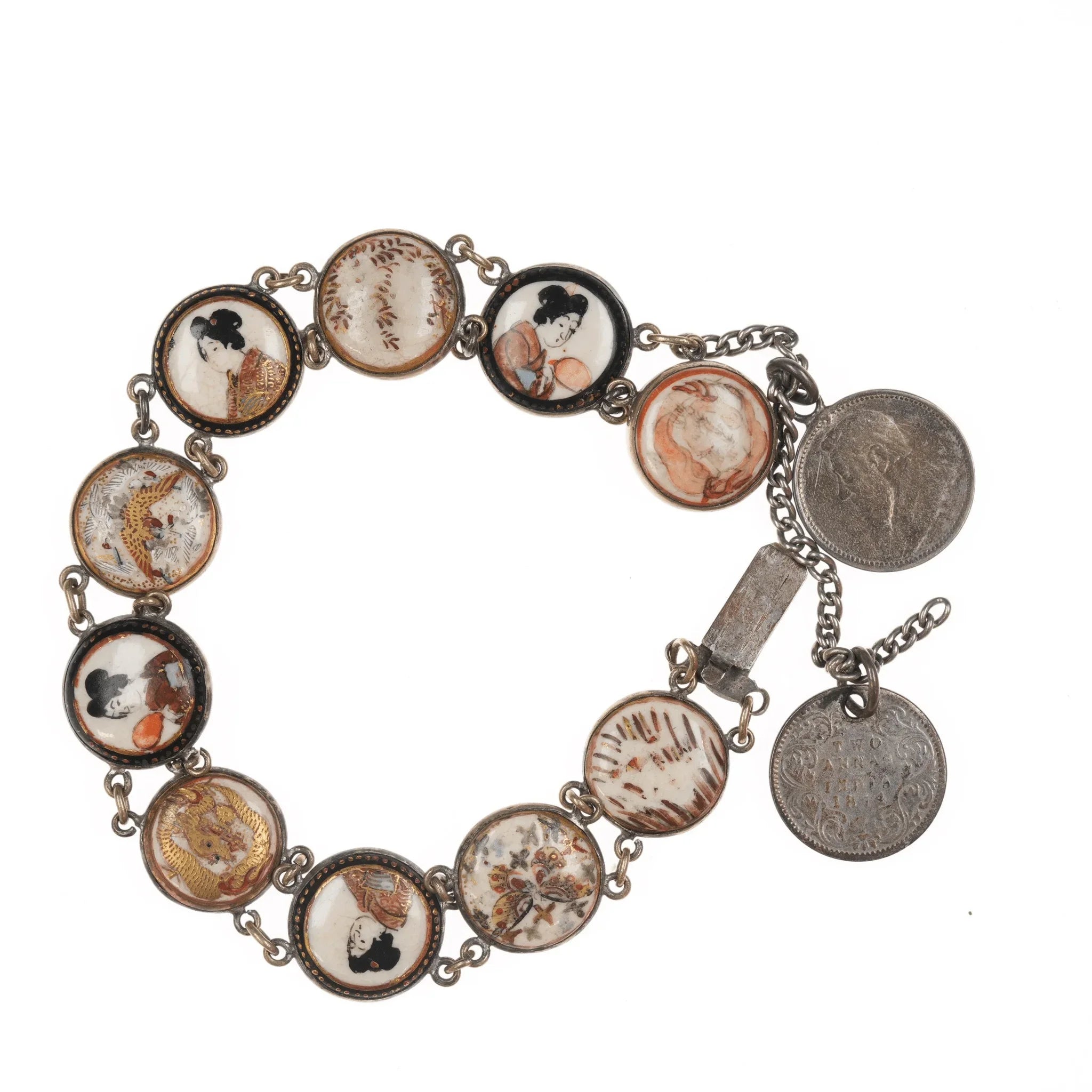 6.5" c1900 Meiji Japanese Satsuma bracelet w/1874, 1897 coins. I don't know if the coins are part of a safety catch or just to dangle. Could easily be removed if unwanted. Approximately 14mm wide, some wear shown, no damage.