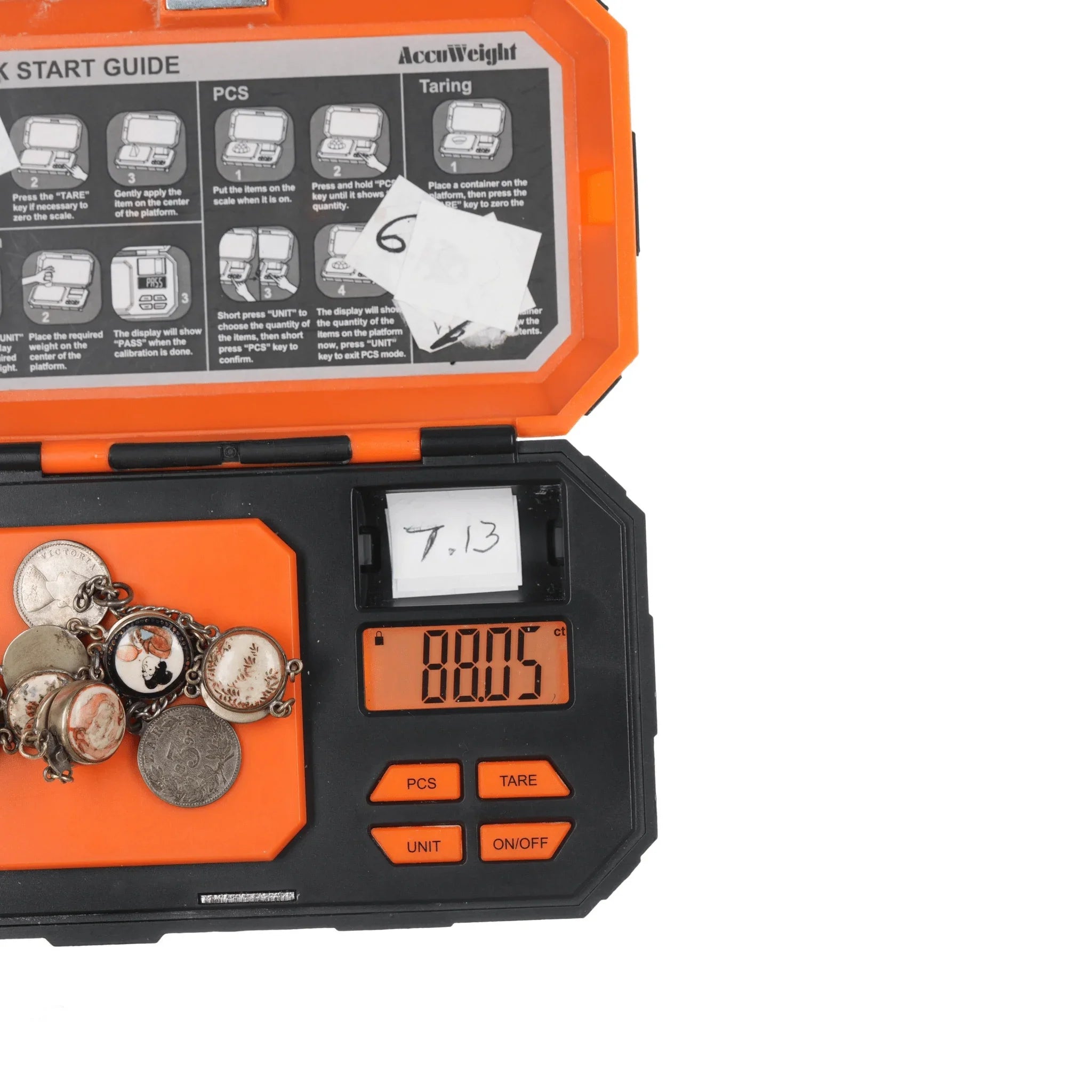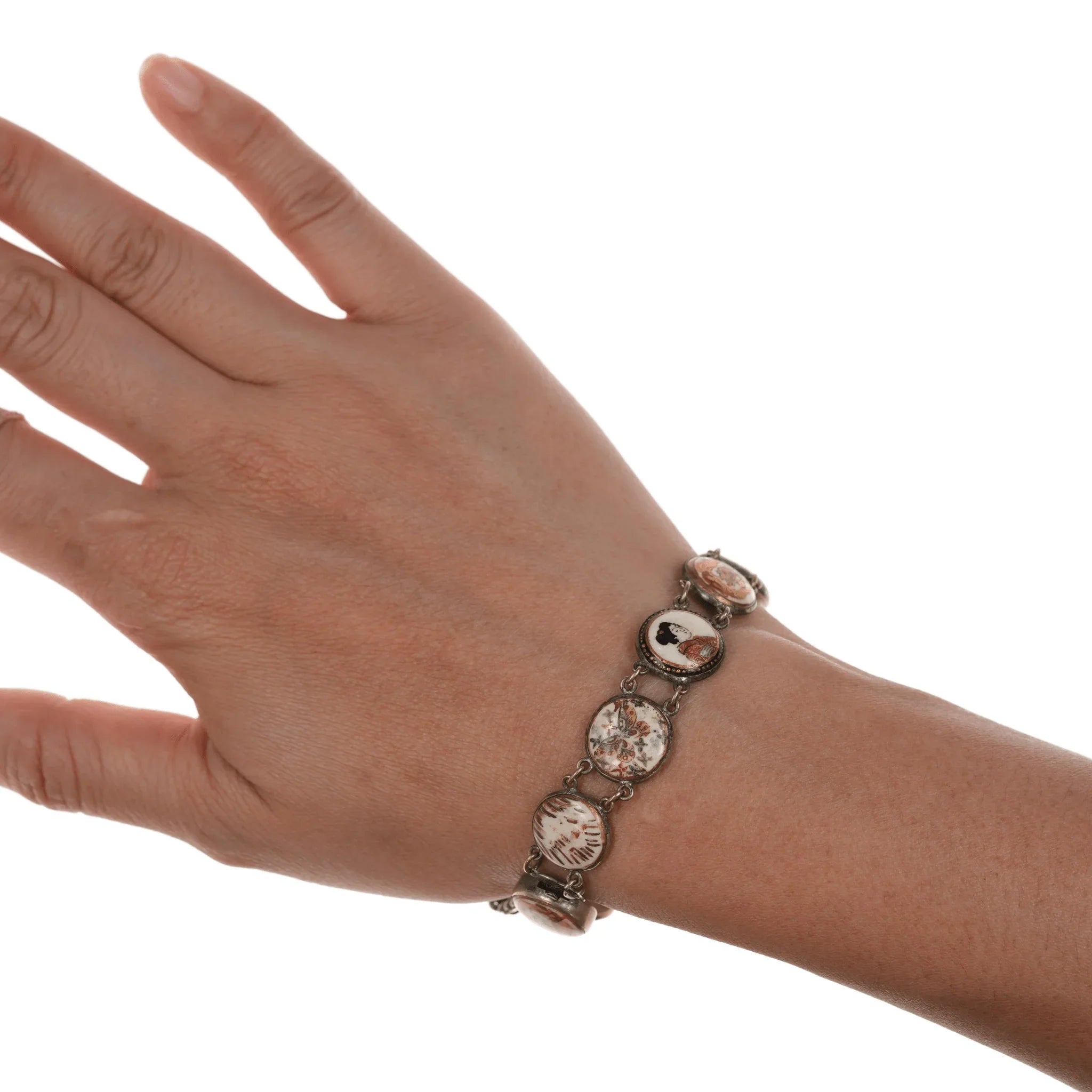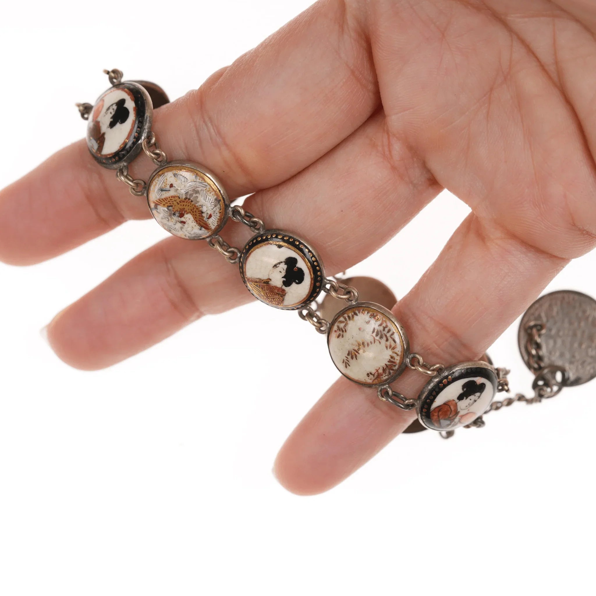 6.5" c1900 Meiji Japanese Satsuma bracelet w/1874, 1897 coins. I don't know if the coins are part of a safety catch or just to dangle. Could easily be removed if unwanted. Approximately 14mm wide, some wear shown, no damage.