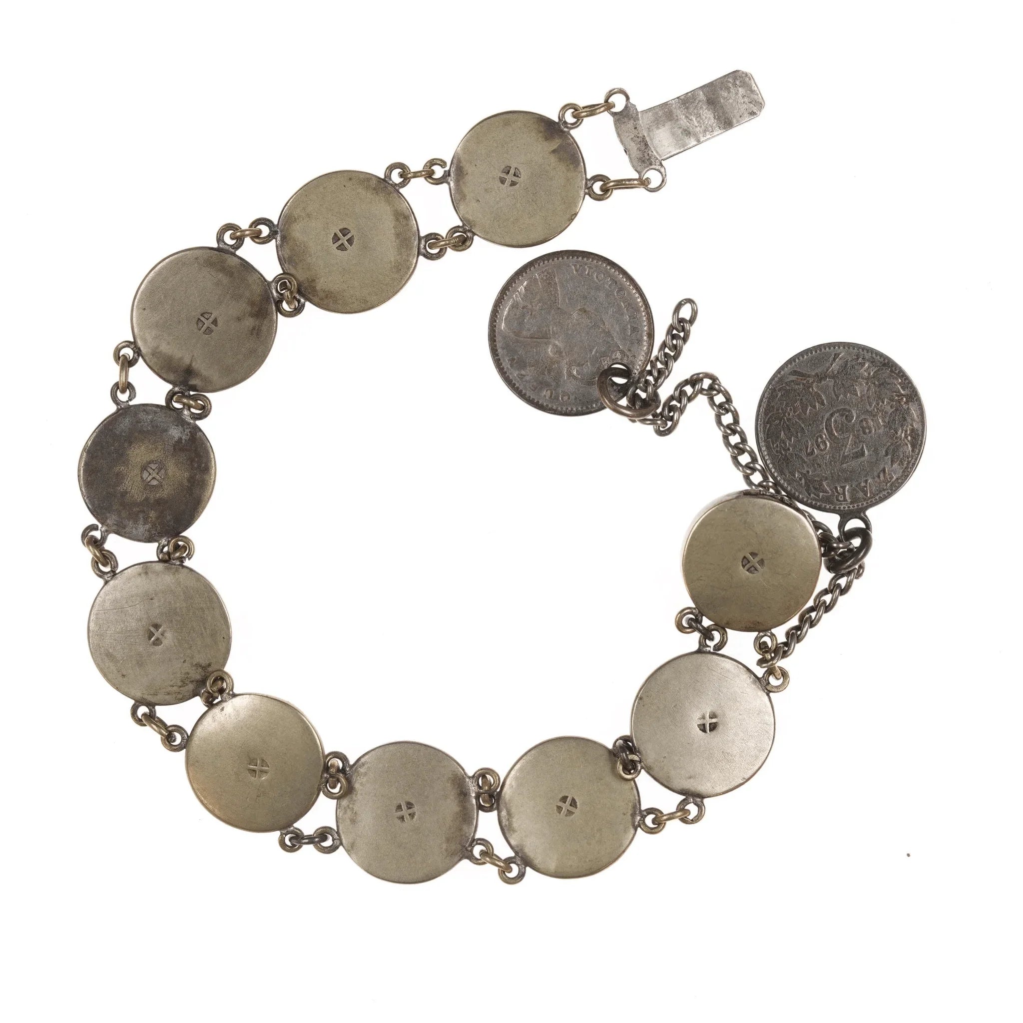 6.5" c1900 Meiji Japanese Satsuma bracelet w/1874, 1897 coins