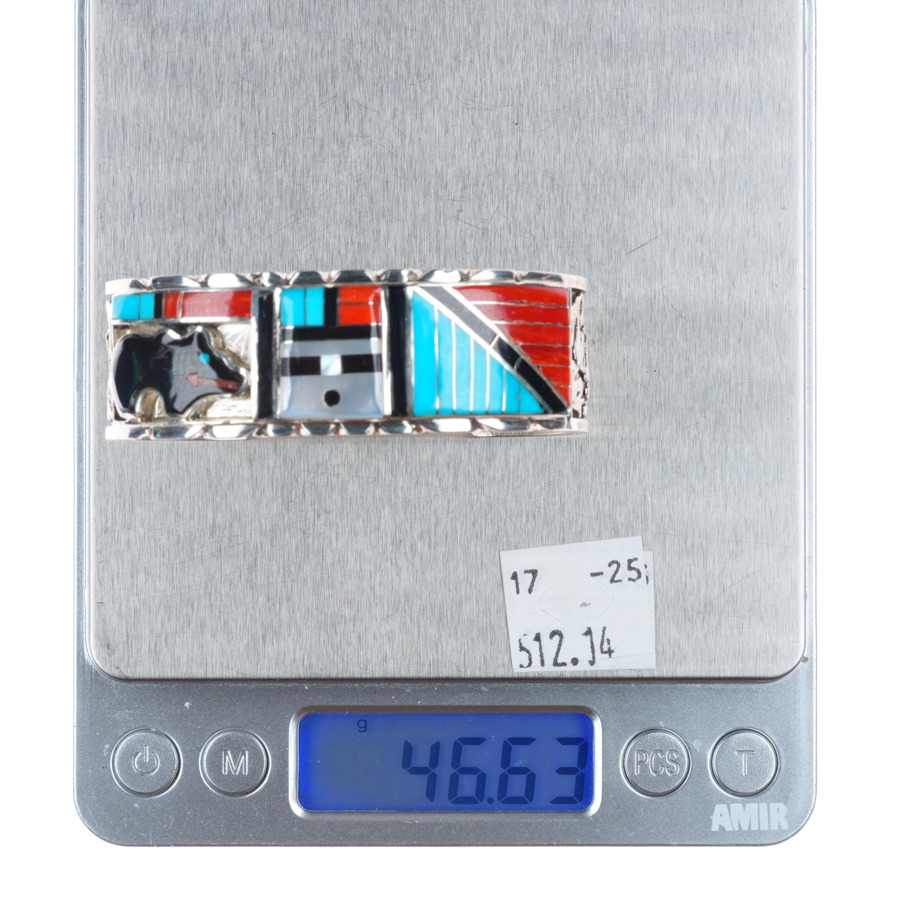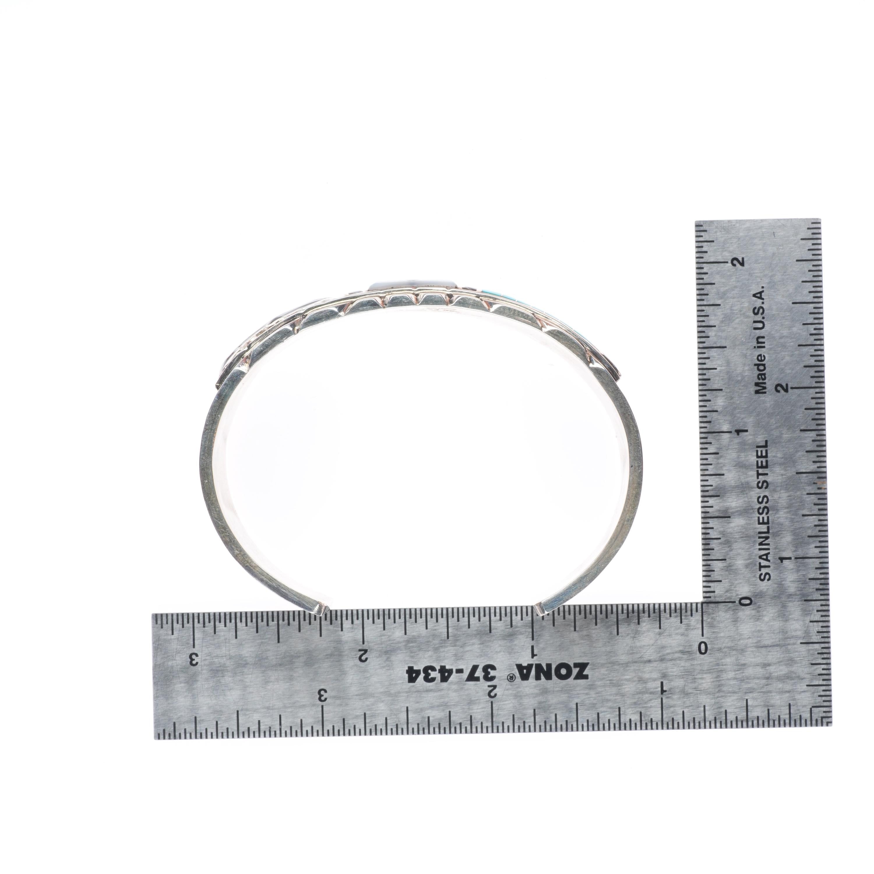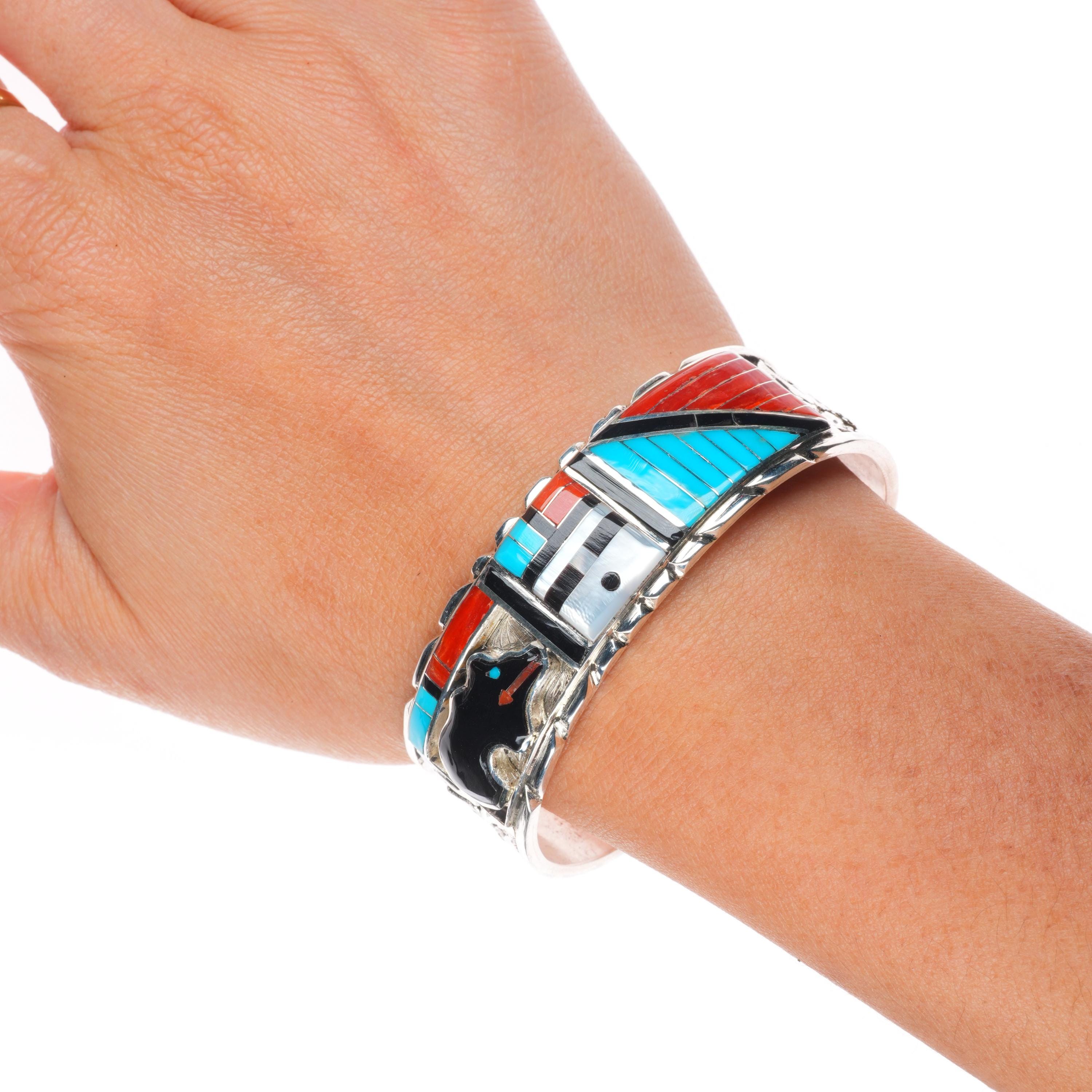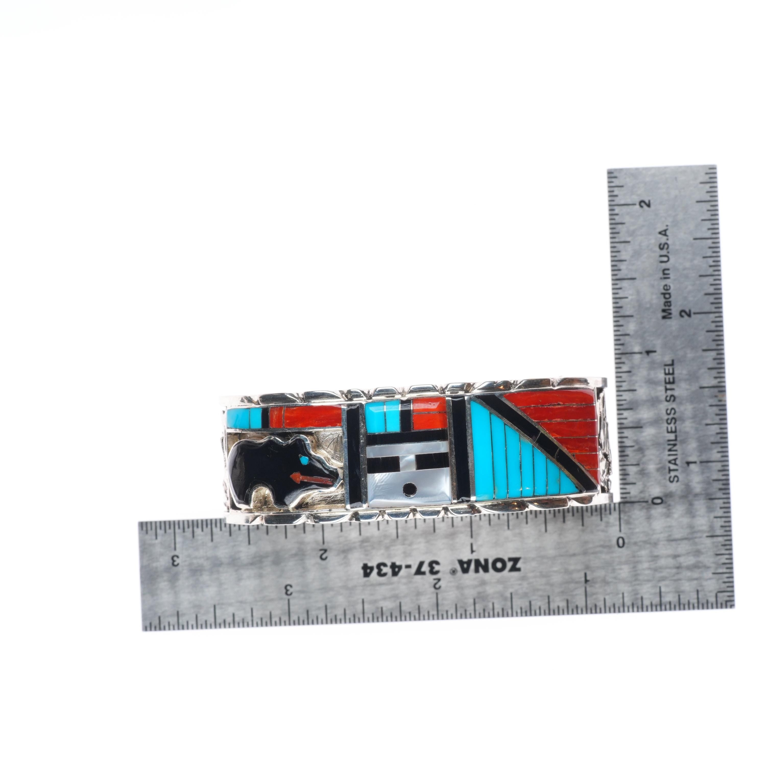 6.5" Don Dewa Zuni sterling silver sunface/bear inlay cuff bracelet turquoise Tested and guaranteed solid sterling silver with weight and measurements in pictures. Great condition with age appropriate wear, circa last quarter of the 20th century.