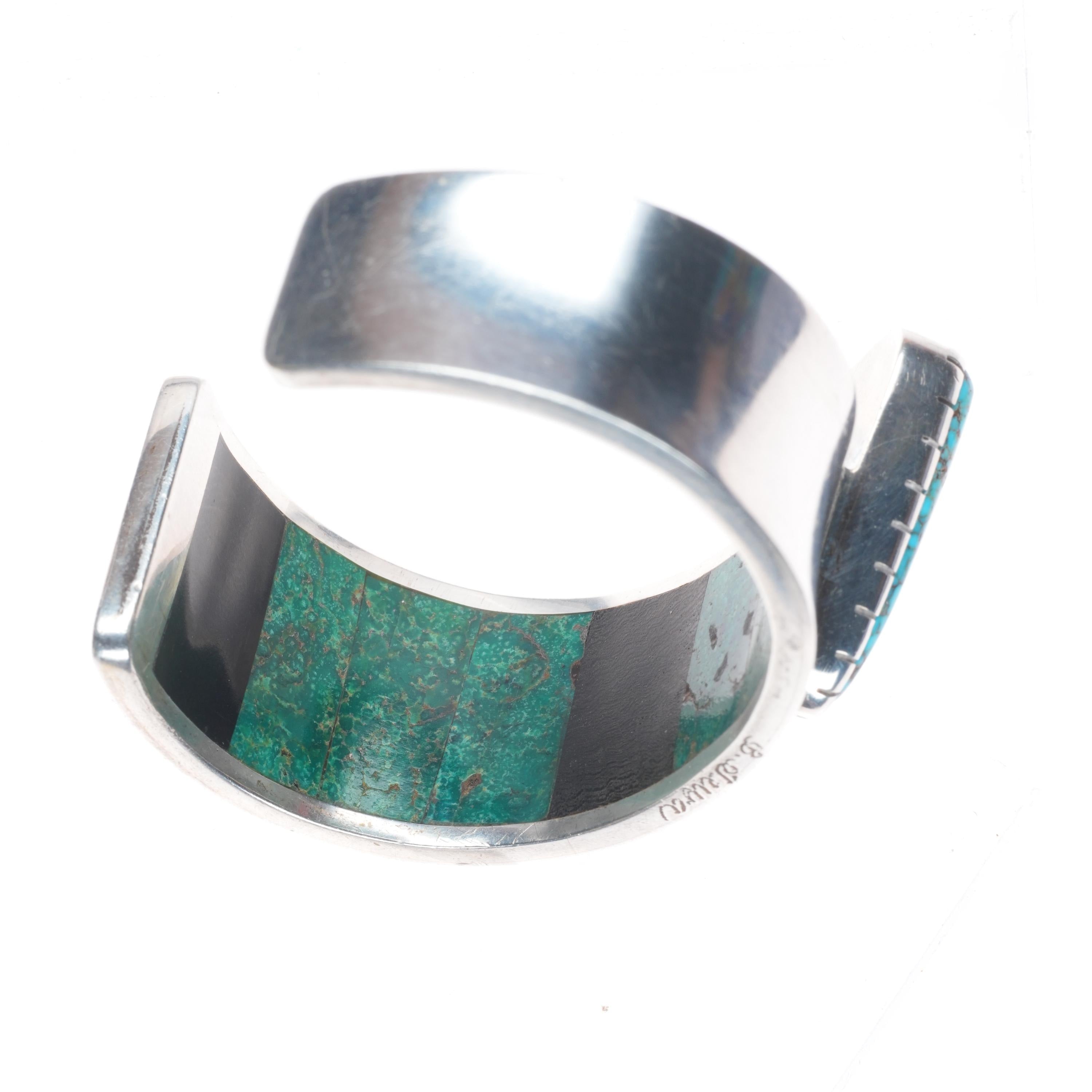 6" Bobby Tewa Hopi inside turquoise/coral inlaid sterling silver cuff bracelet. Tested and guaranteed solid sterling silver with weight and measurements in pictures. Overall expected wear circa last quarter of the 20th century. Amazing bracelet with interior inlay and high grade spiderweb turquoise in center.