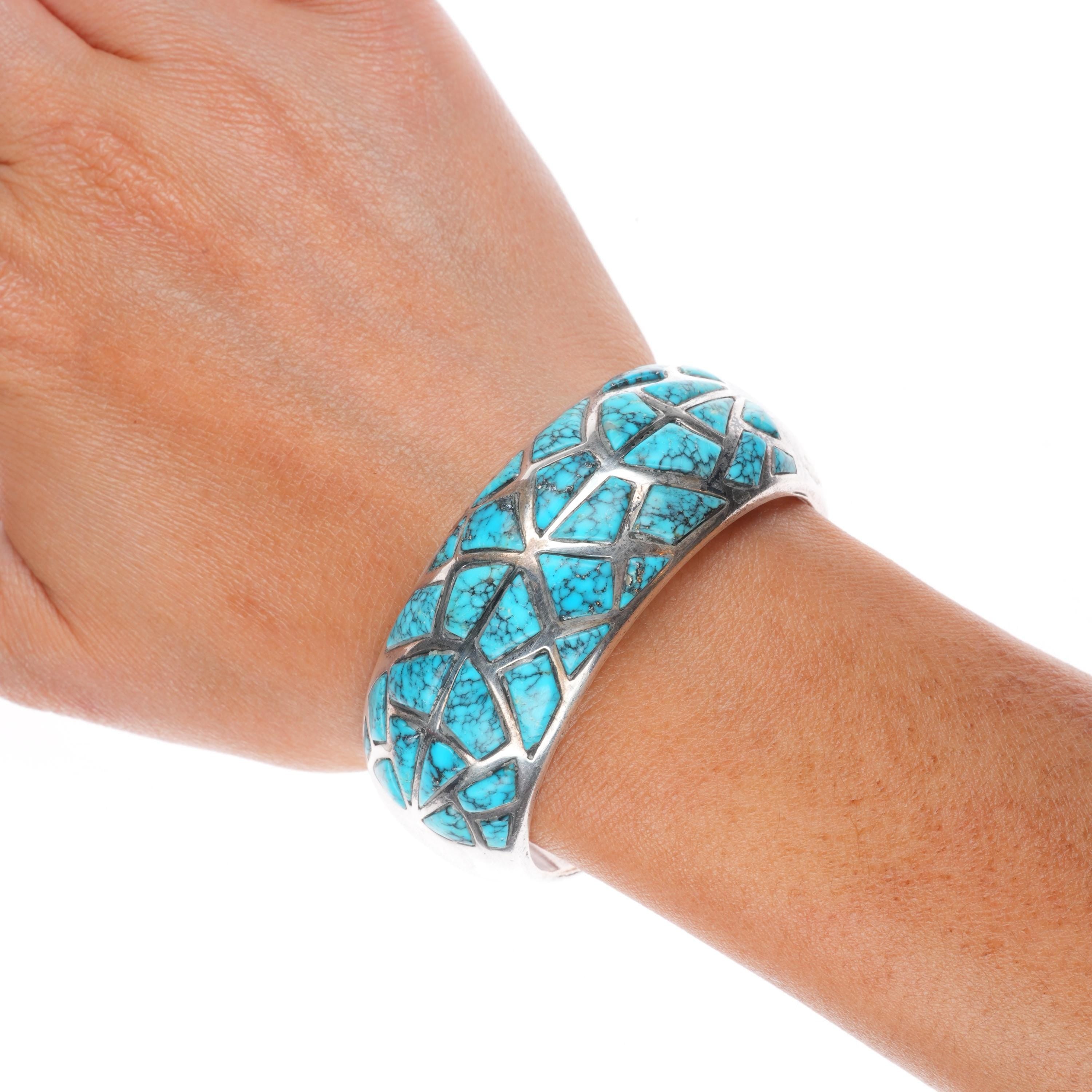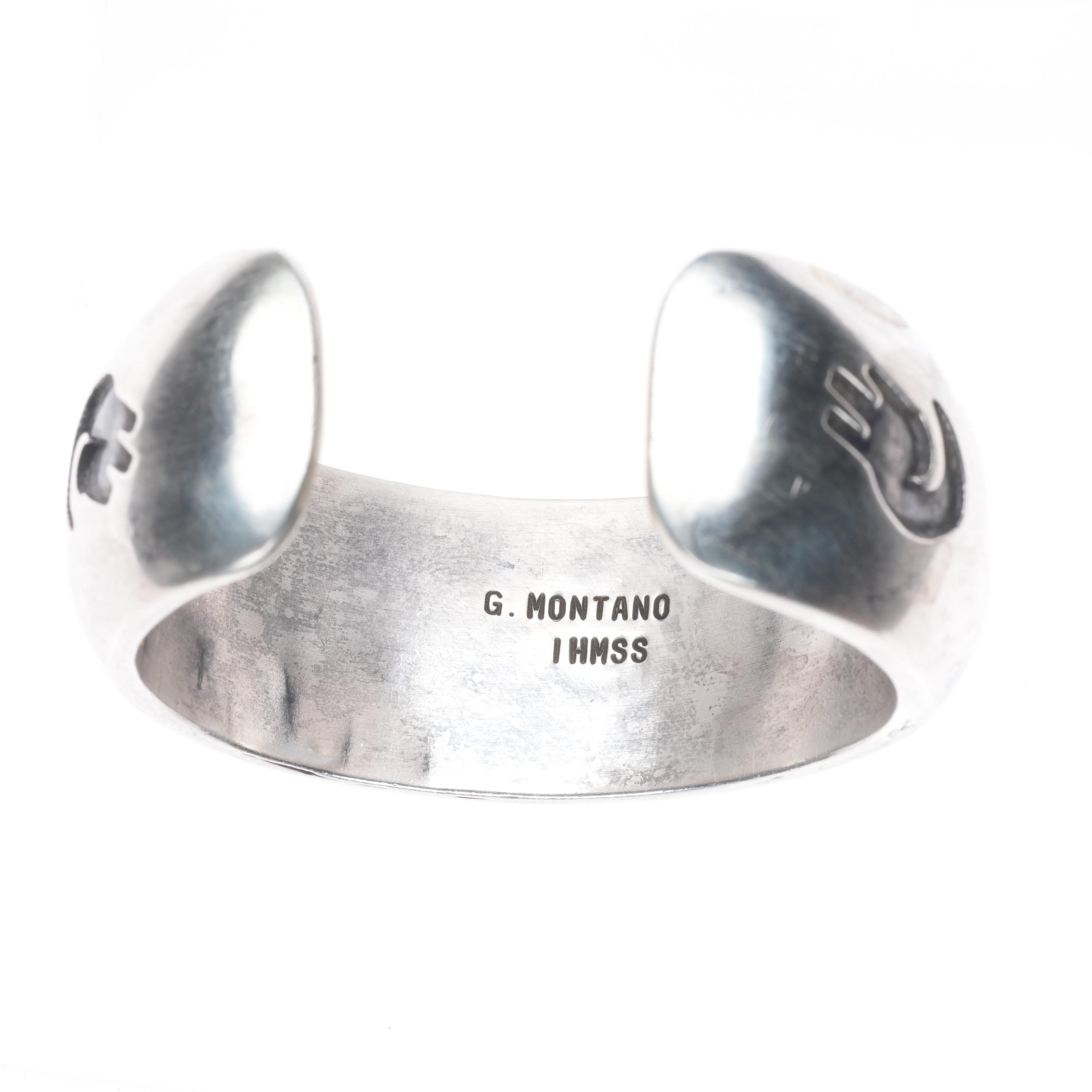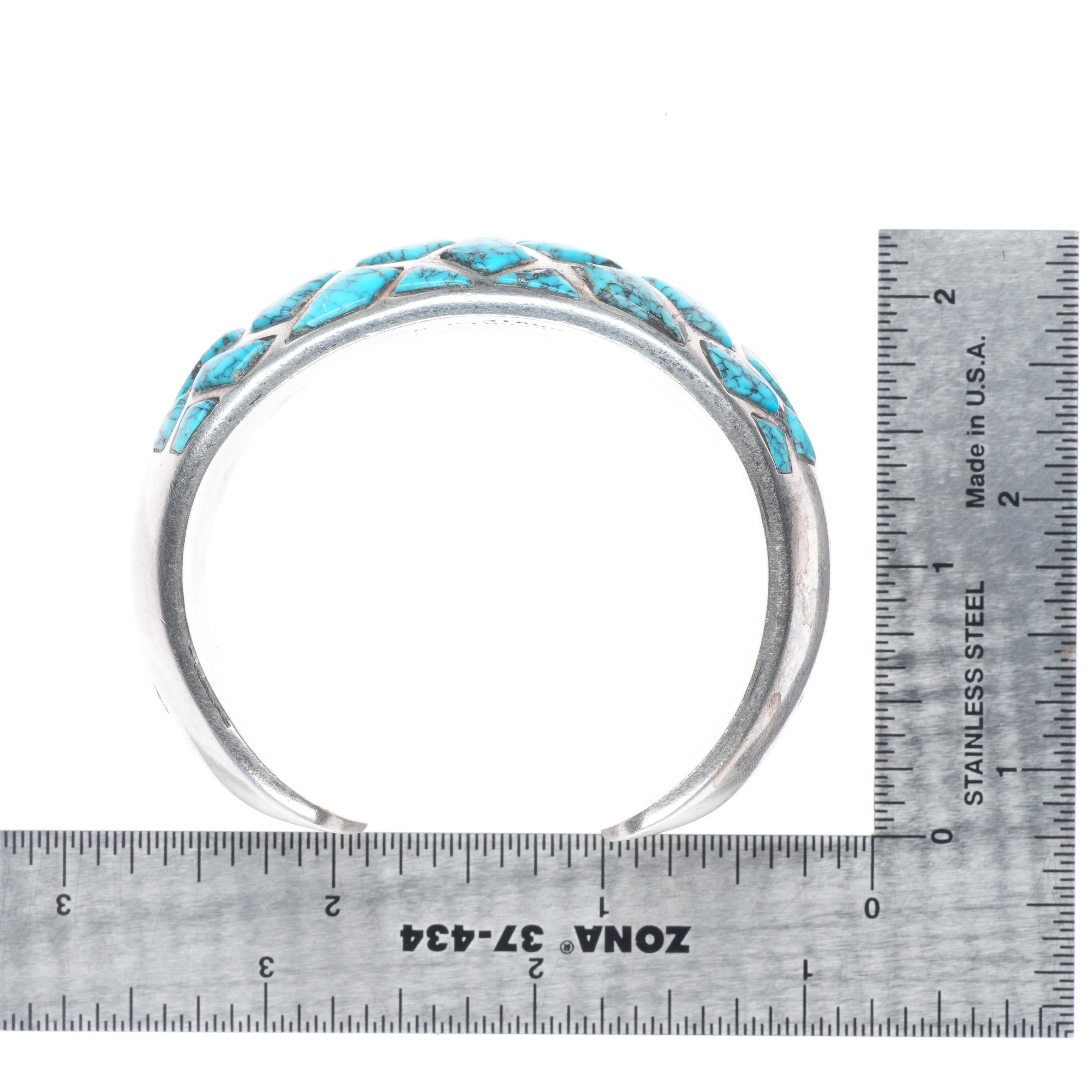 6.1" Gibson Montano Navajo sterling silver spiderweb turquoise inlay cuff bracelet. Tested and guaranteed solid sterling silver with weight and measurements in pictures. Circa third quarter of the 20th century with age appropriate wear..
